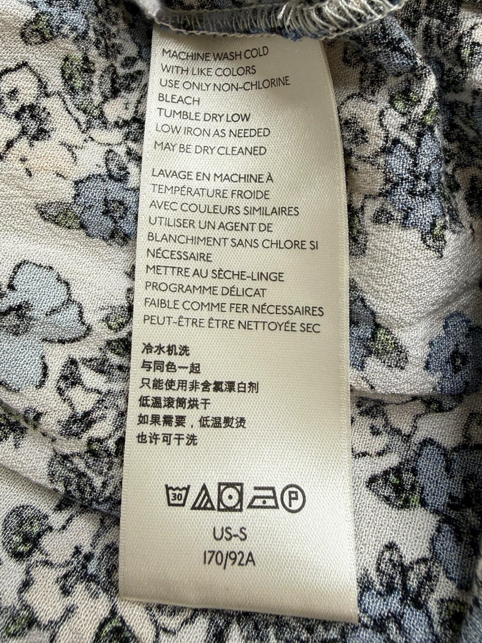 White & blue floral print tunic with long sleeves, mock neck, smocked detailing and a high low hemline.