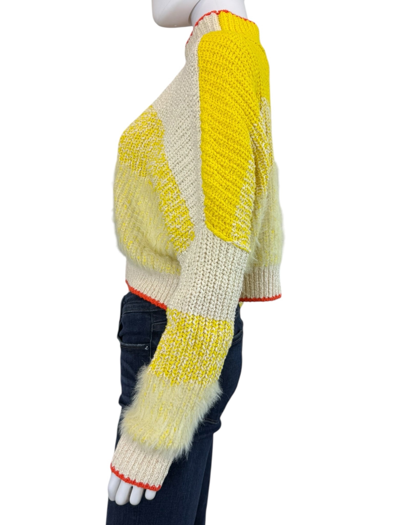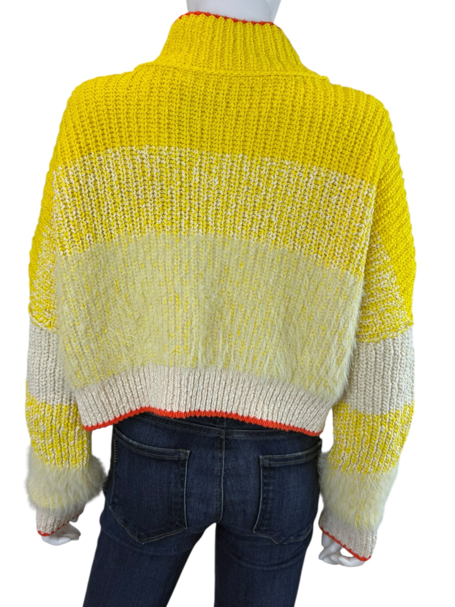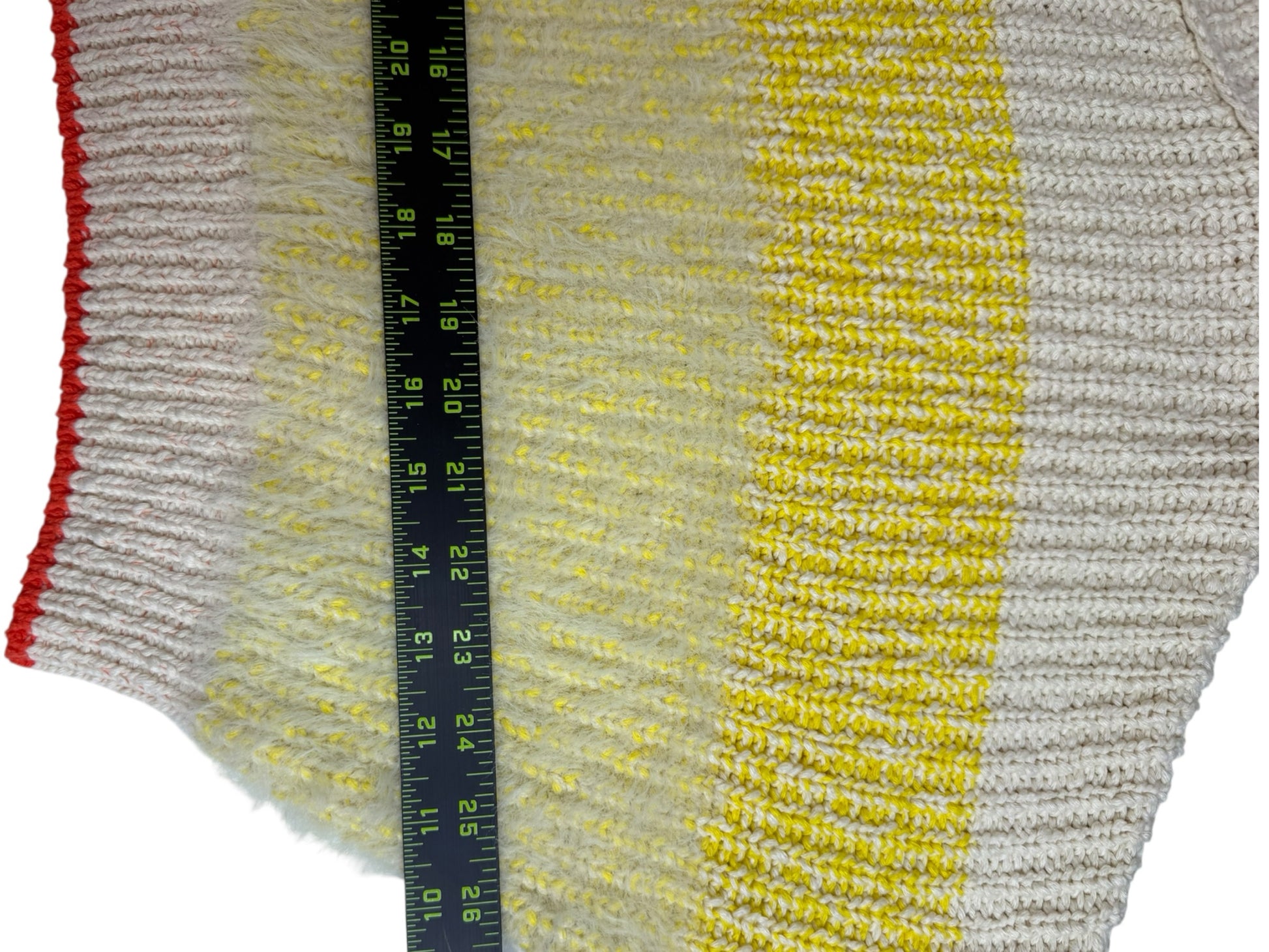 Crochet white and yellow fuzzy mock neck with bright orange trim.