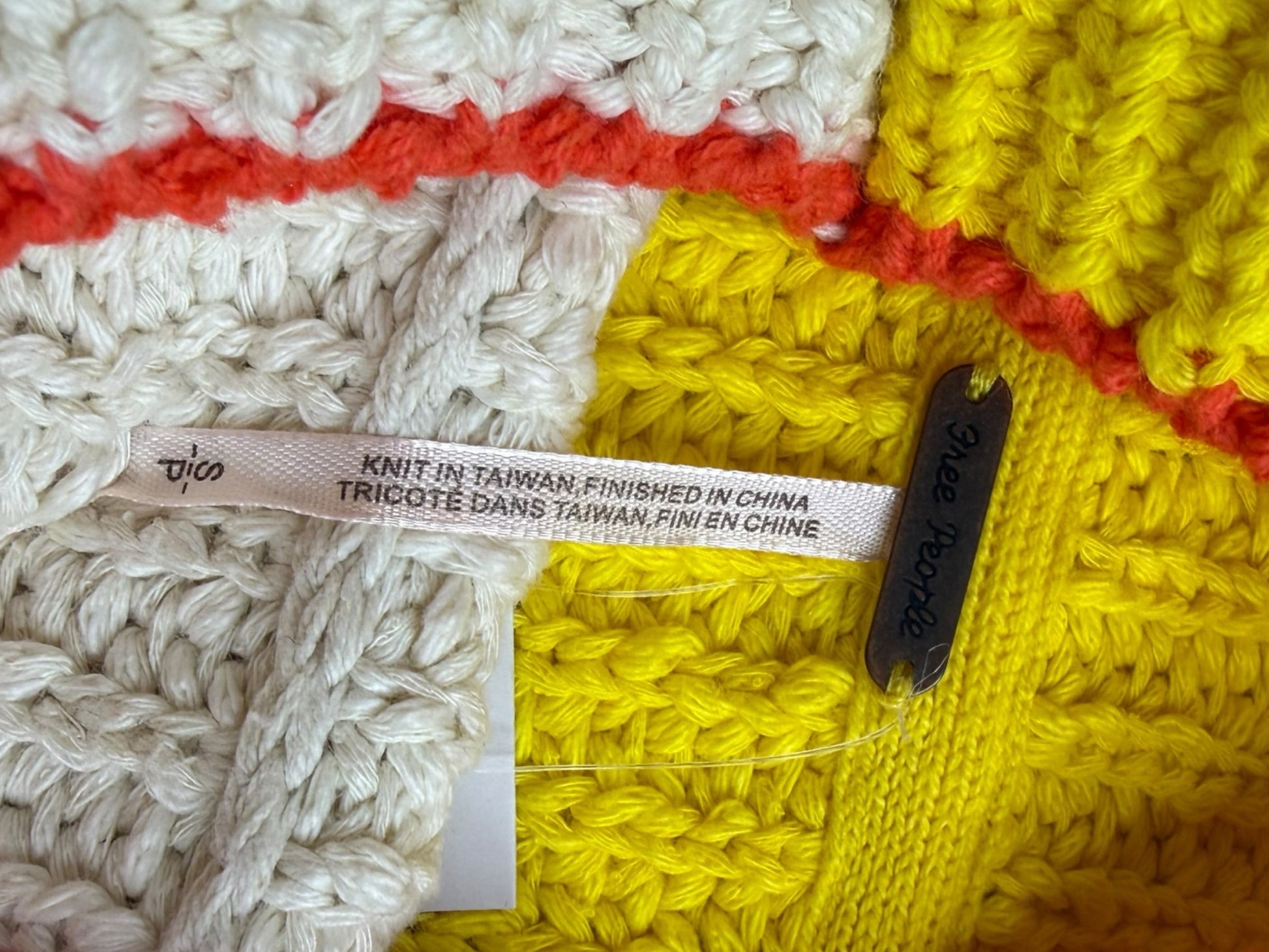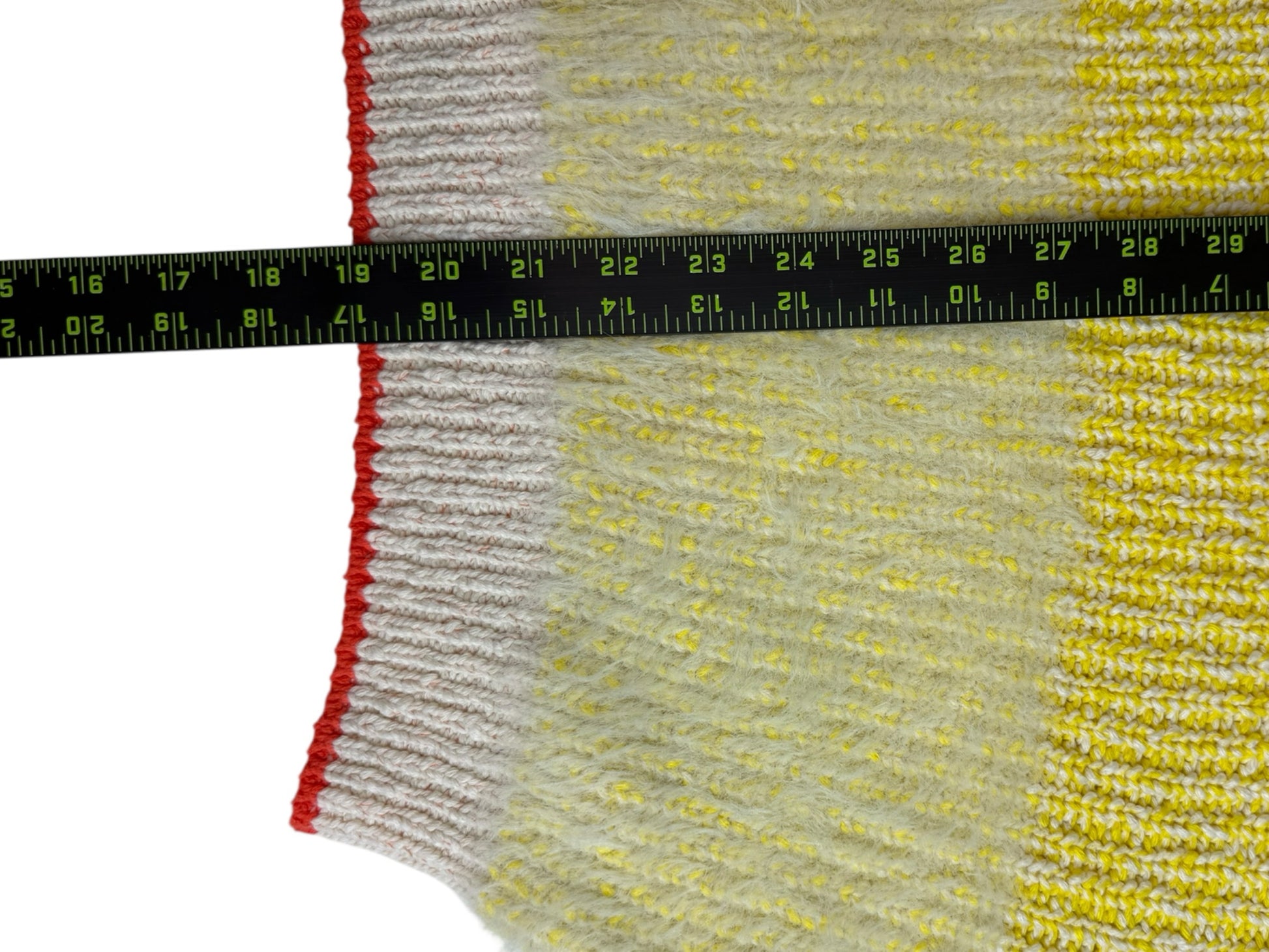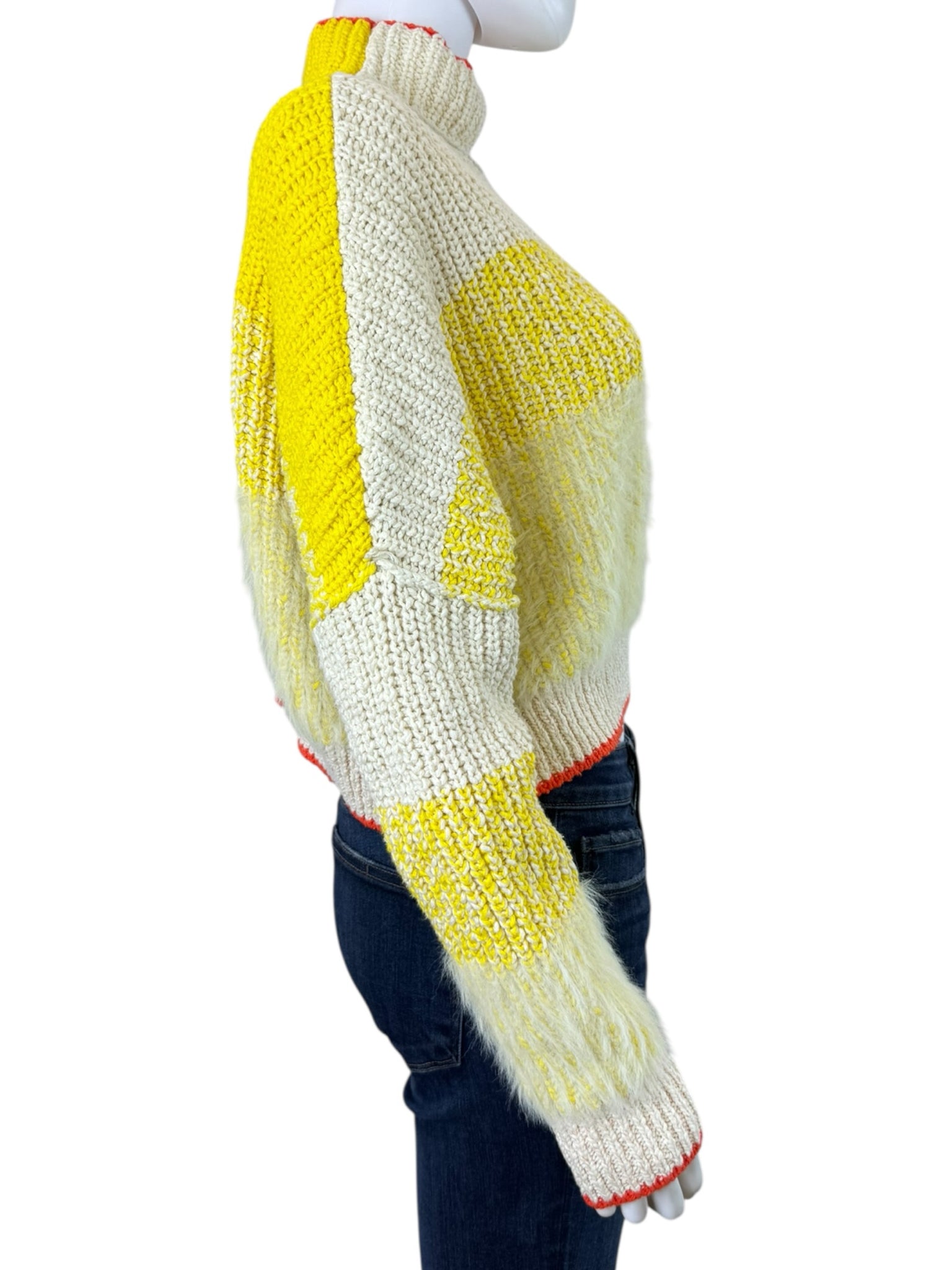 Crochet white and yellow fuzzy mock neck with bright orange trim.