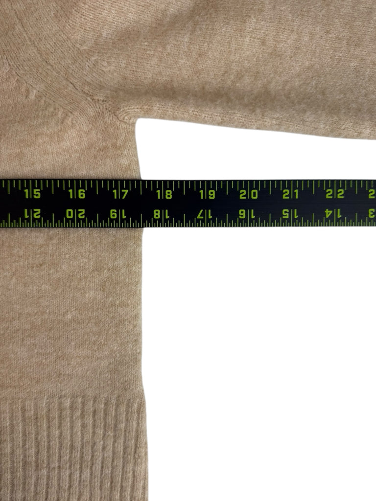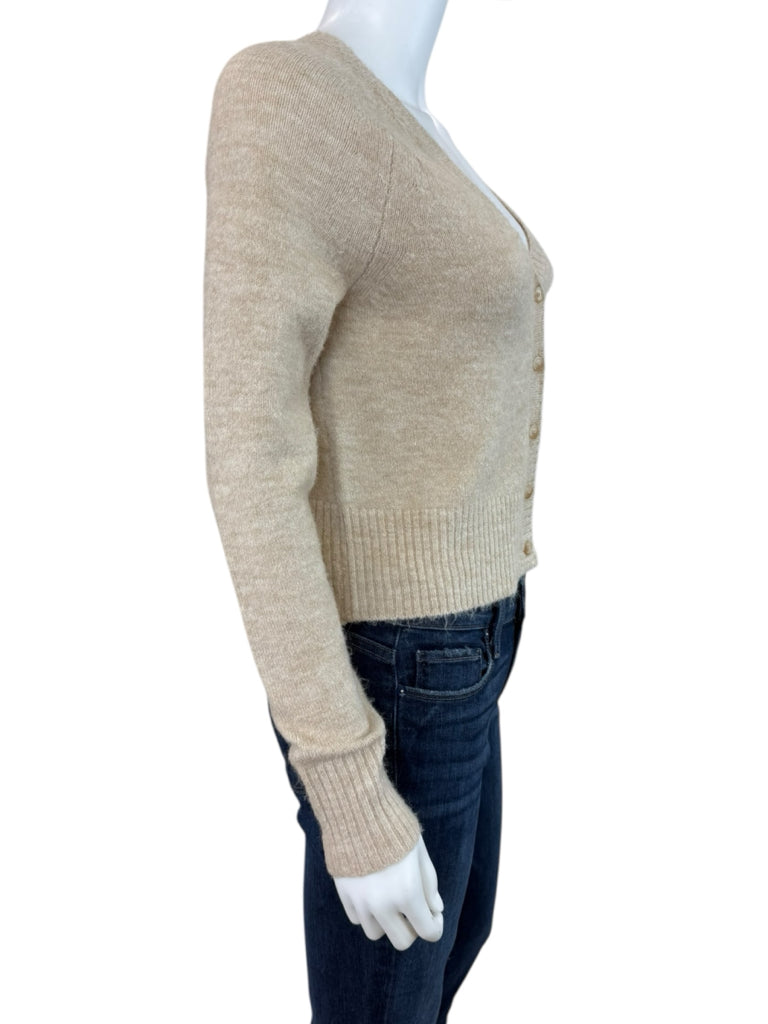 Beige V-neck sweater knit cardigan with long sleeves and front button closure.