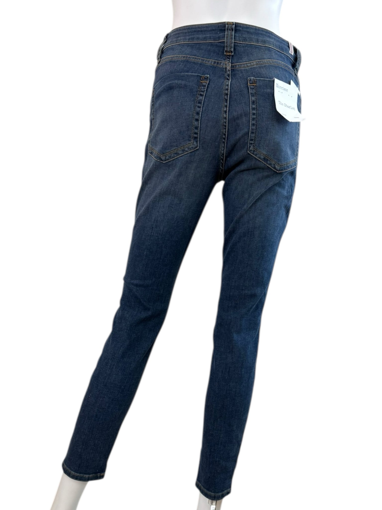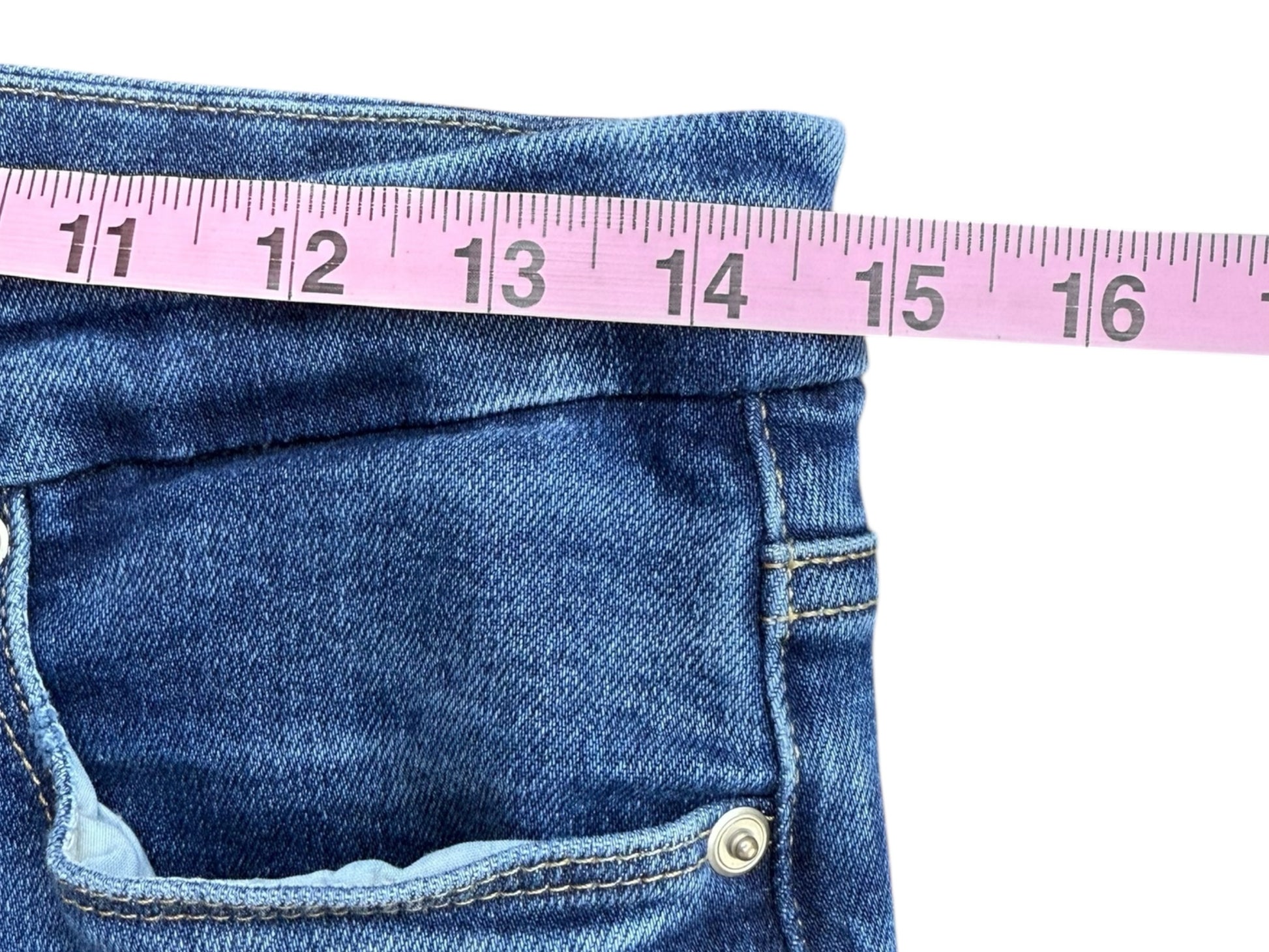 Medium wash high waisted straight leg denim jeans with a classic 5 pocket design and a front zipper and button closure.