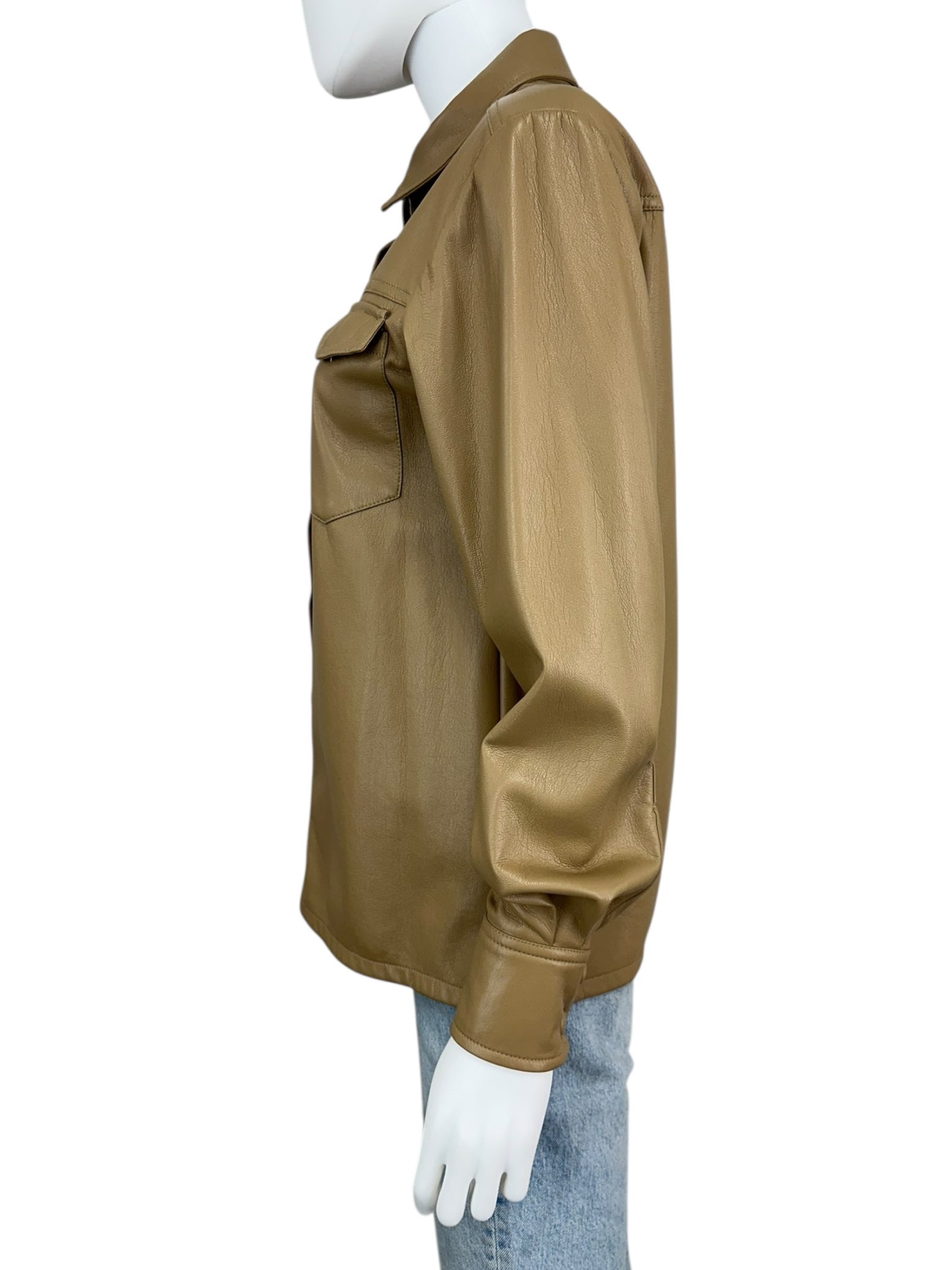 Tan pleather long sleeve front button down jacket with front pockets and collared.