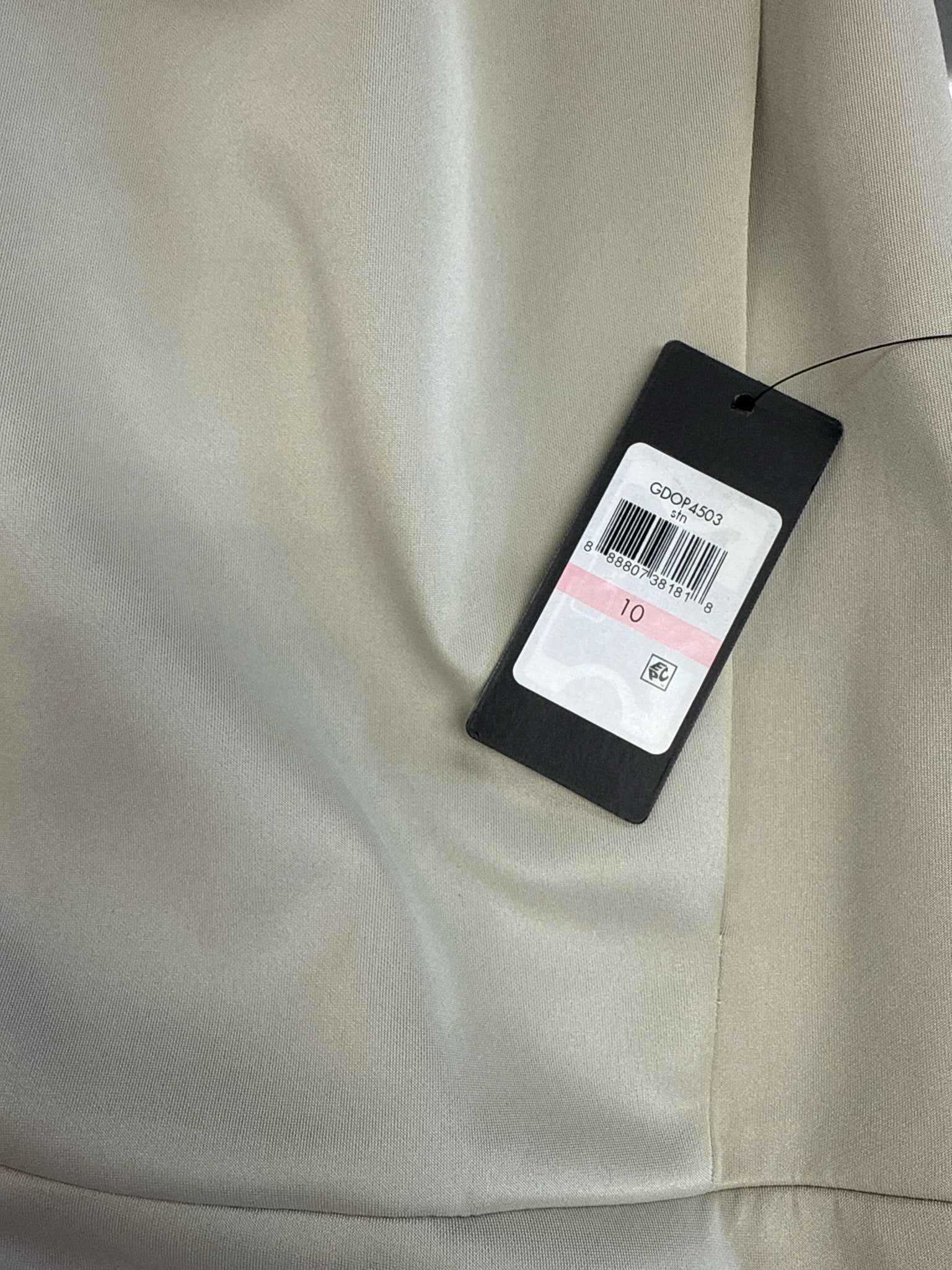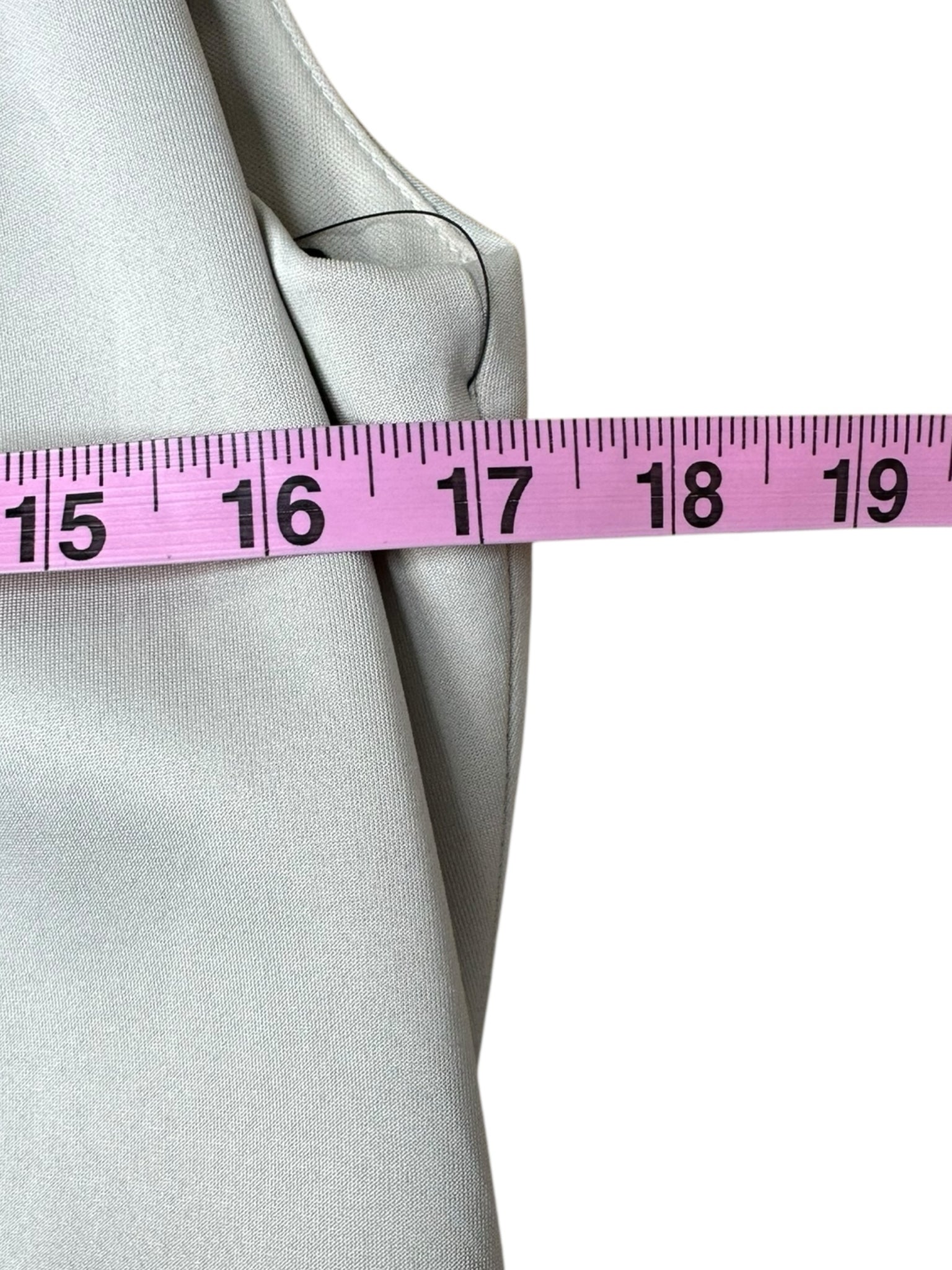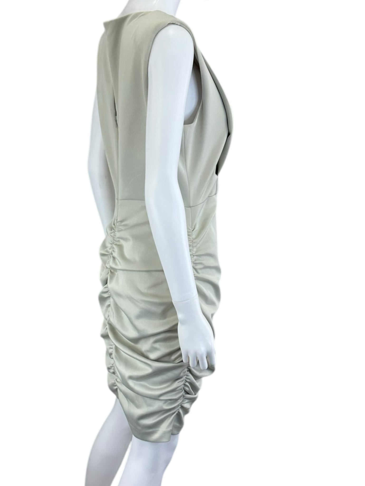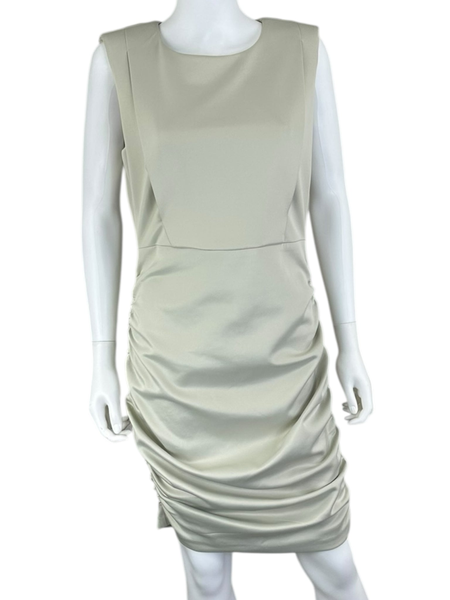 New with tags! Super soft stretch knit sleeveless mini dress with a round neckline, side gathered skirt and a back keyhole opening with hook closure.