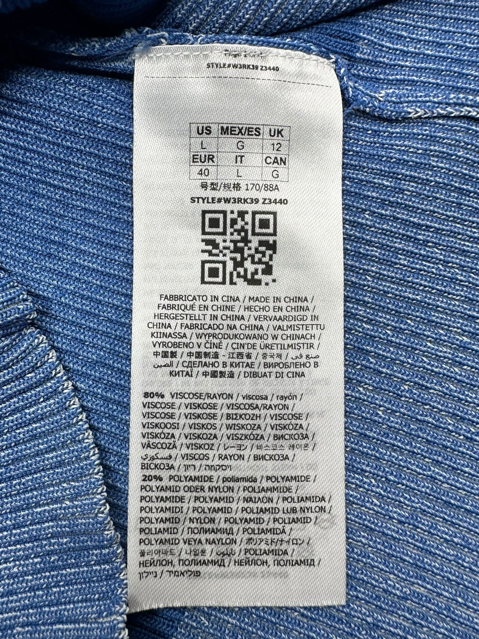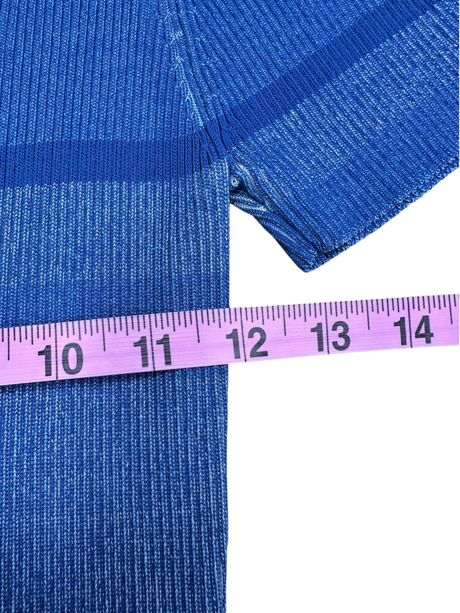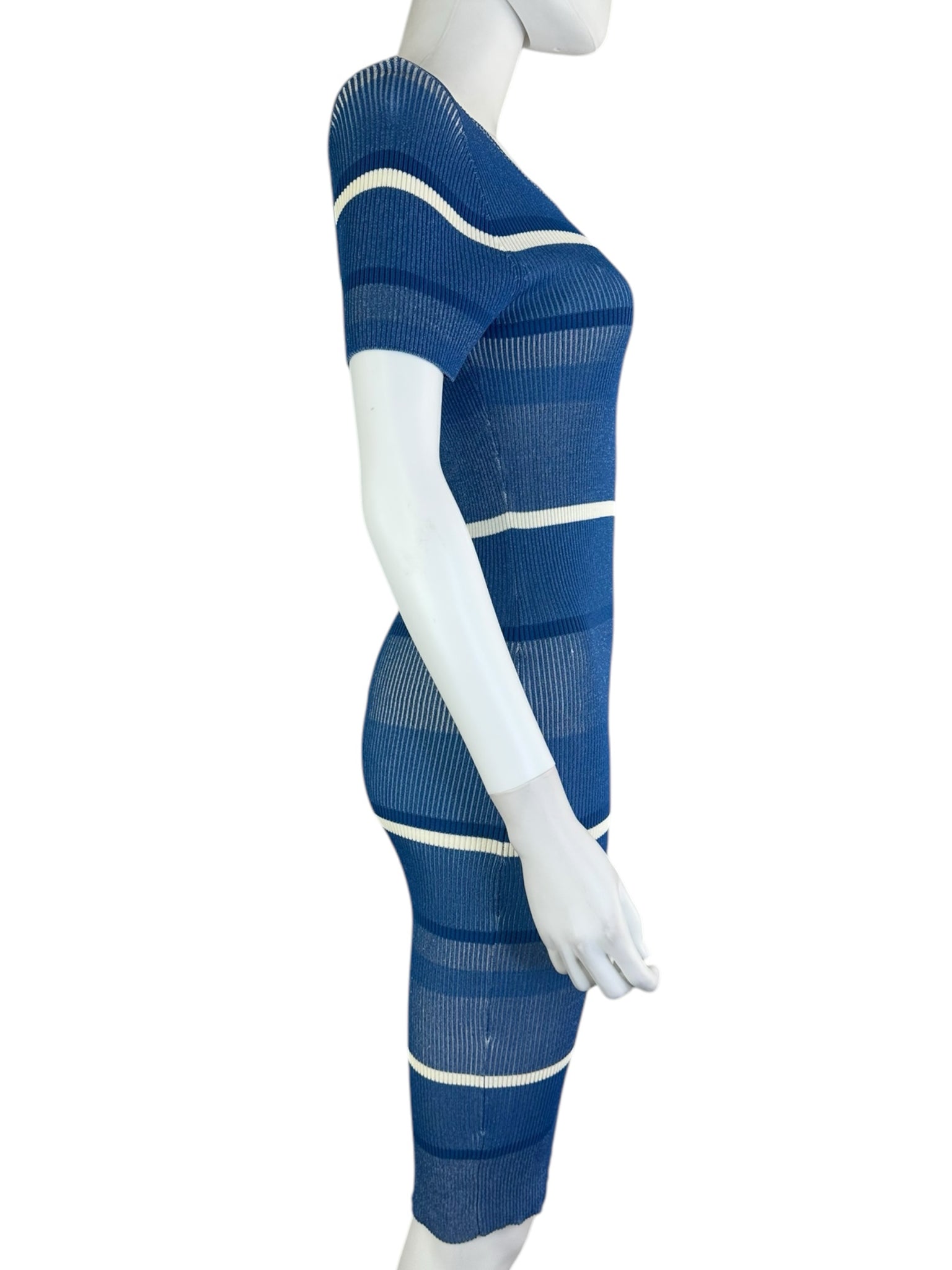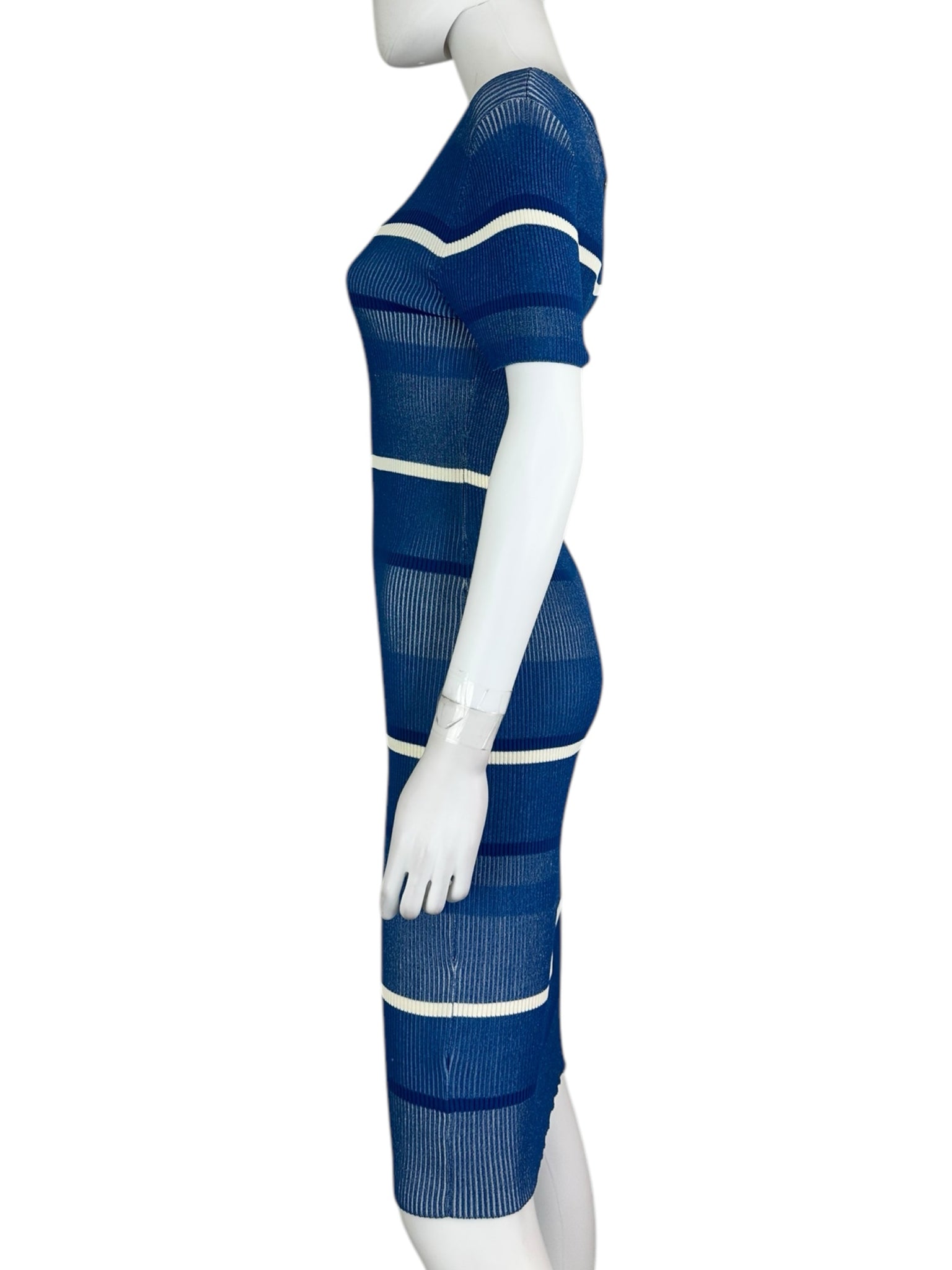 Guess blue and white striped short sleeve sweater knit midi dress featuring round neckline.
