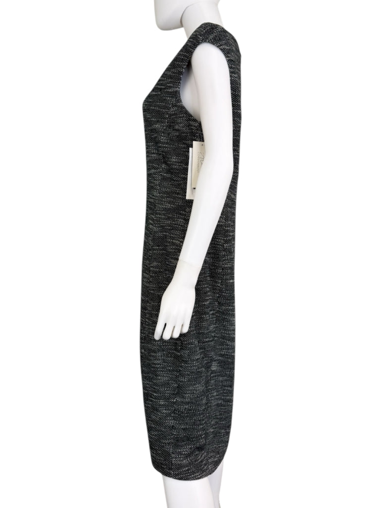 New with tags! Black and white tweed cotton blend sleeveless midi dress with a vneck opening and back zipper/hook closure.