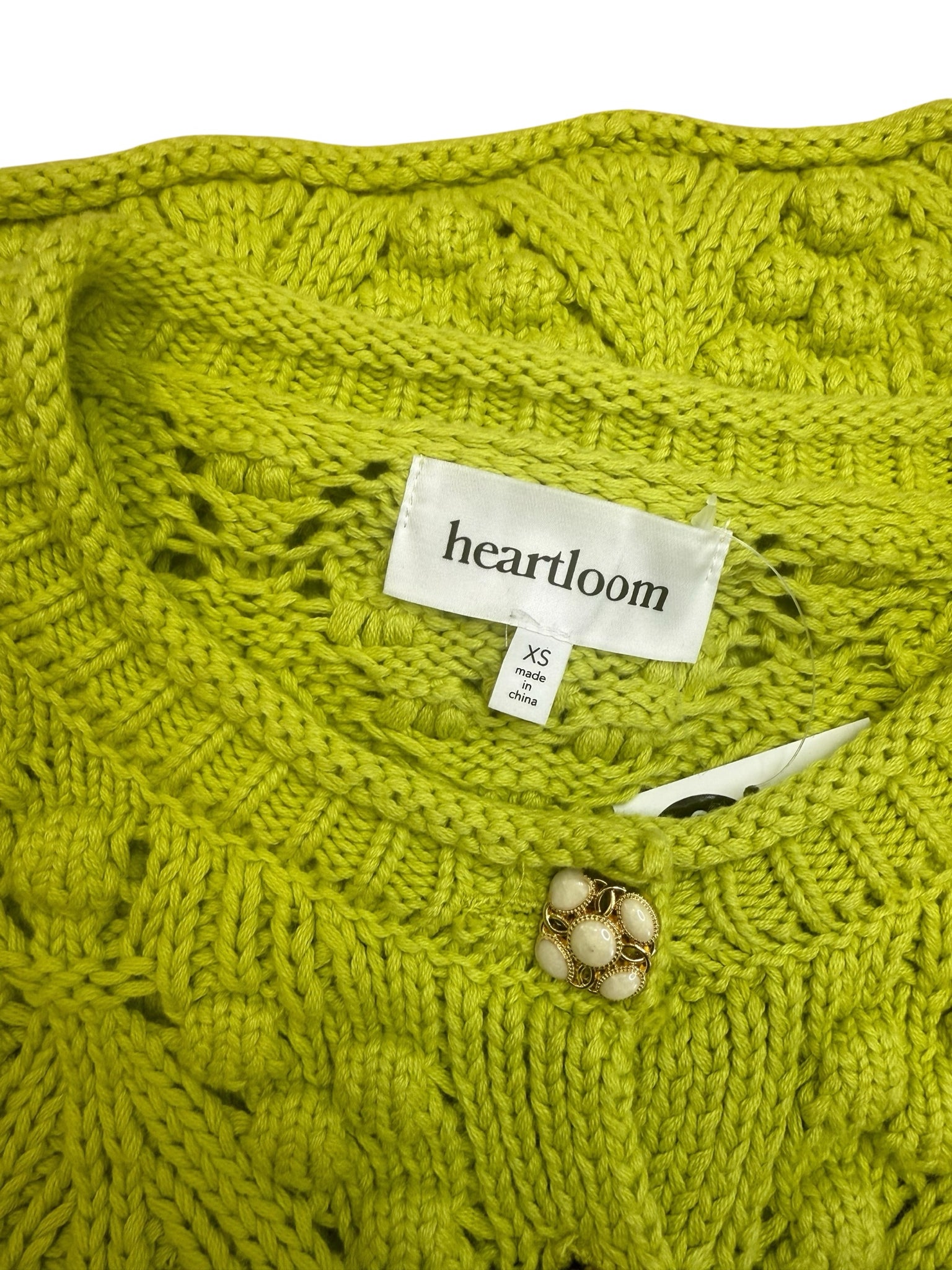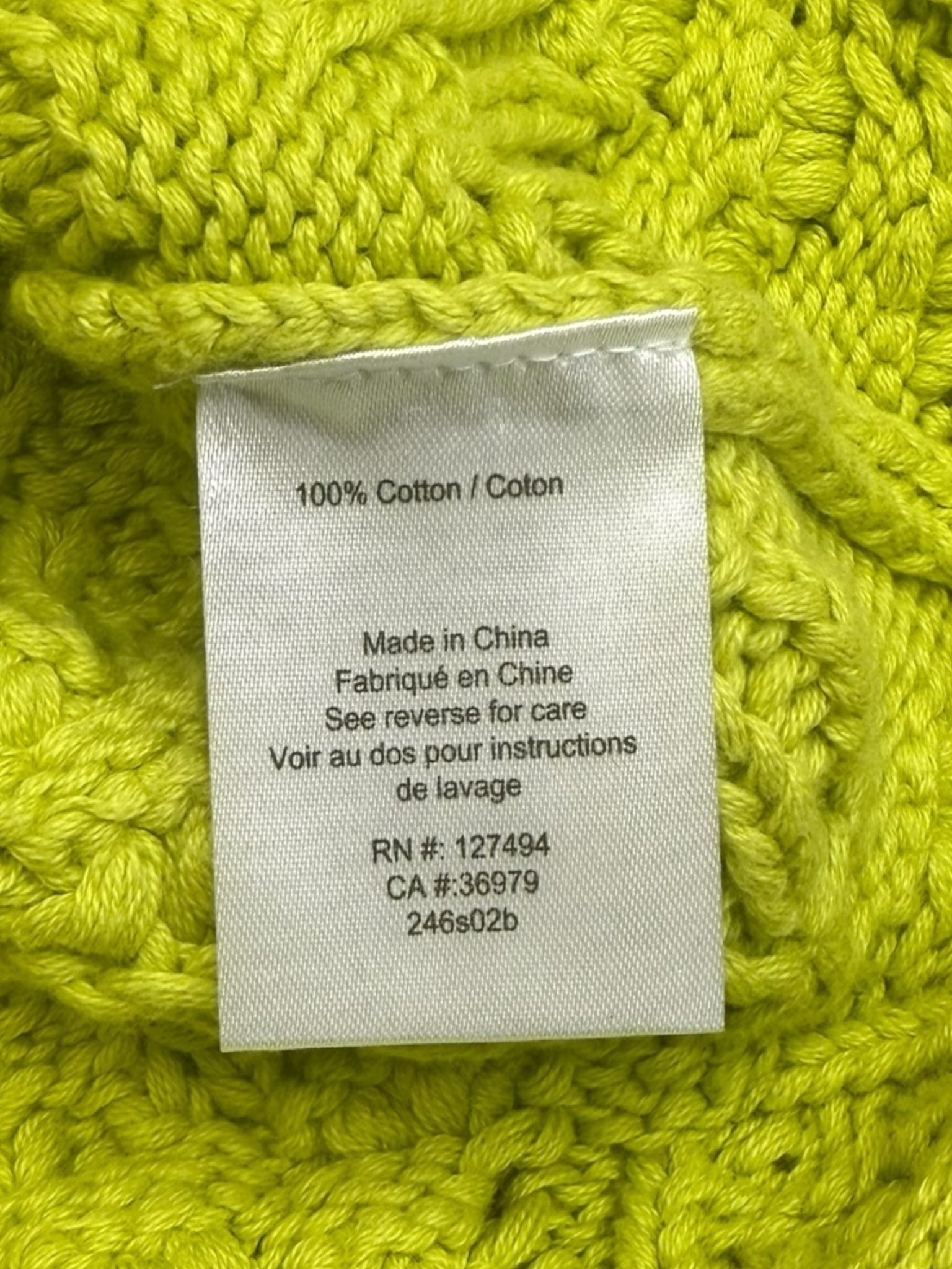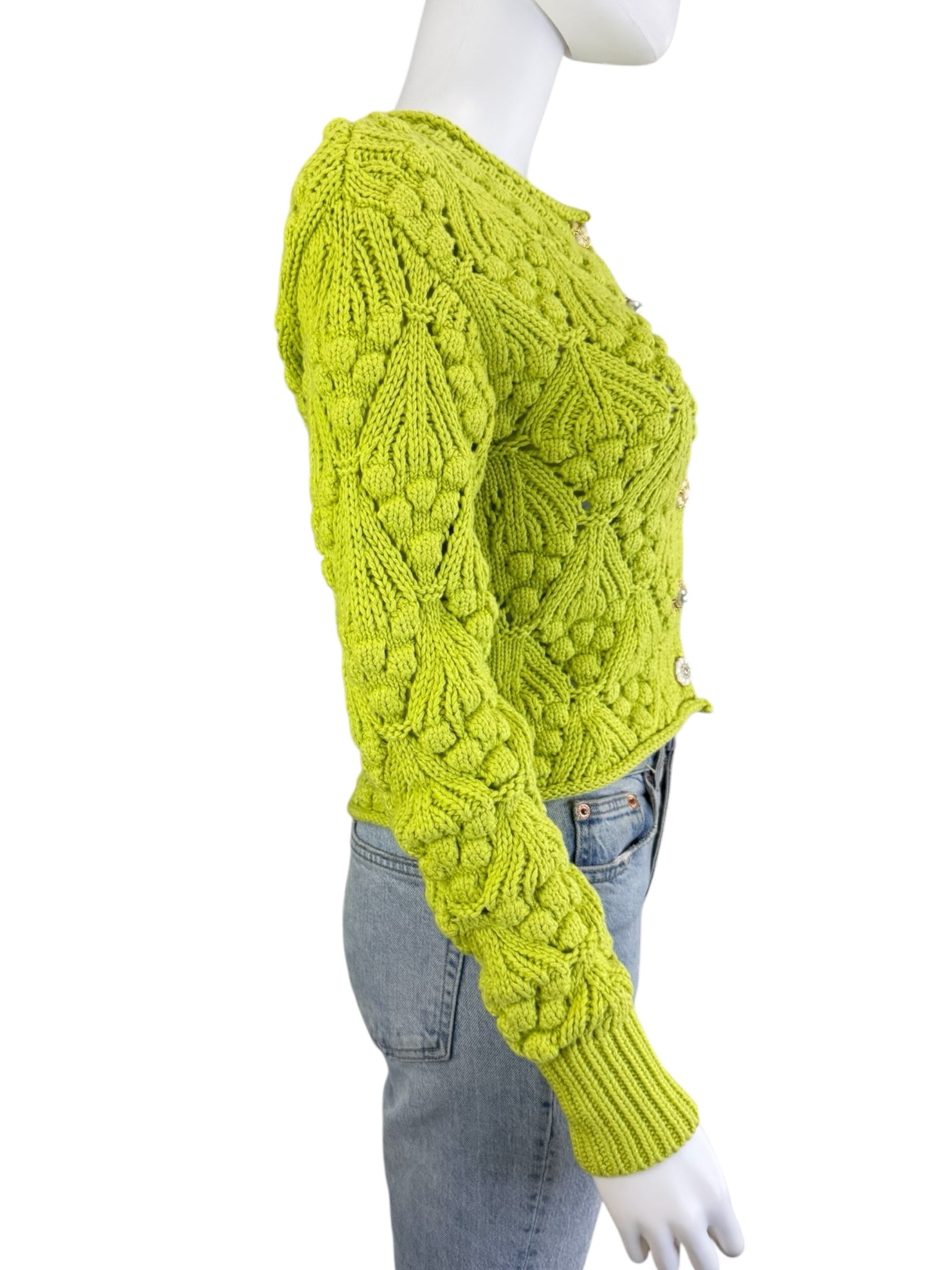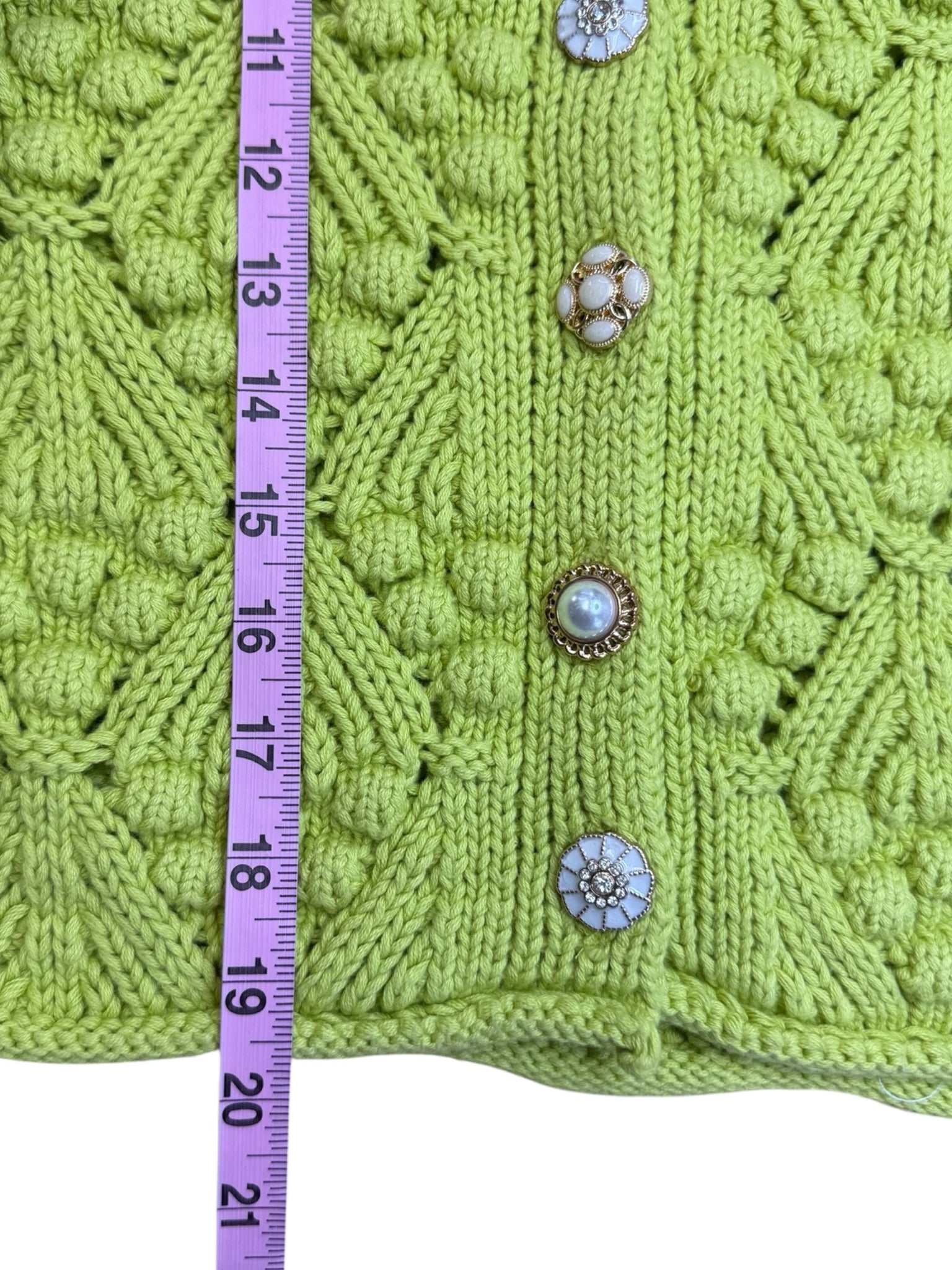 New from local boutique! Green airy popcorn stitch knit sweater cardigan constructed from a soft 100% cotton chunky yarn. Cardigan has long sleeves and a button front closure.