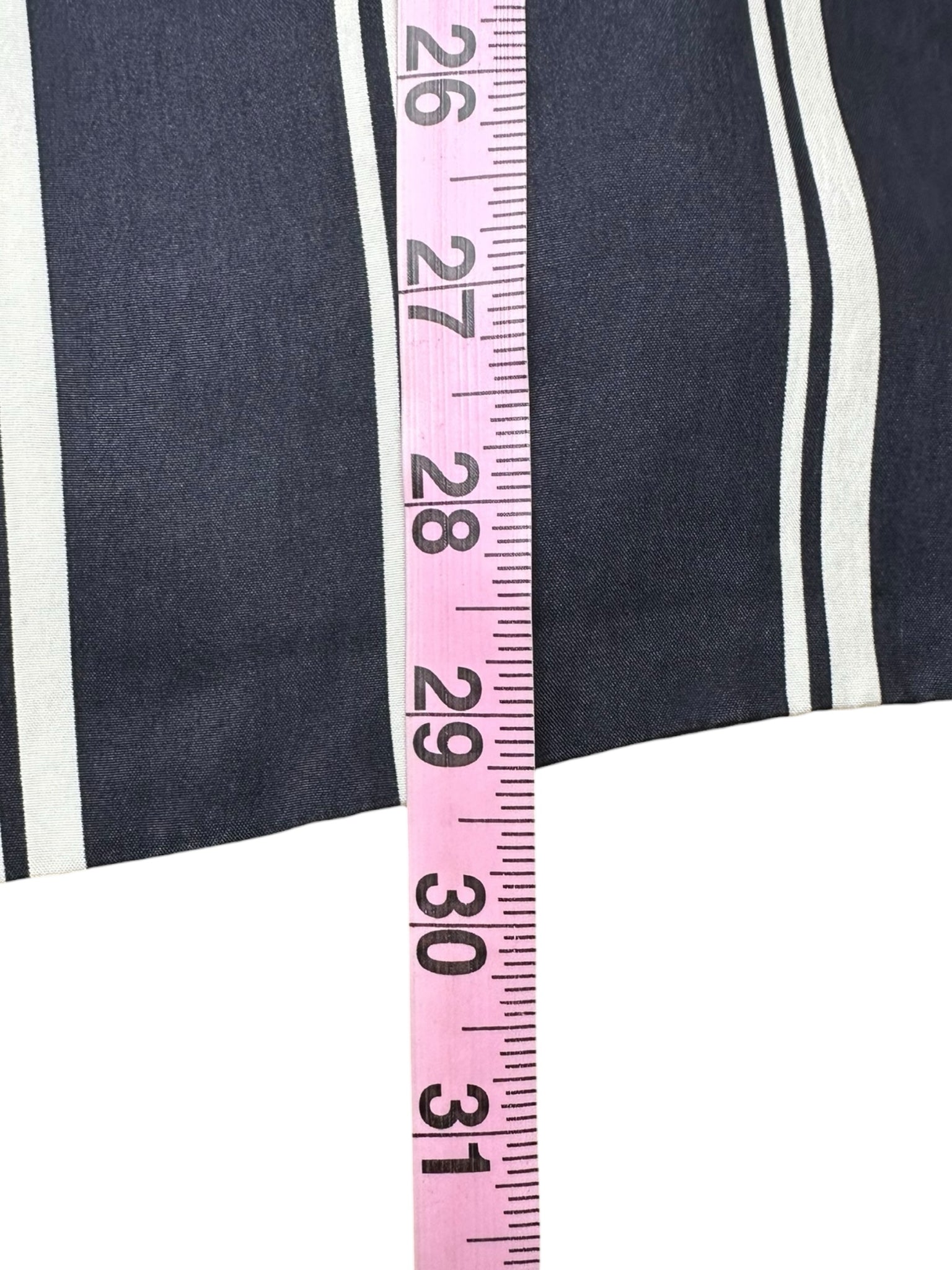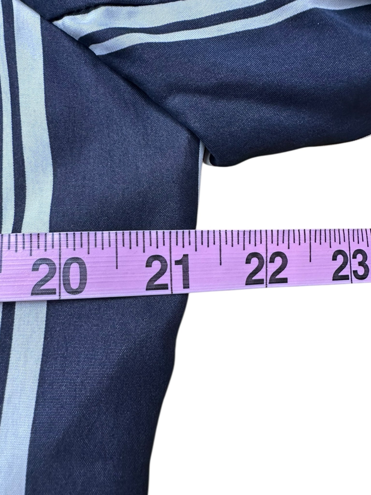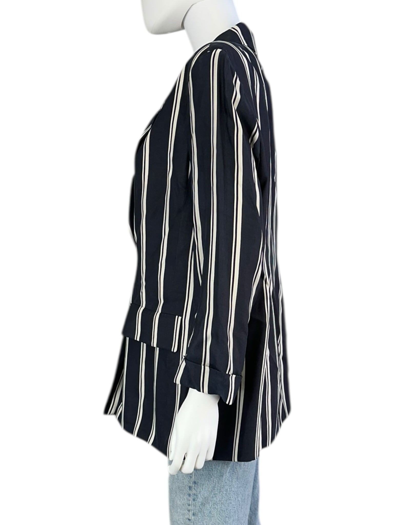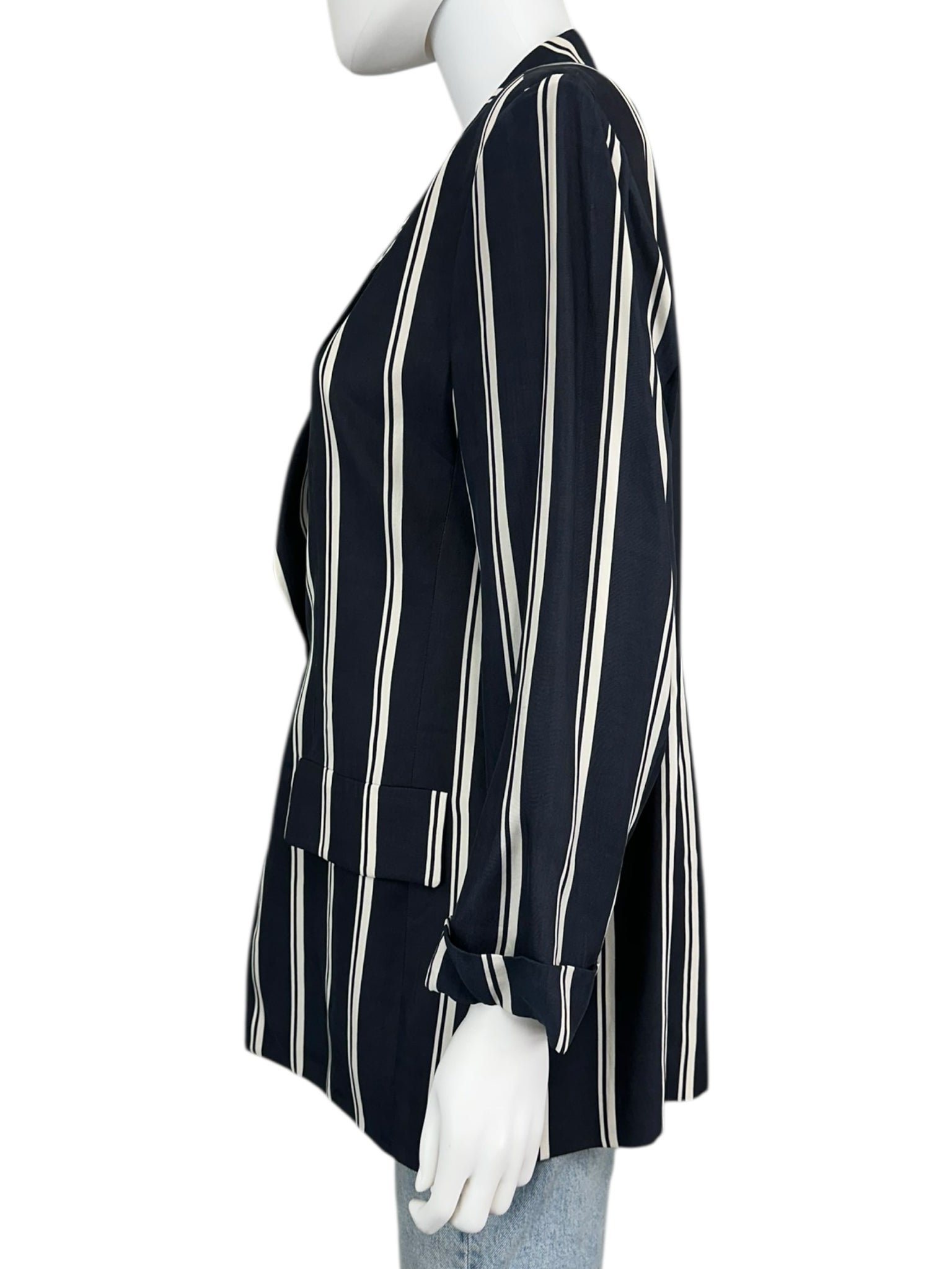 Navy blue and cream striped notched collar blazer with long sleeves, front pockets and a single front button closure.