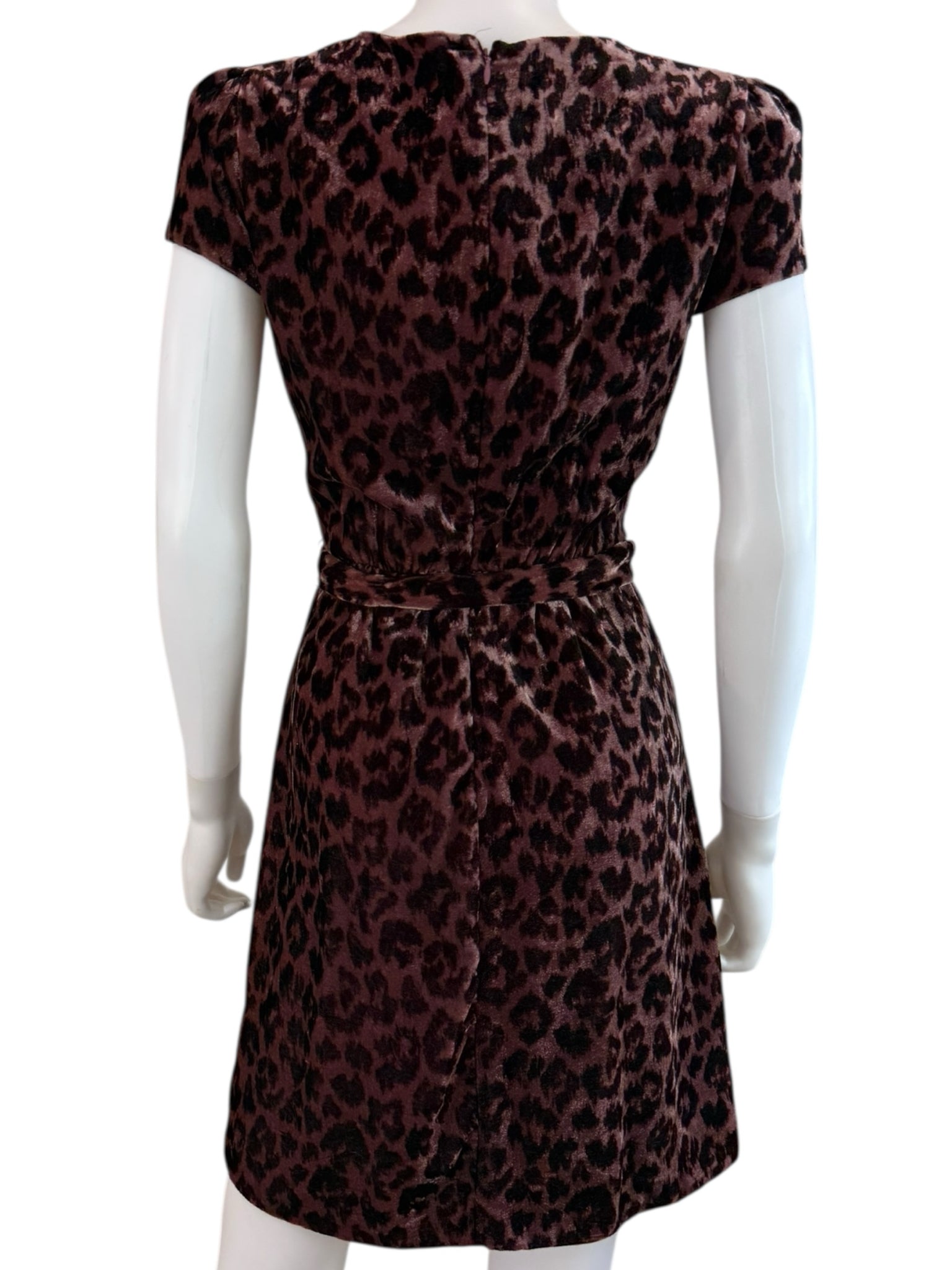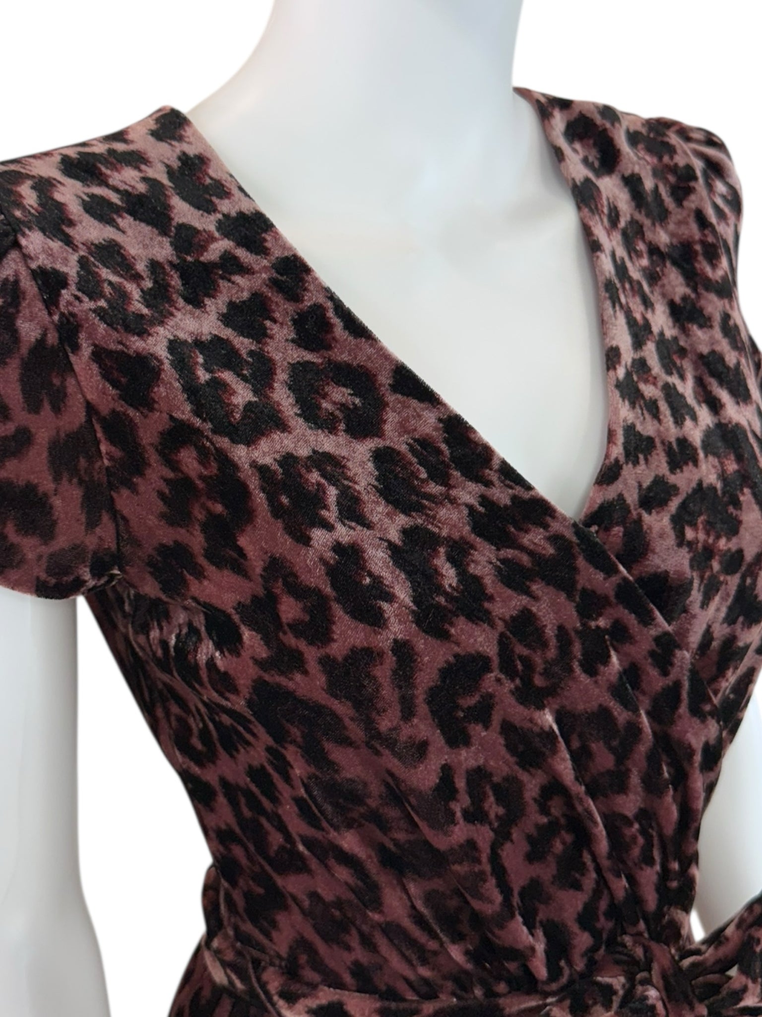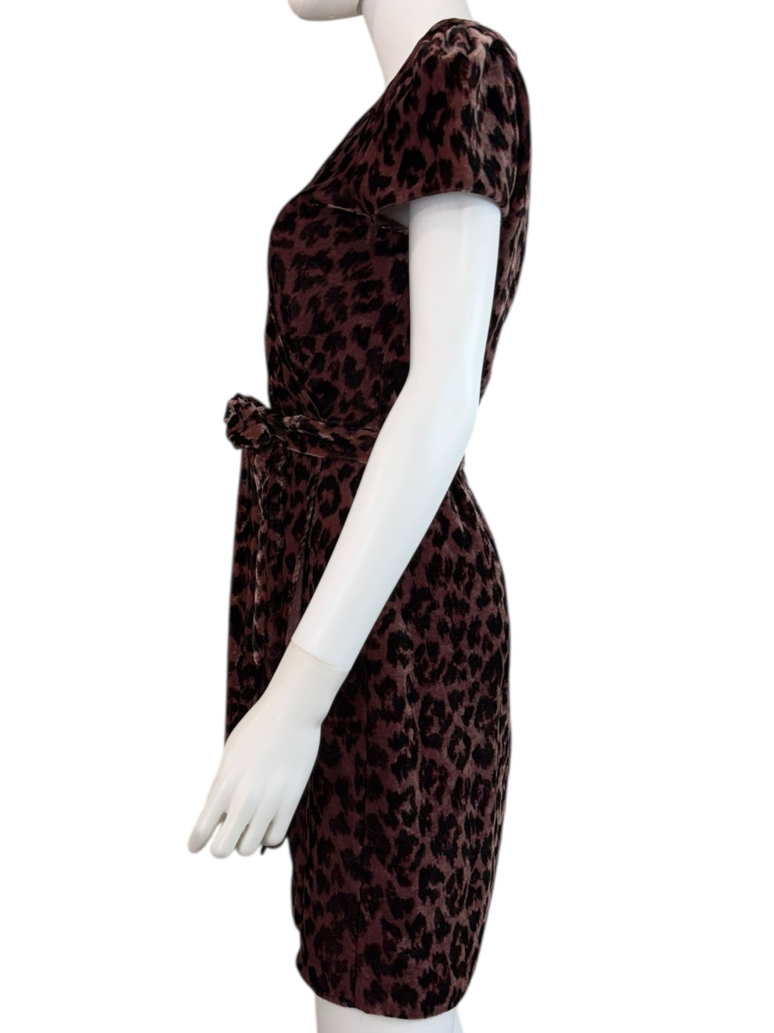 Super soft and comfy faux wrap mini dress in rose leopard. Dress has short puff sleeves, back zipper closure and a belted tie waist.