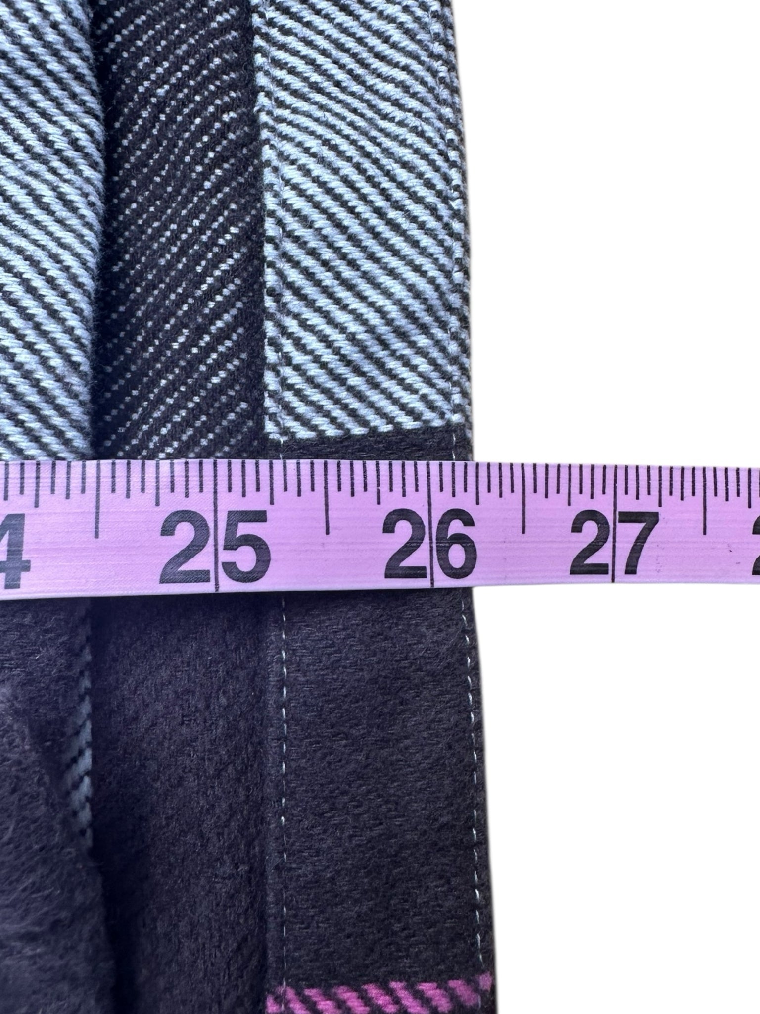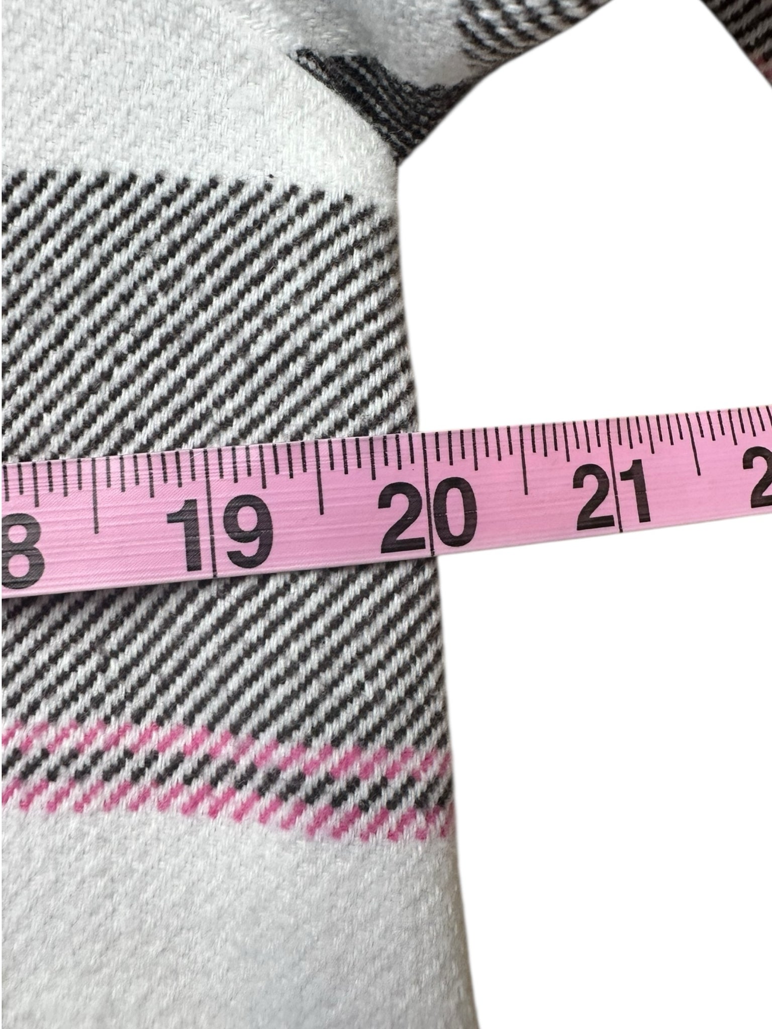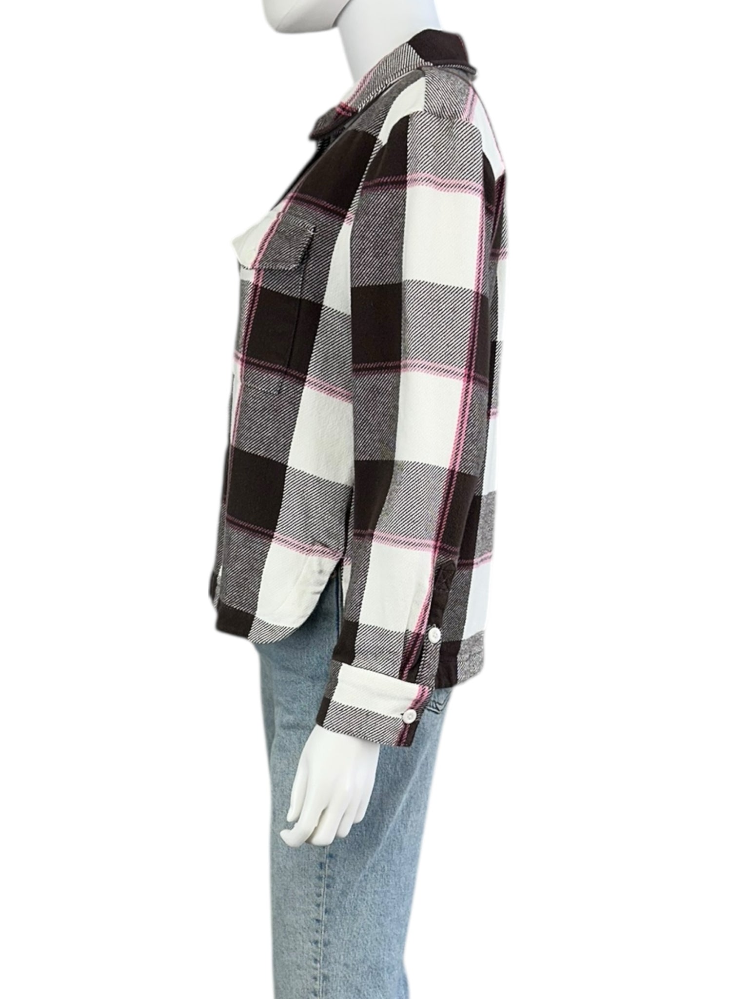 100% cotton brown, white & pink plaid fleece collared button-down with long button cuff sleeves, two chest pockets and a front button closure.