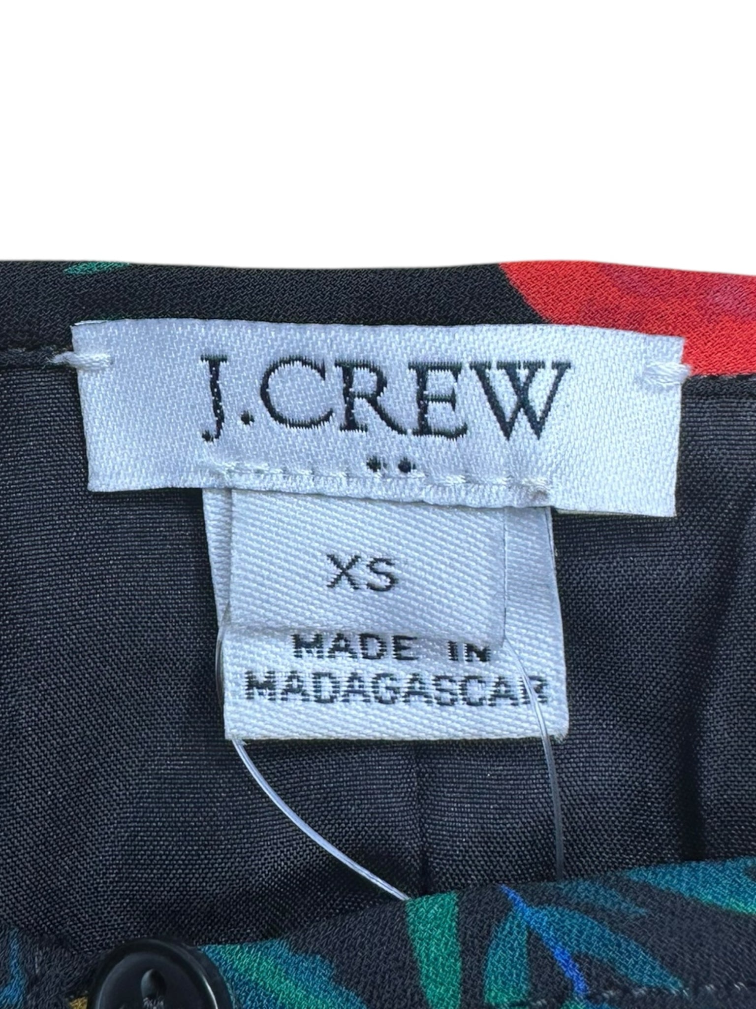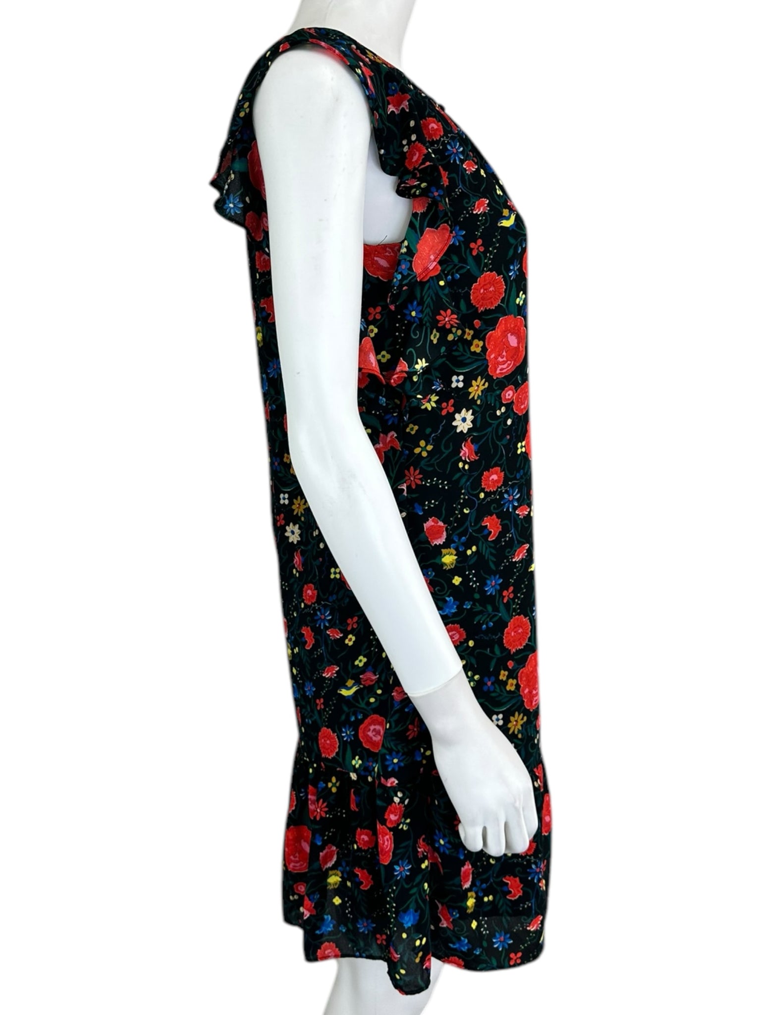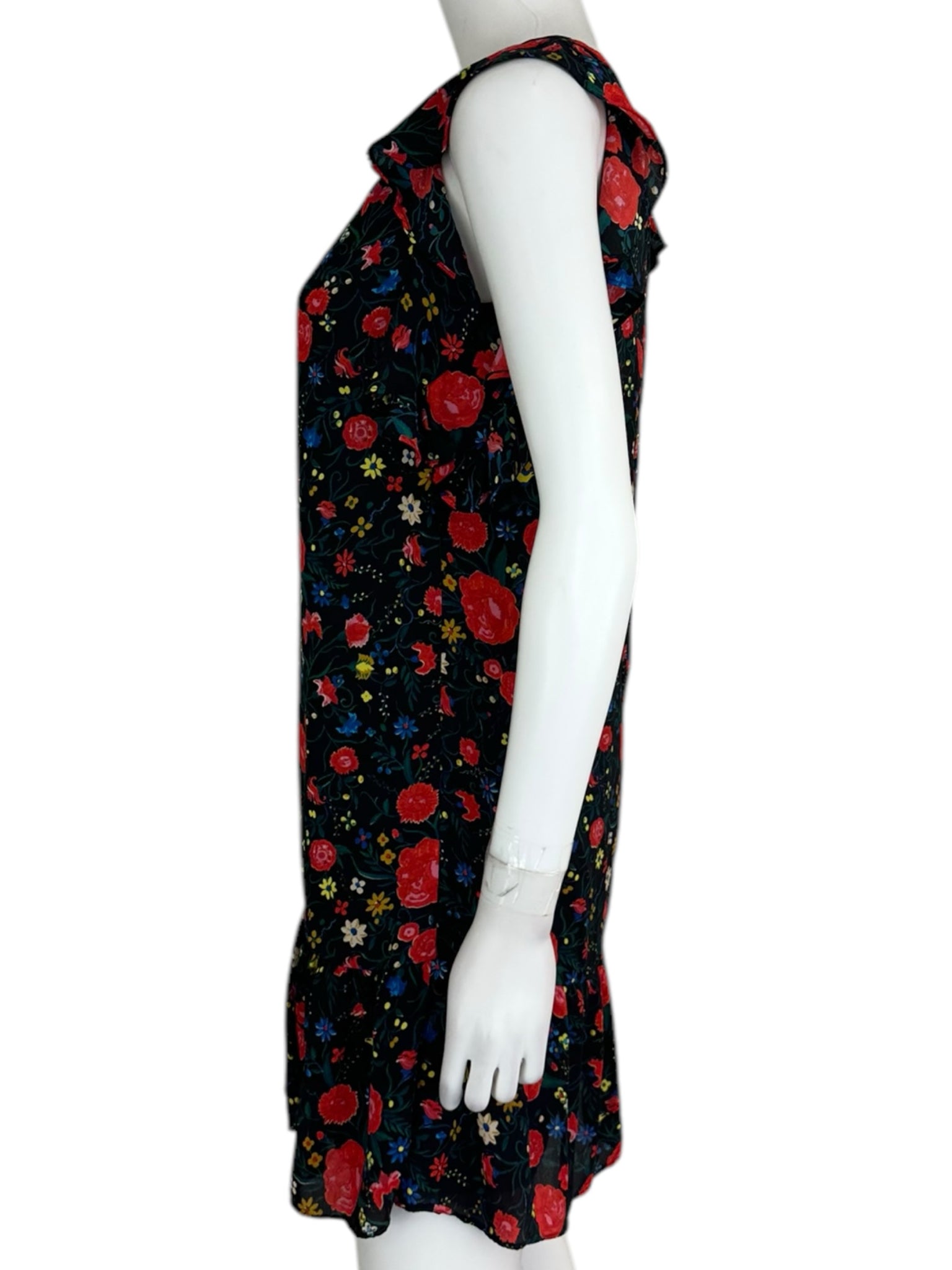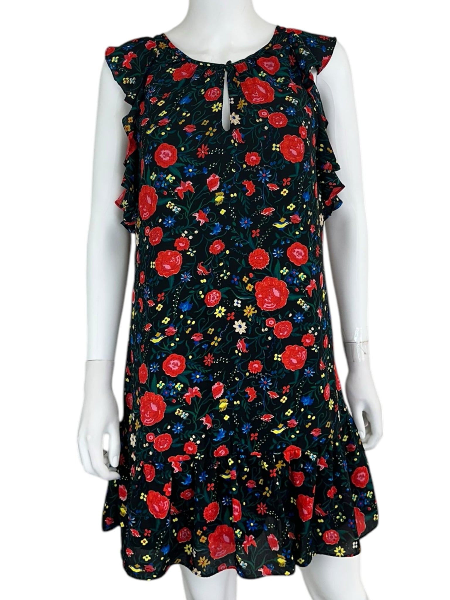 Black with red/blue/yellow/green floral mini dress with ruffle short sleeves and front keyhole opening with button closure. Dress is lined and has a ruffle hemline.