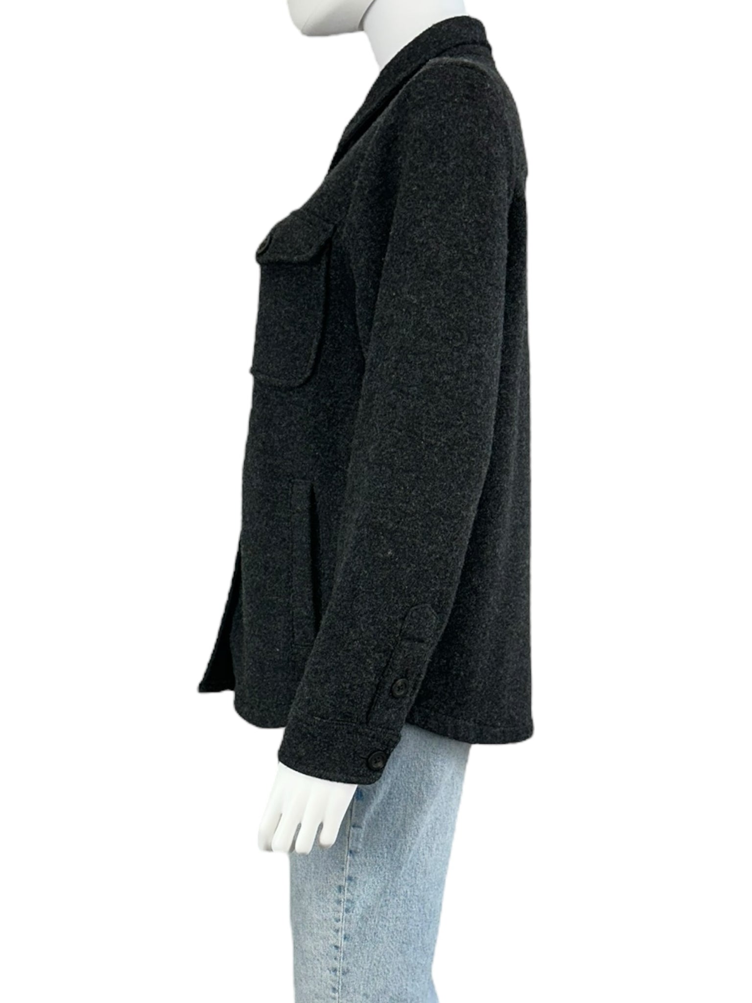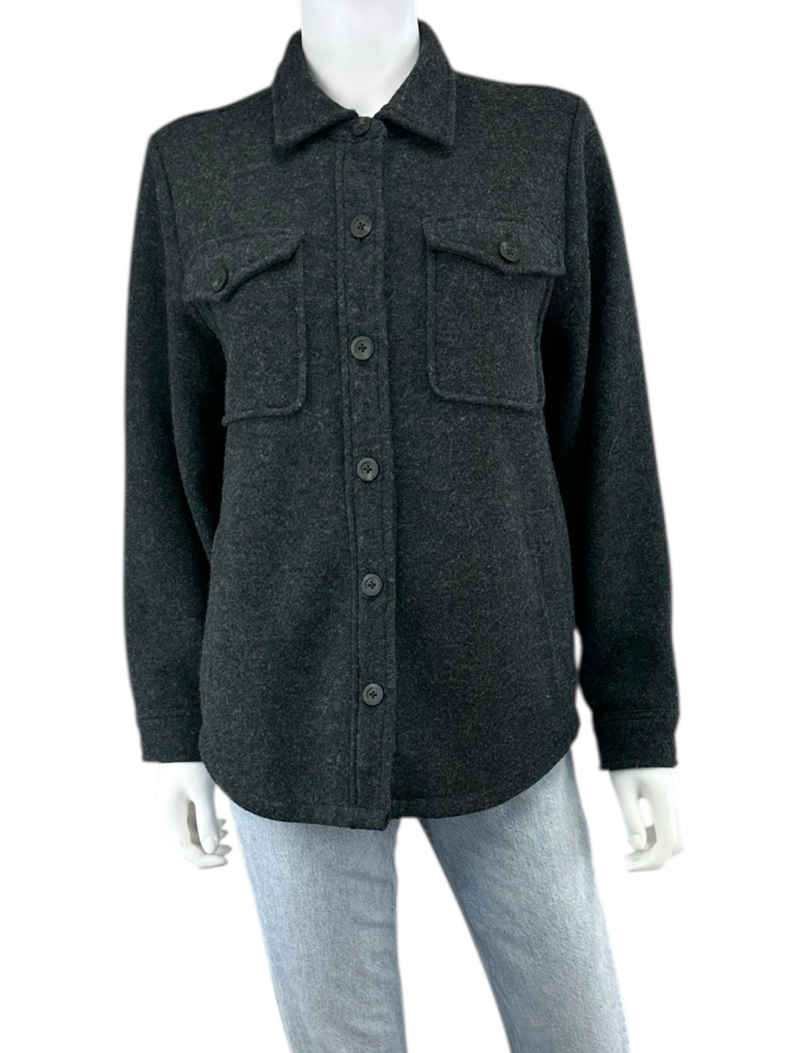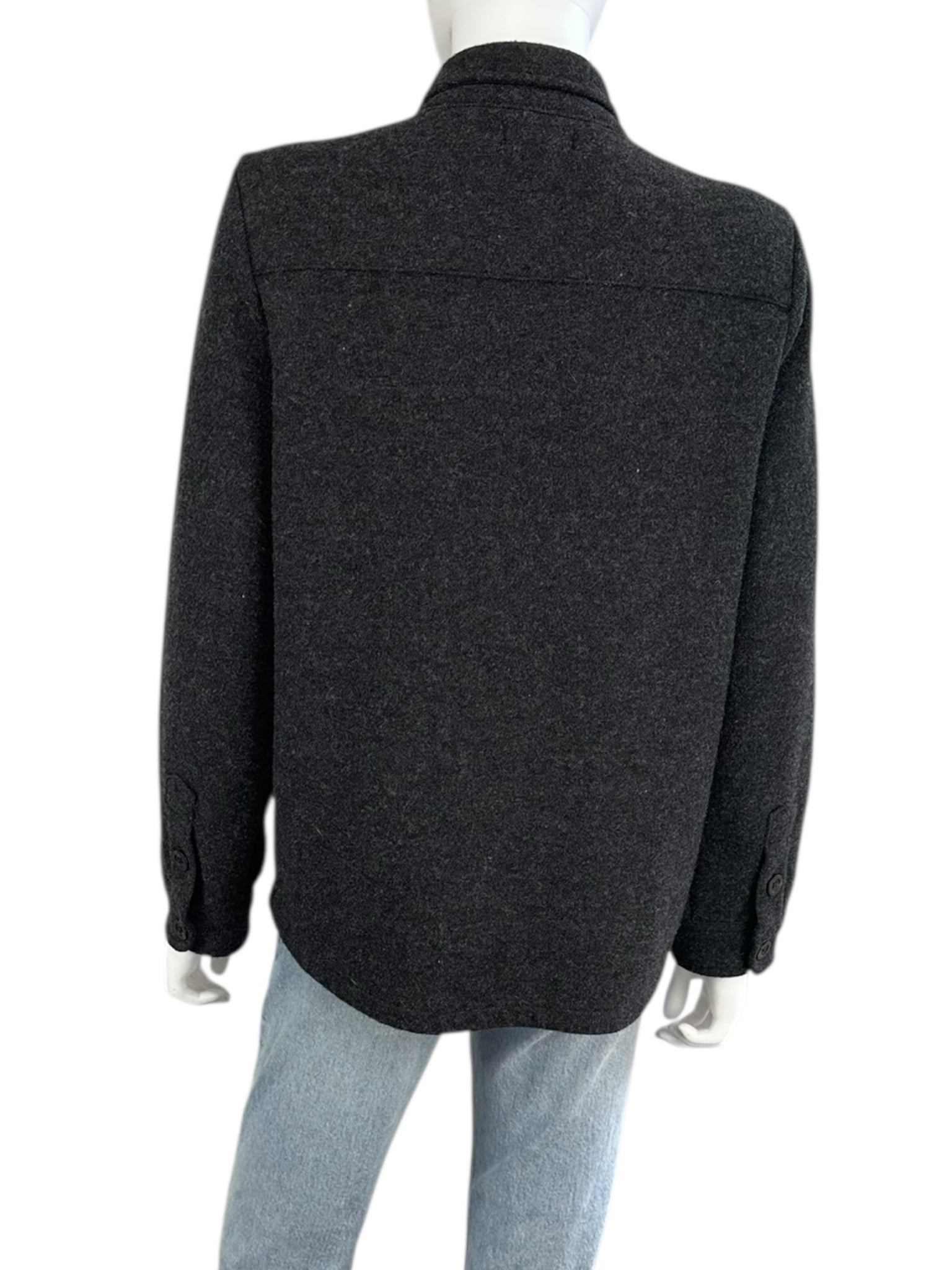 Dark gray wool blend flannel button-down with long button cuff sleeves, front pockets and a button front closure.