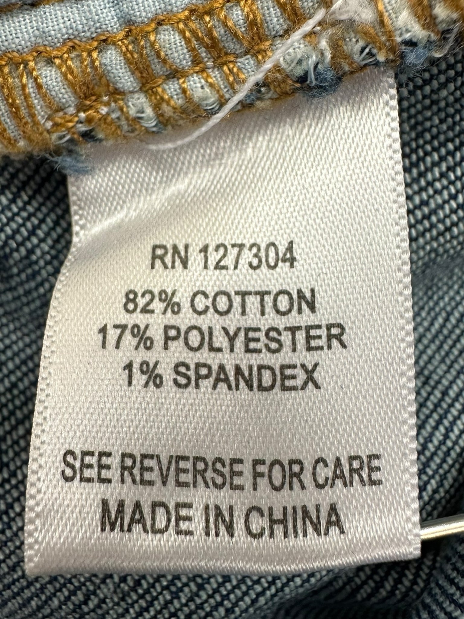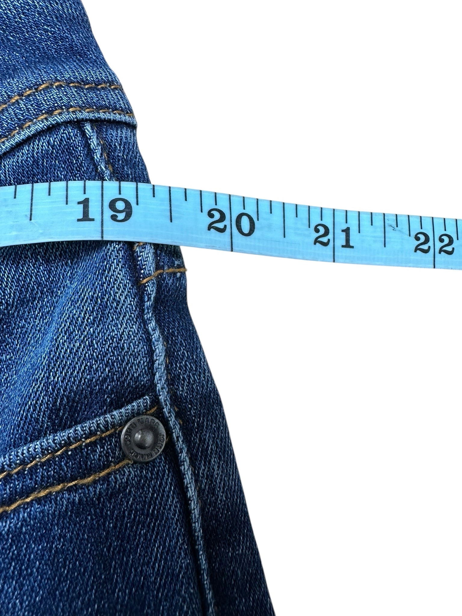 Blue denim classic 5 pocket boyfriend jeans with blue embroidered ankles. Jeans have a front zipper/button fly closure.