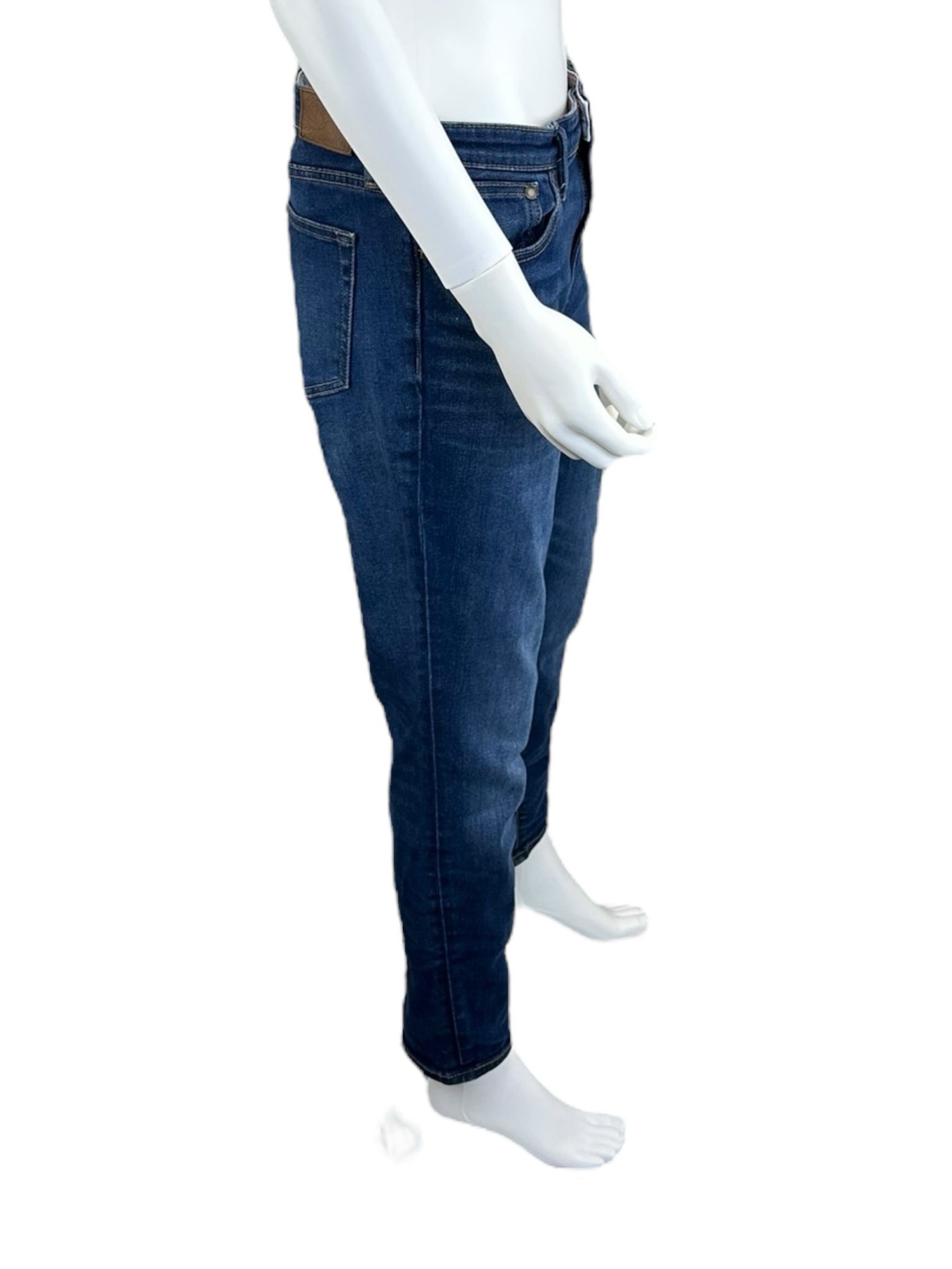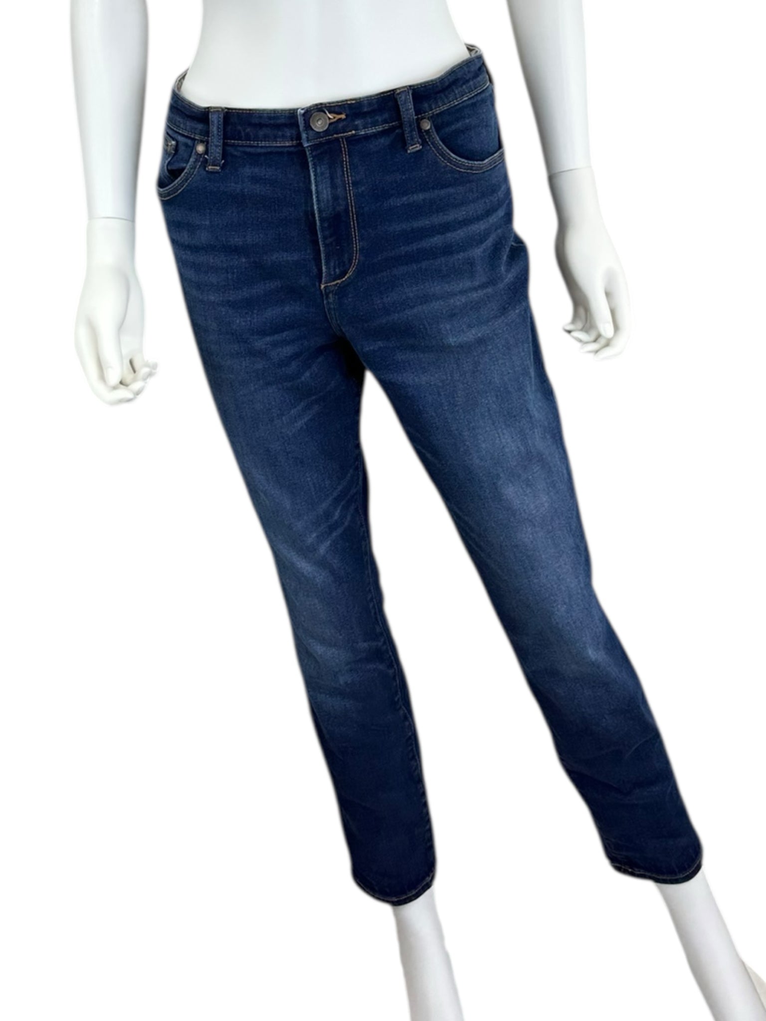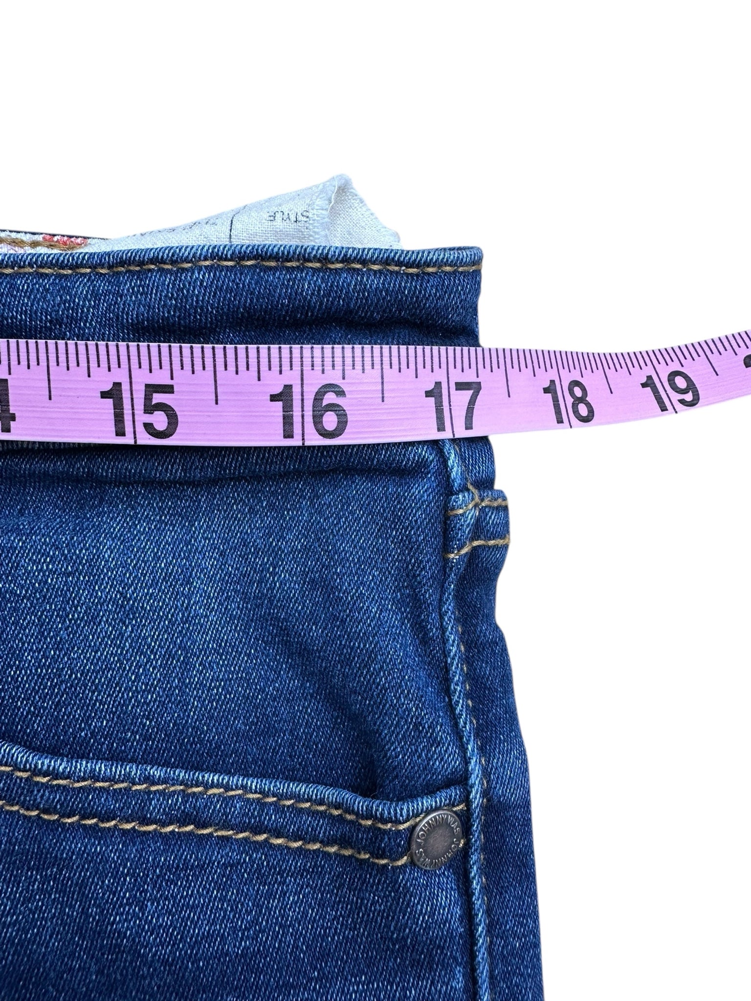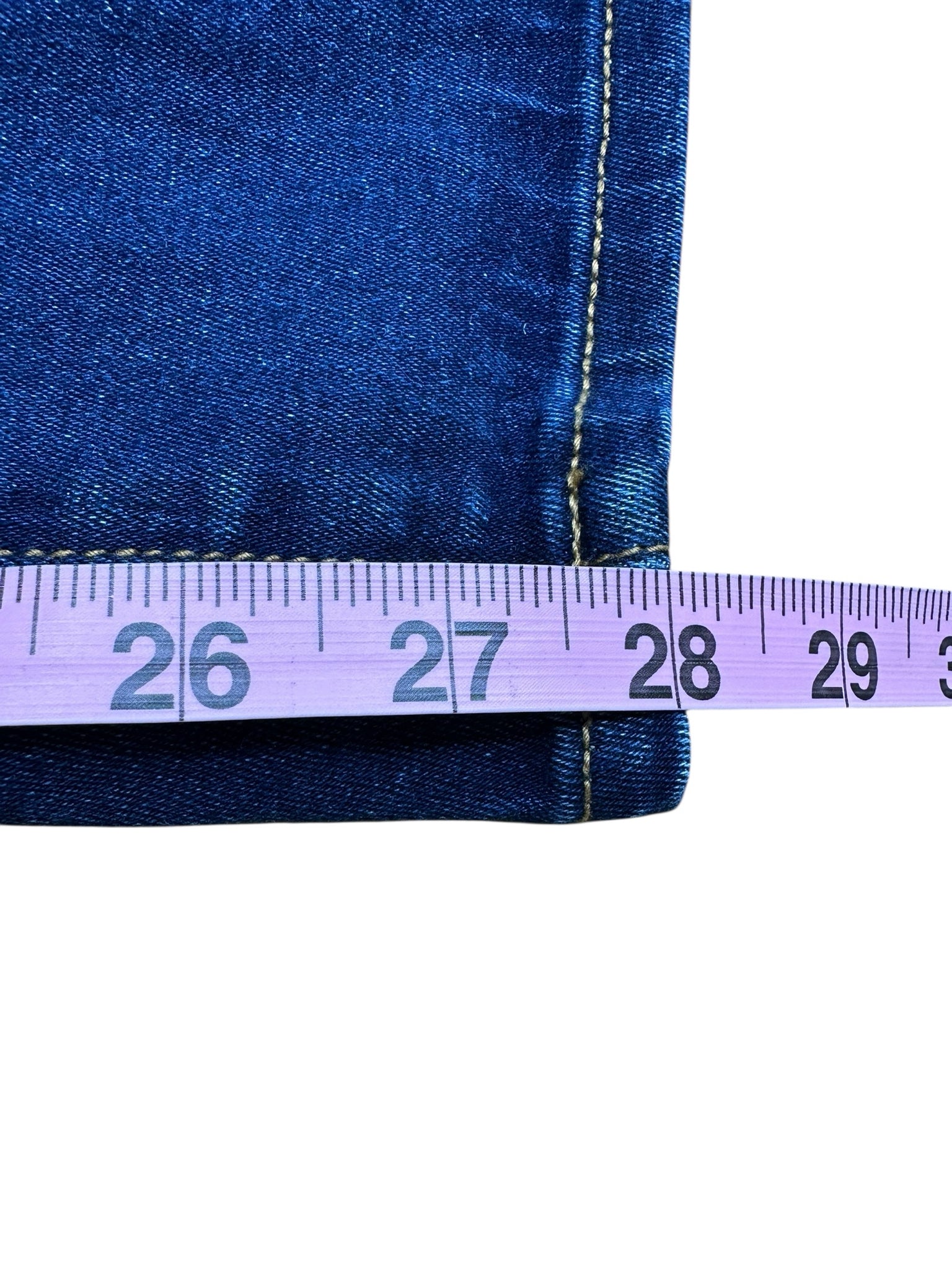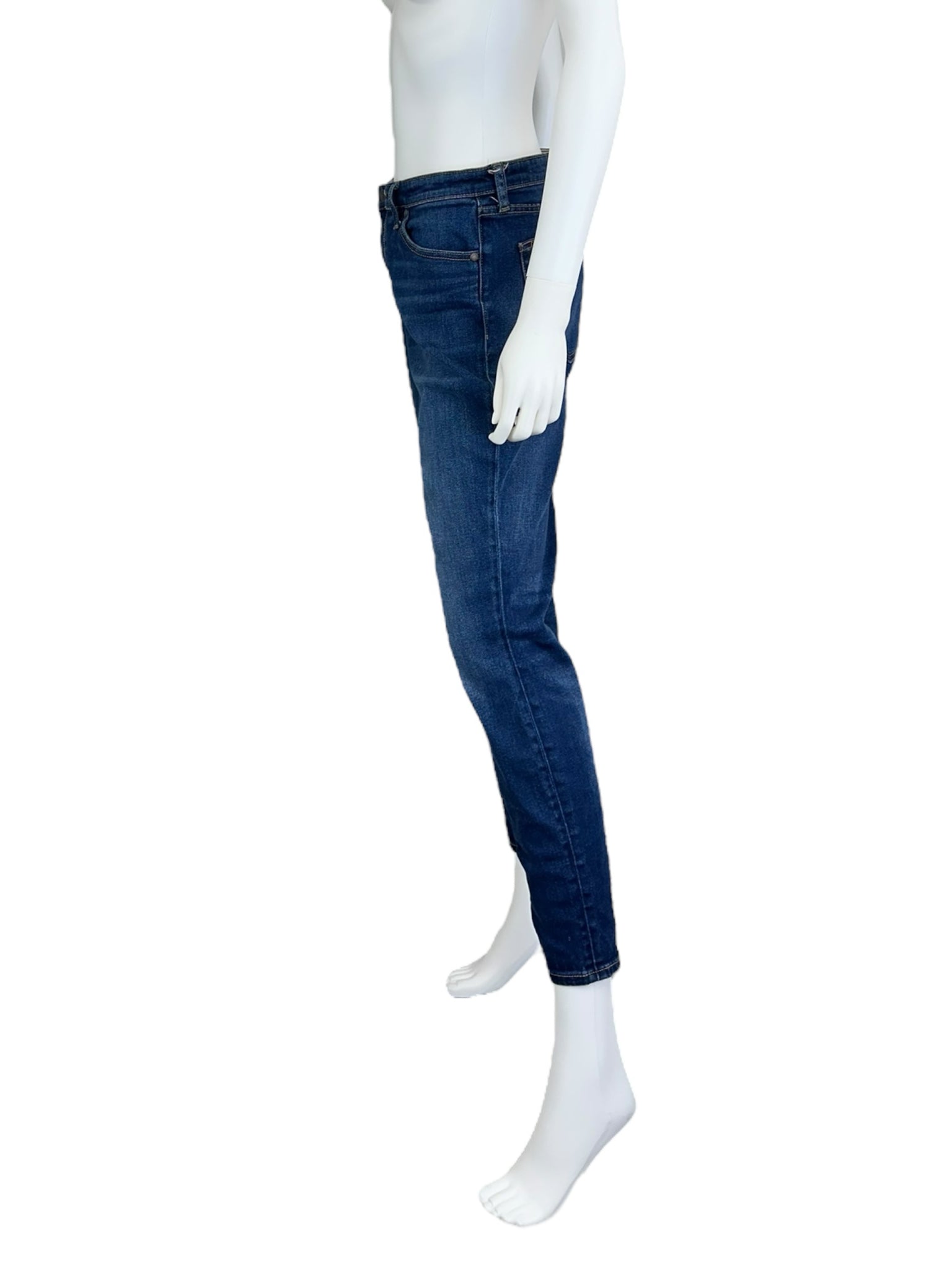 Blue dark wash skinny jeans with a classic 5 pocket design with zipper/button closure.