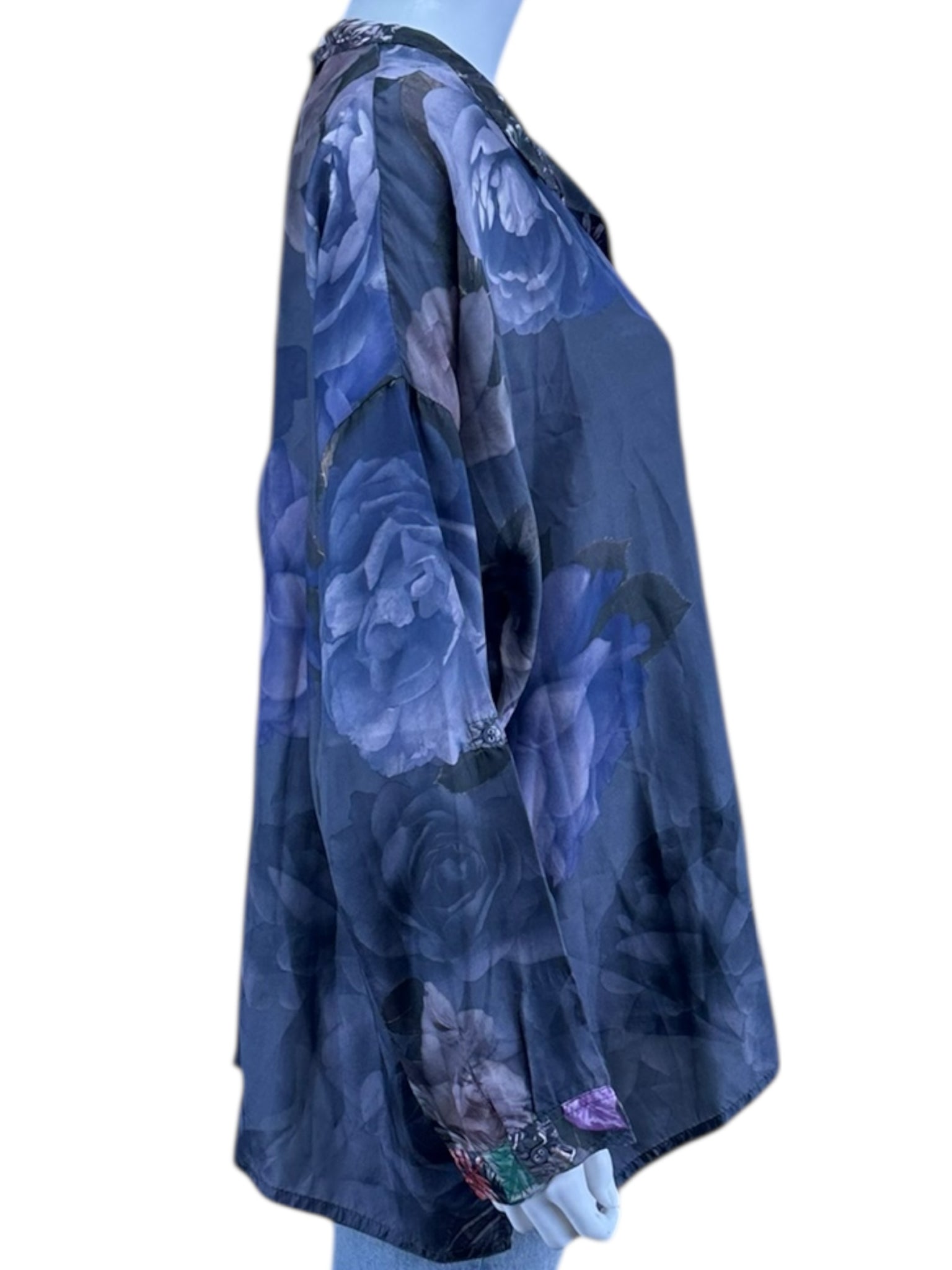 New with tags! 100% silk Audrey blouse in grey peony print. Blouse has long drop sleeves with button closure and a front button closure.