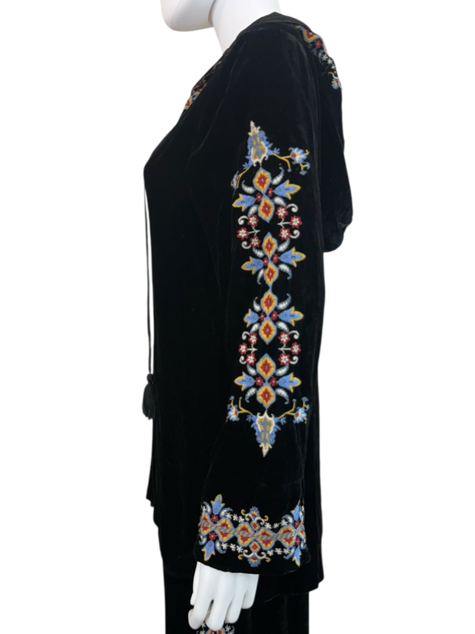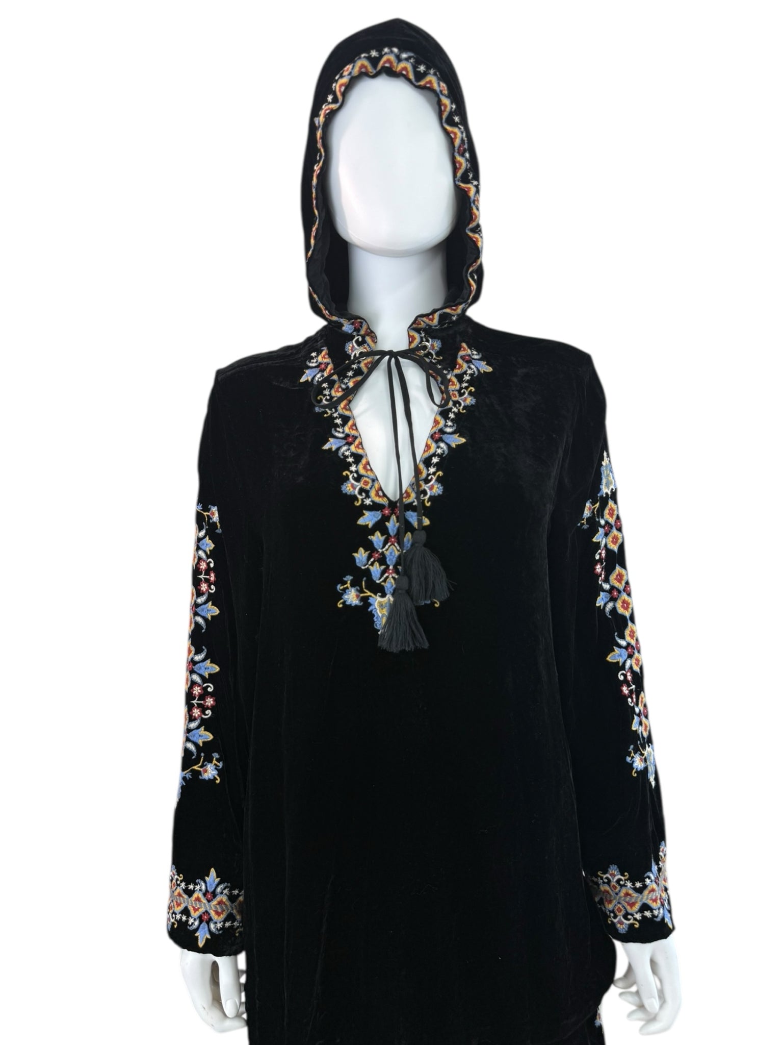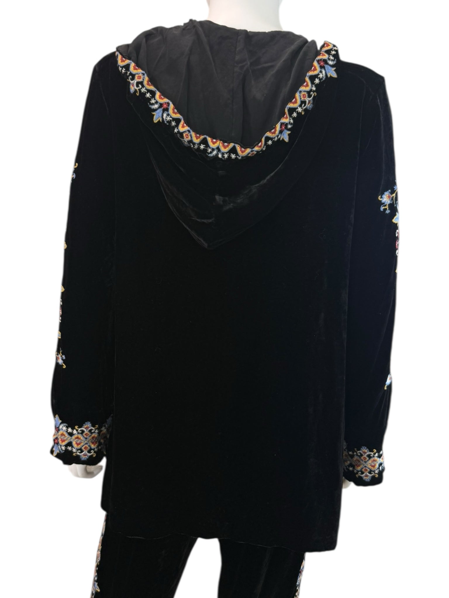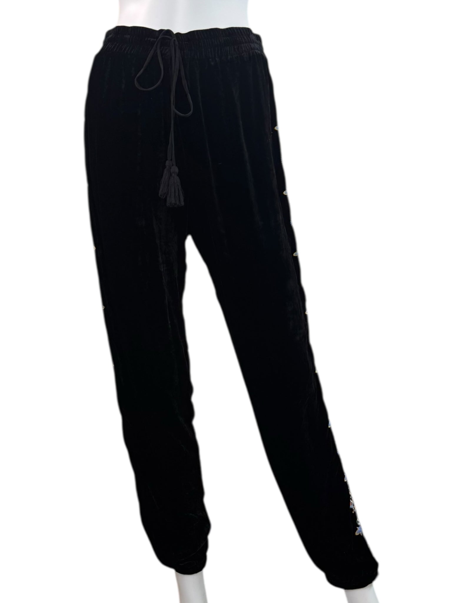 Super soft and comfy 2-piece black velvet jogger set. Pants are a pull-on style with an adjustable tie closure at waist and floral embroidered pattern on legs. Top features long sleeves, floral embroidered pattern throughout and a V-neck with hood with
