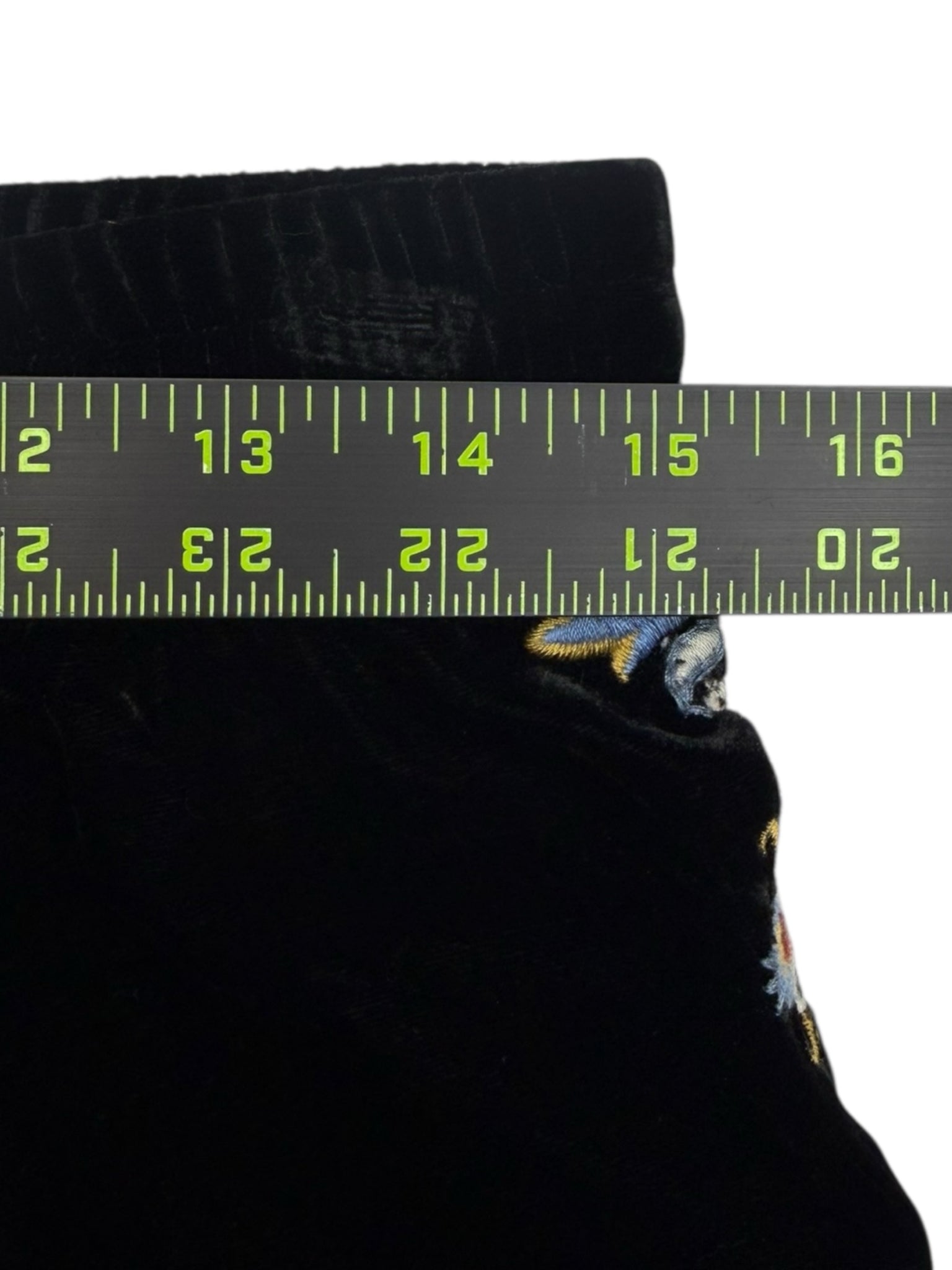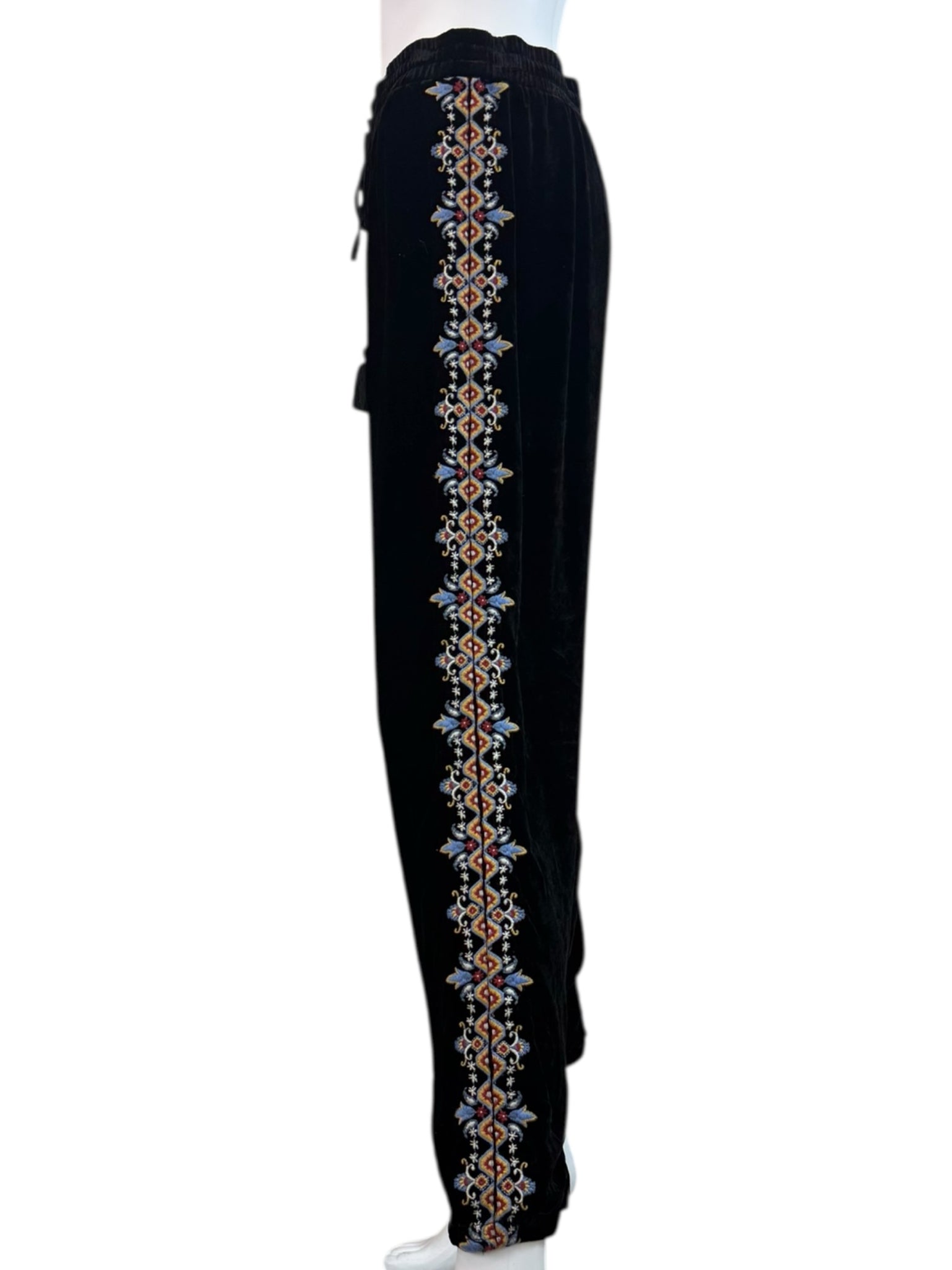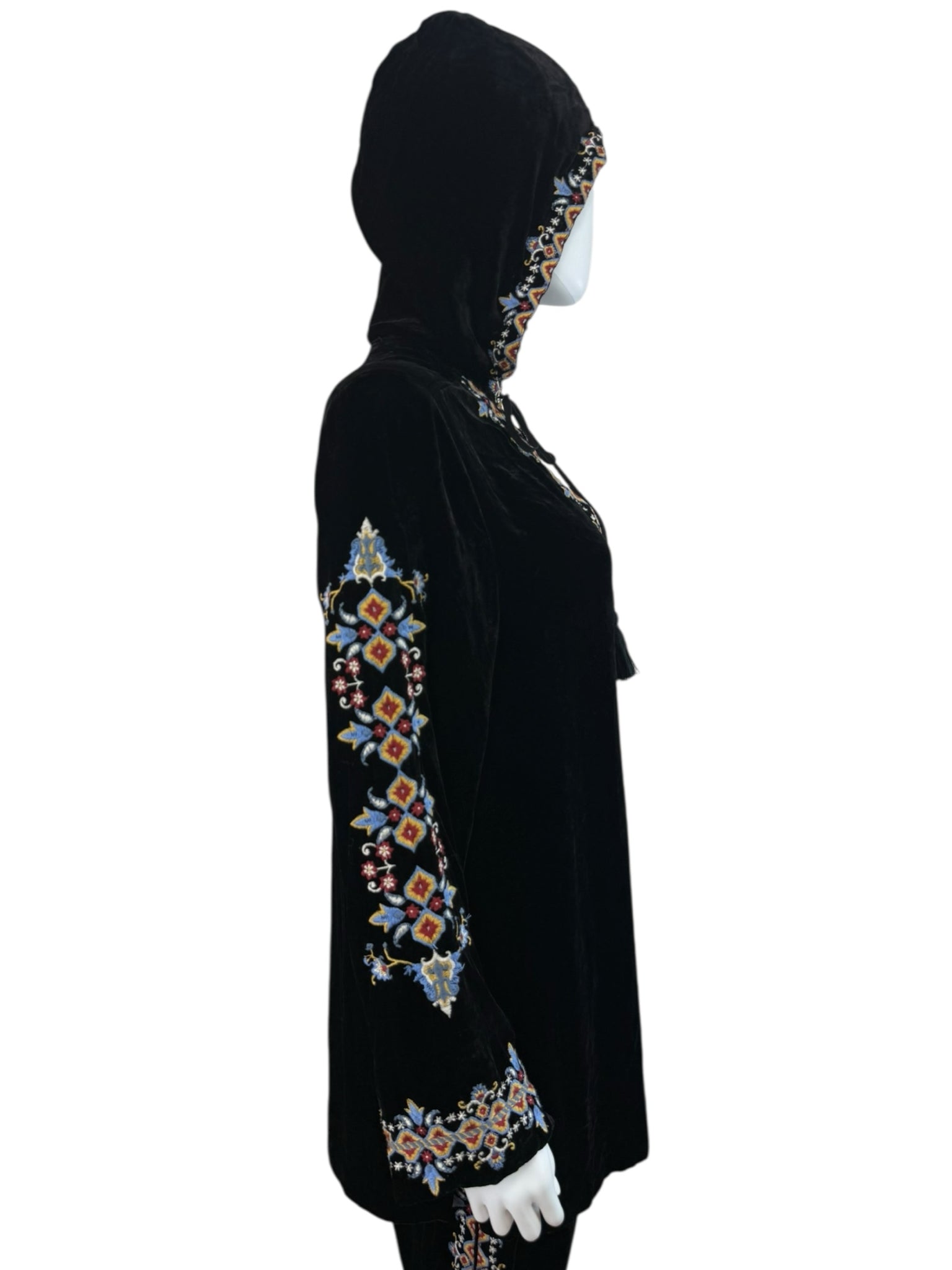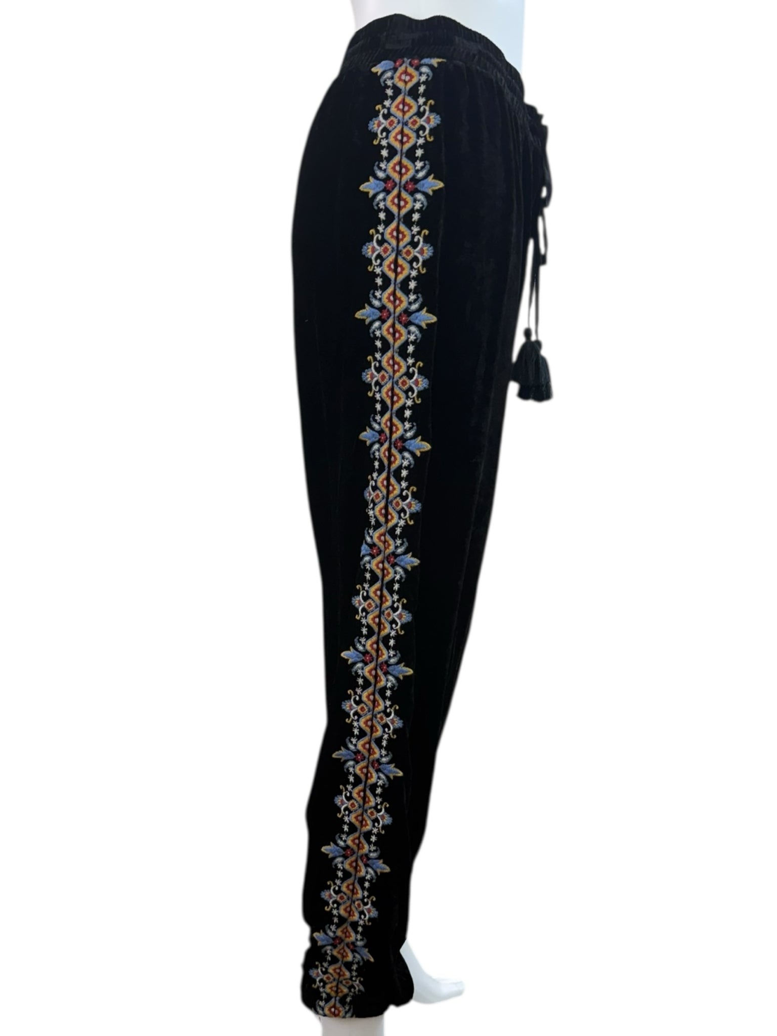 Super soft and comfy 2-piece black velvet jogger set. Pants are a pull-on style with an adjustable tie closure at waist and floral embroidered pattern on legs. Top features long sleeves, floral embroidered pattern throughout and a V-neck with hood with