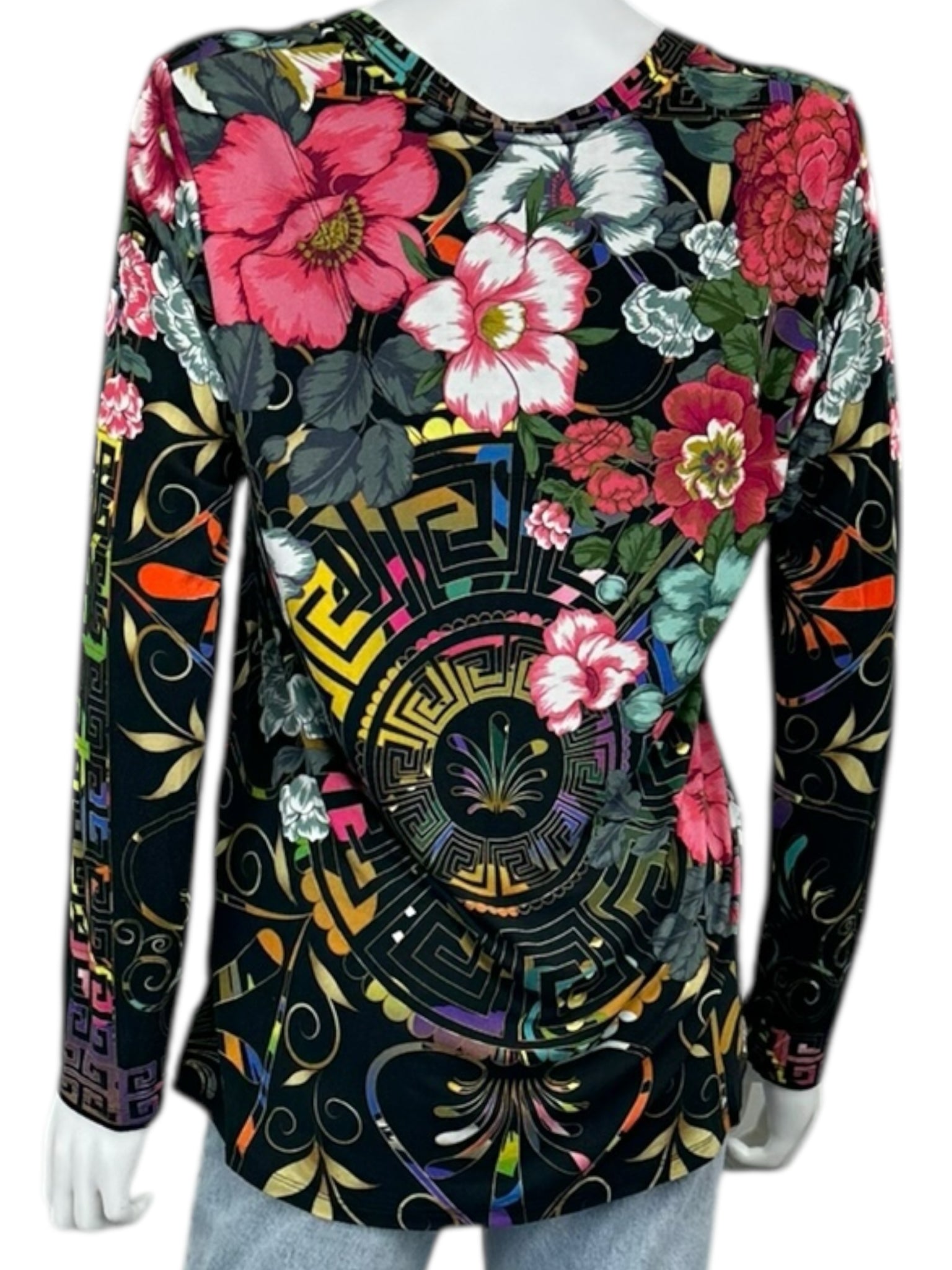 Black with multi-colored floral print stretch knit top with long sleeves and a V-neck opening.
