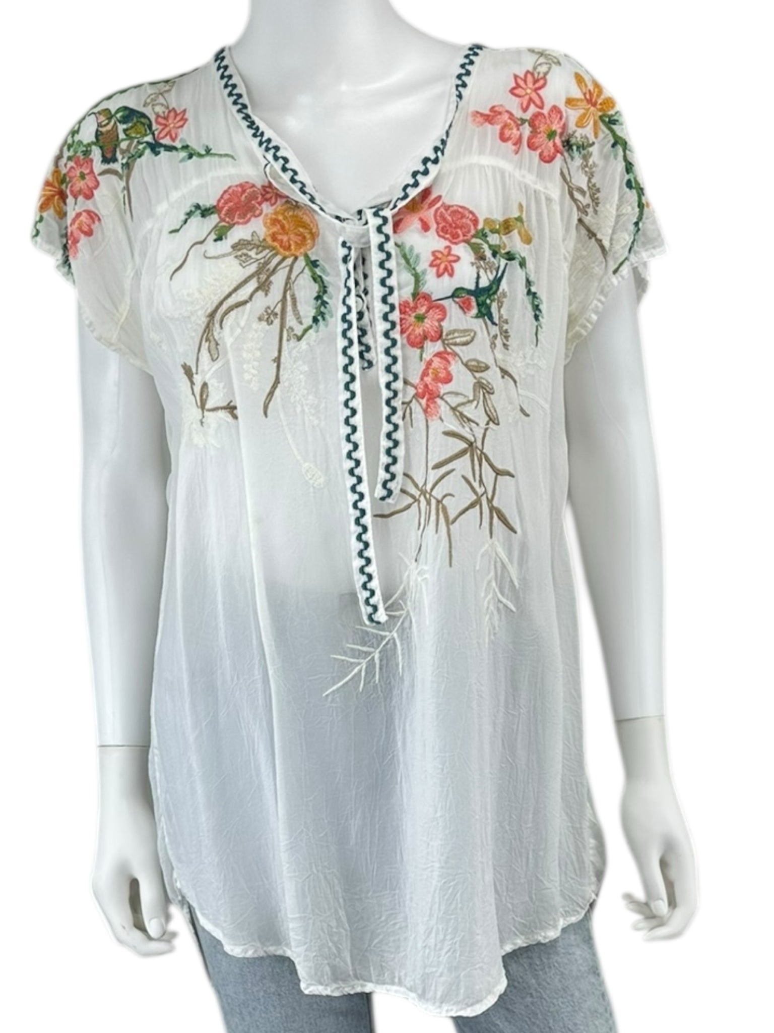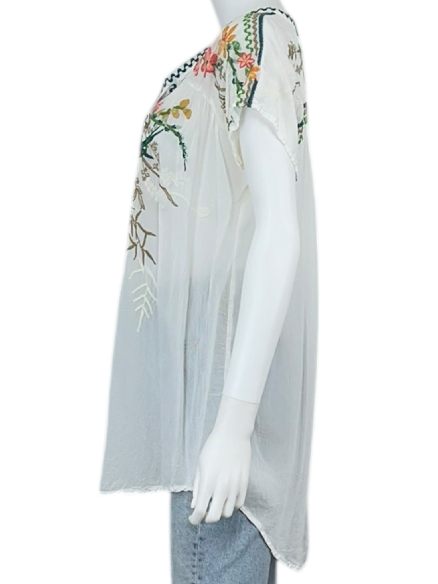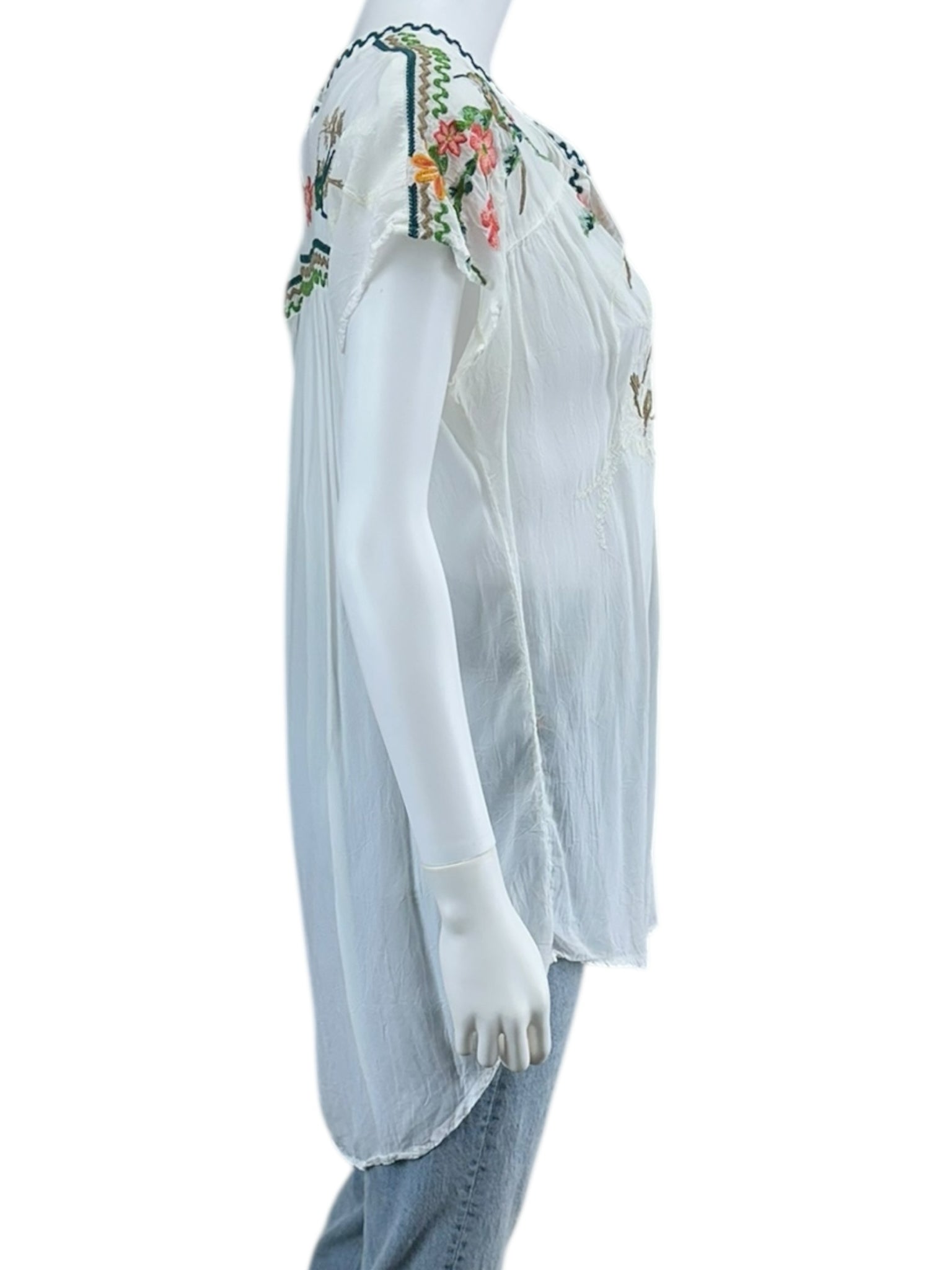 Lightweight white short sleeve tunic length top with multi-colored floral embroidered pattern. Shirt has a split neck opening with tie closure.