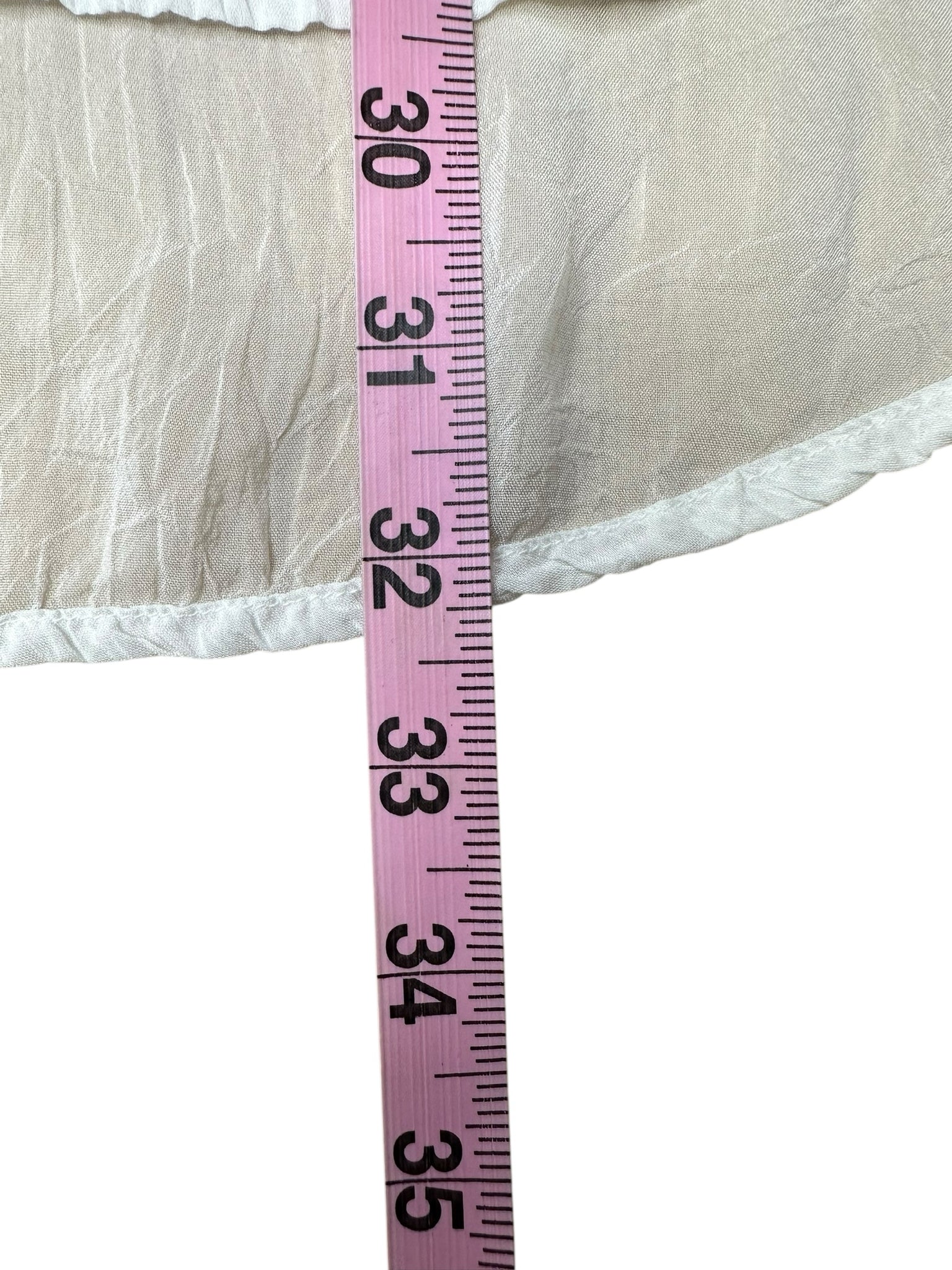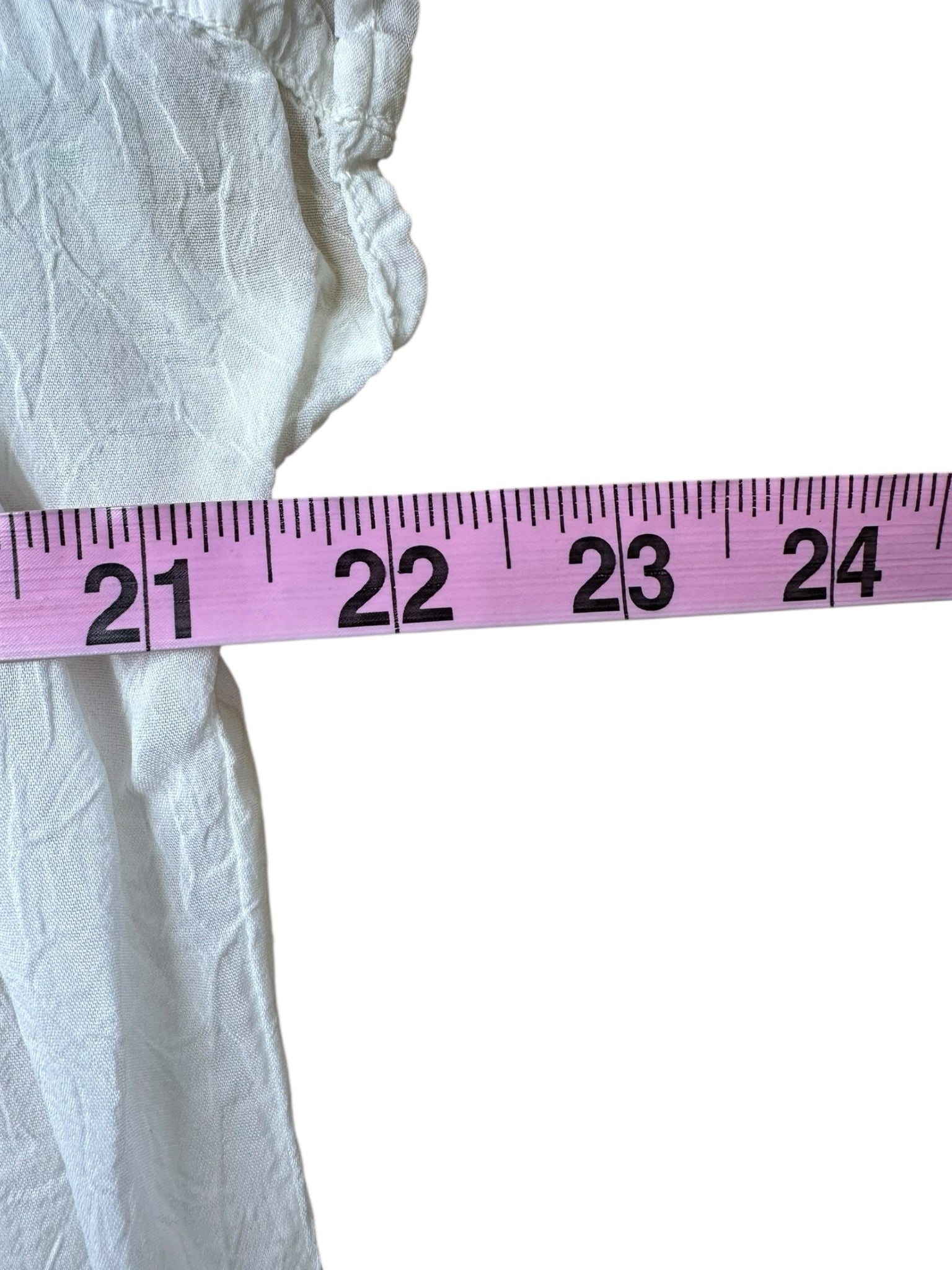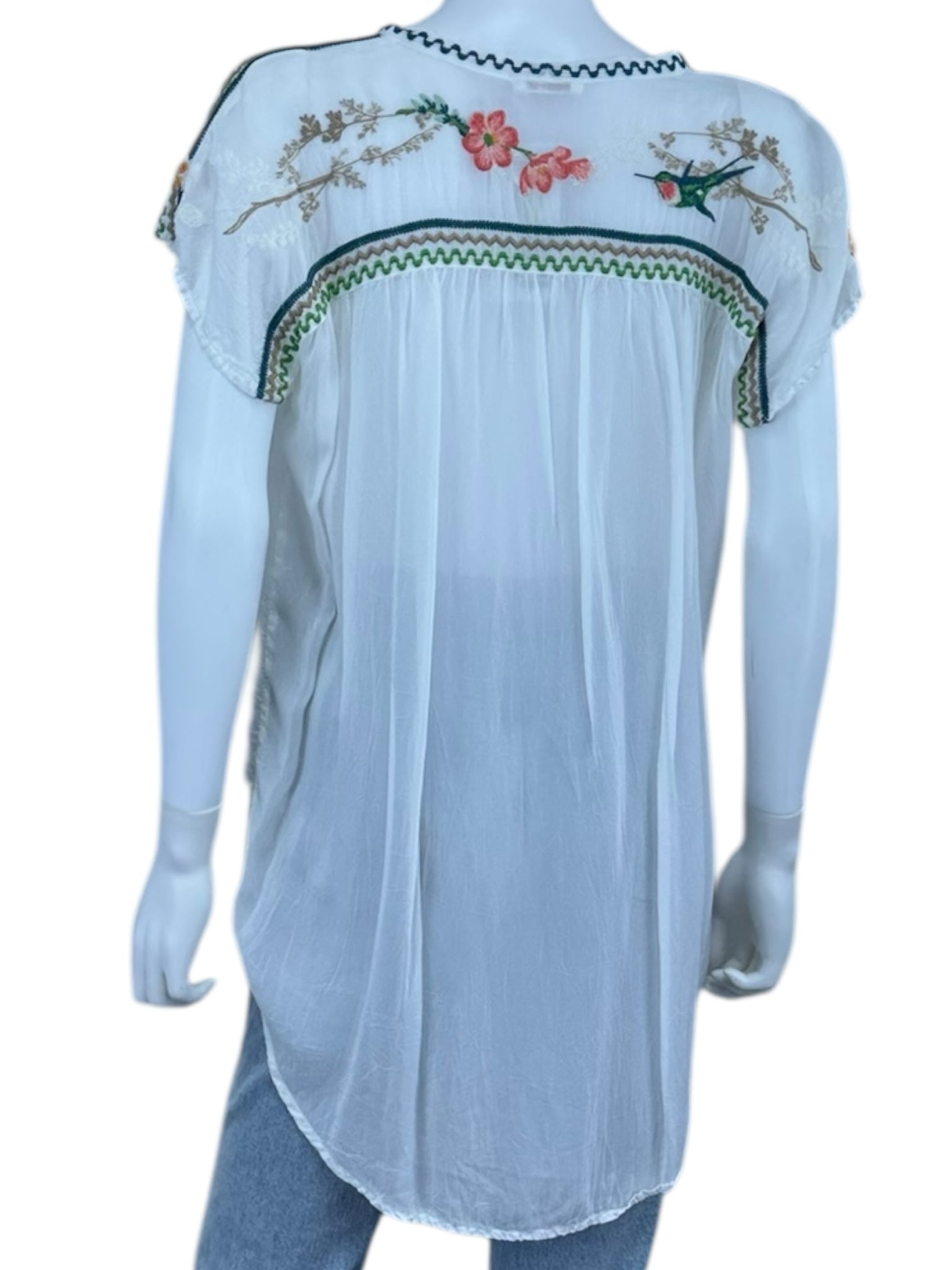 Lightweight white short sleeve tunic length top with multi-colored floral embroidered pattern. Shirt has a split neck opening with tie closure.