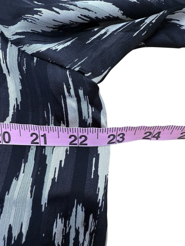 Lightweight semi-sheer black with white watercolor burnout print popover top with long puff sleeves, V-neck ruffle trim opening with tie closure. Bodice is lined.