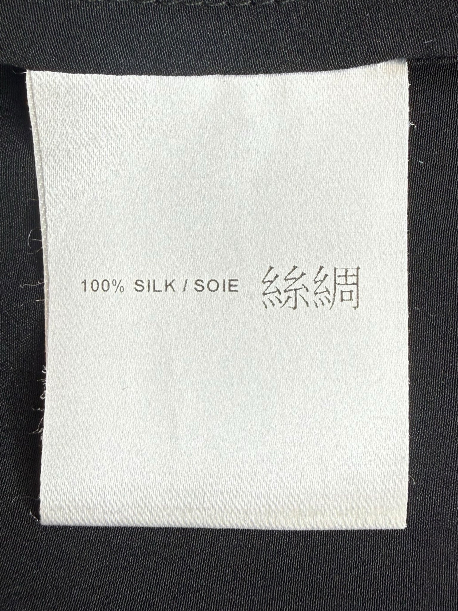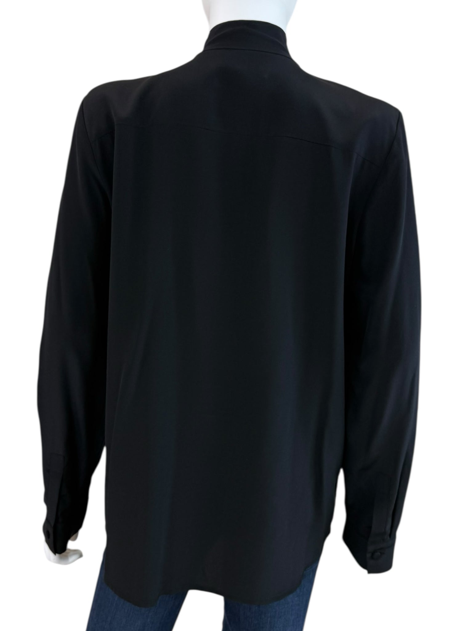 Black 100% silk blouse with long sleeves, V-neckline and neck tie closure.
