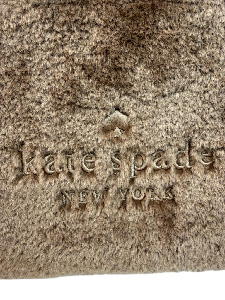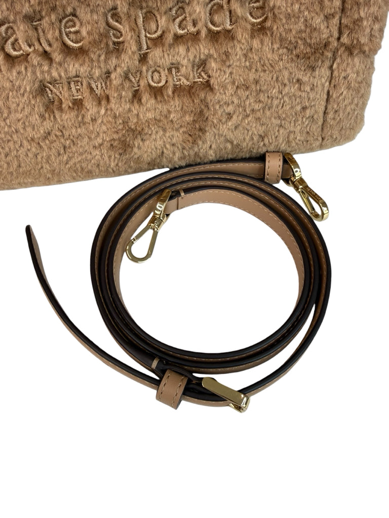 Kate Spade New York Ellie faux fur small convertible tote bag in brown fawn. Purse features an embroidered logo on plush faux fur, a magnetic snap top closure, a removable, adjustable shoulder strap and an interior zipper pocket. Tote is in perfect pristine condition with no signs of wear present. Purse measures 8 x 9.36 x 4.5 with a 4 inch strap drop.