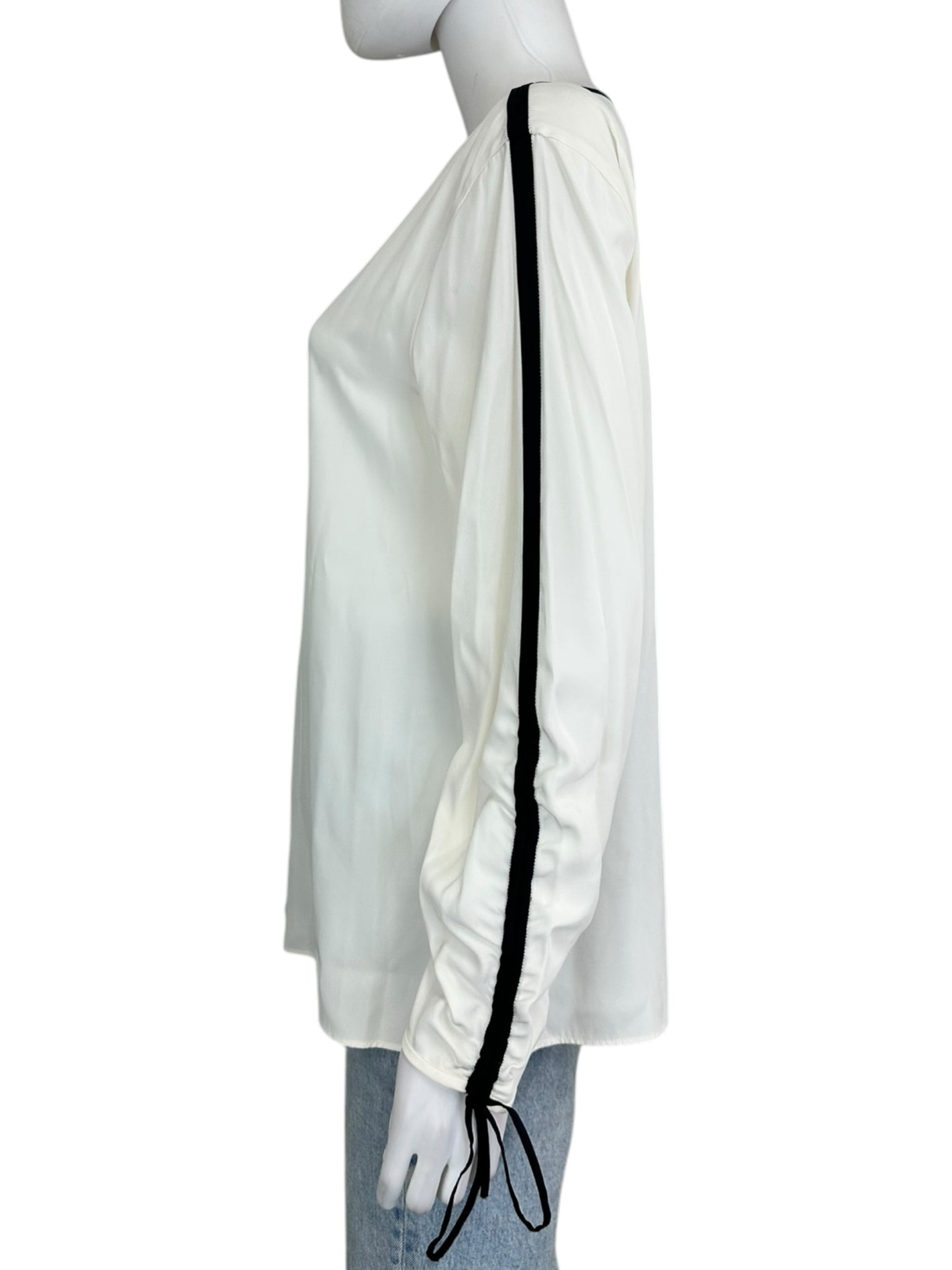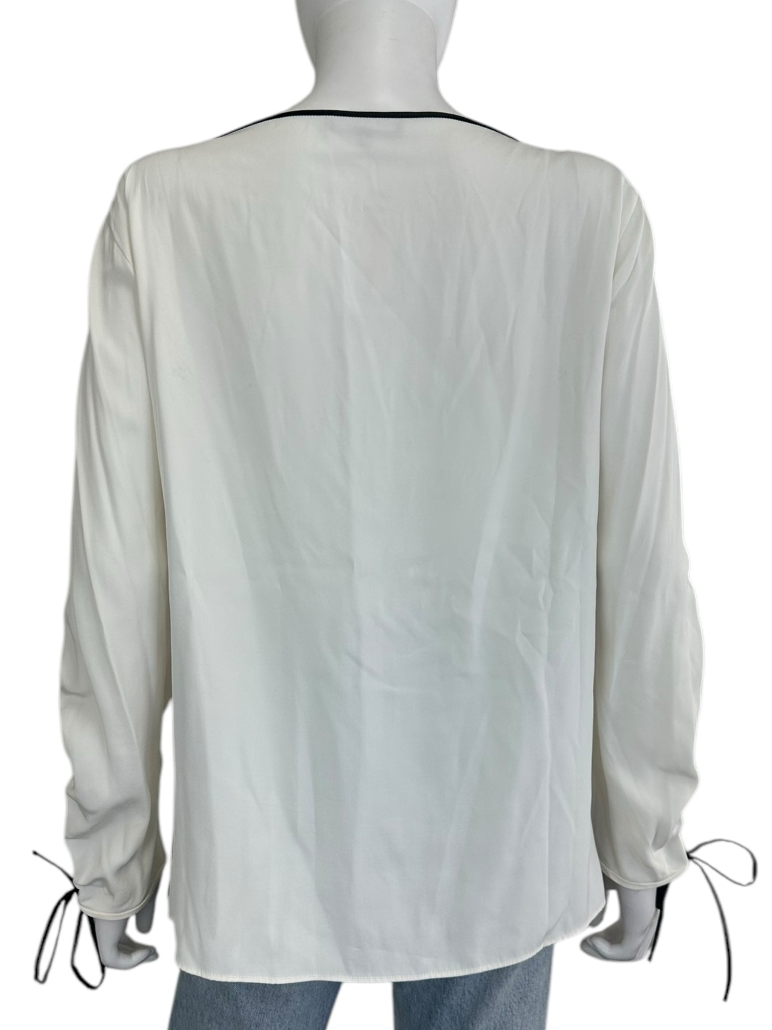 LAFAYETTE 148 NEW YORK ivory white 100% silk long sleeve popover blouse featuring black trim, adjustable tie closure at cuffs and a boat neckline.