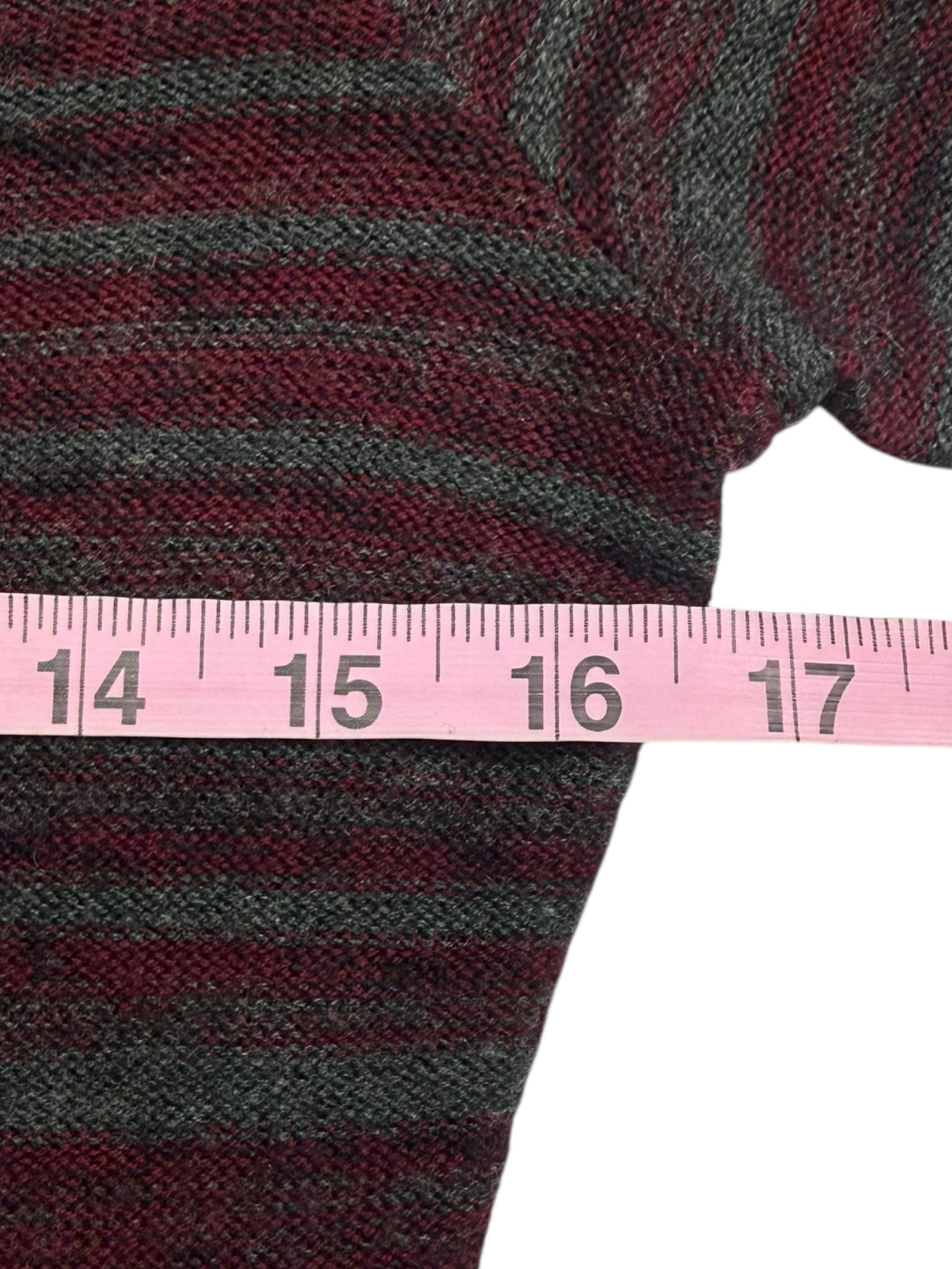 Burgundy and gray patterned pullover turtleneck sweater with long sleeves. Sweater is made from a wool and alpaca blend.
