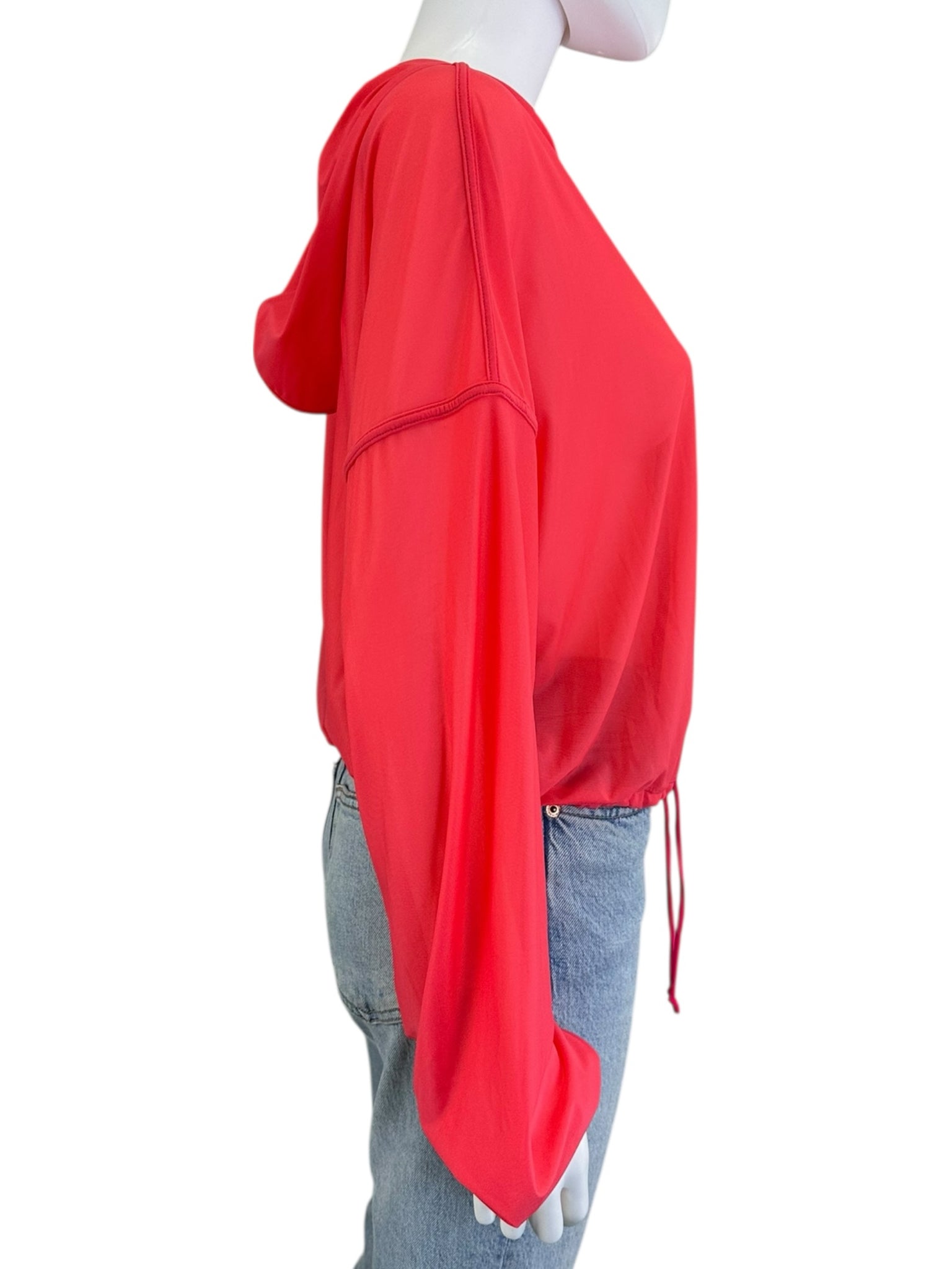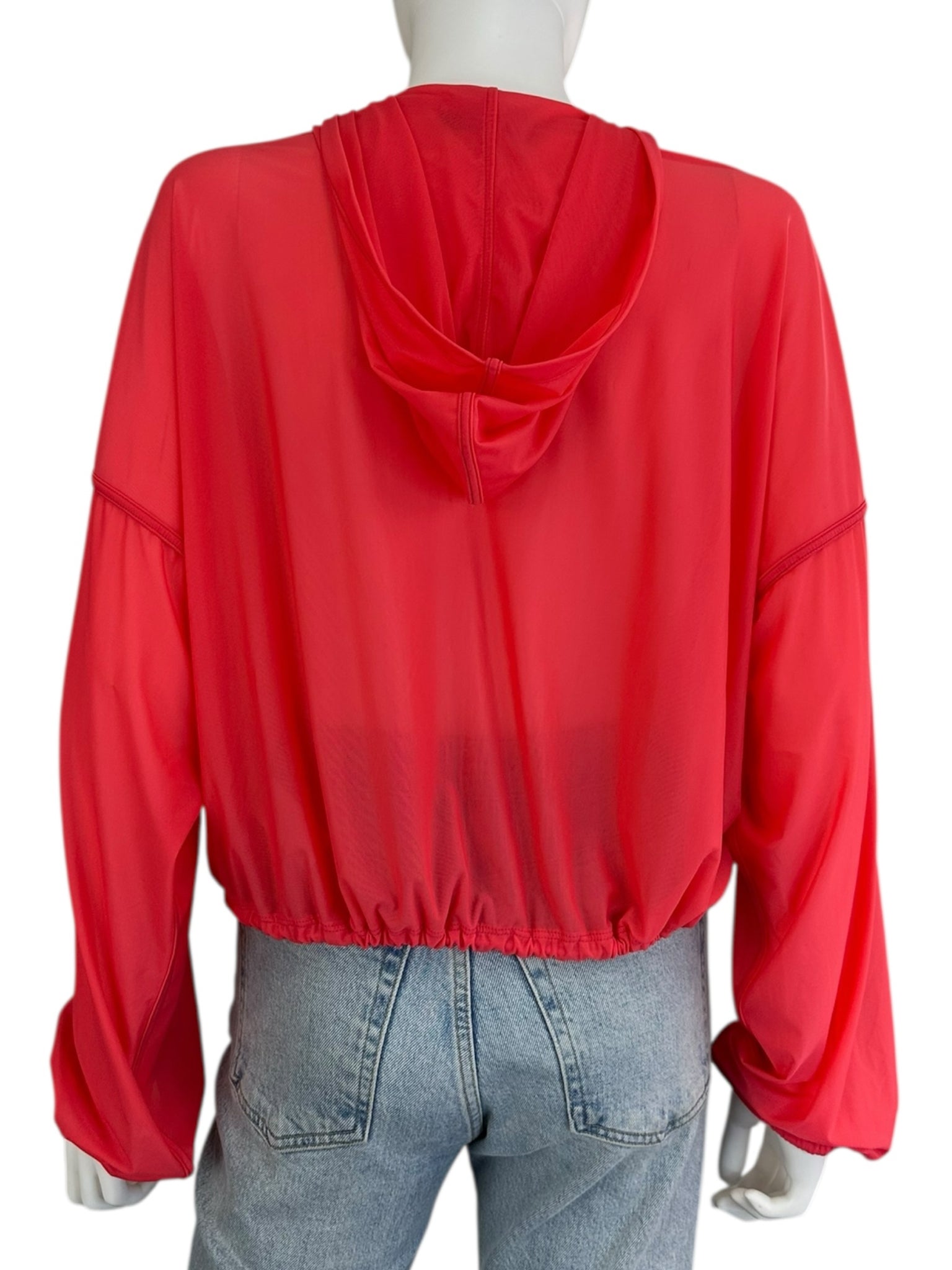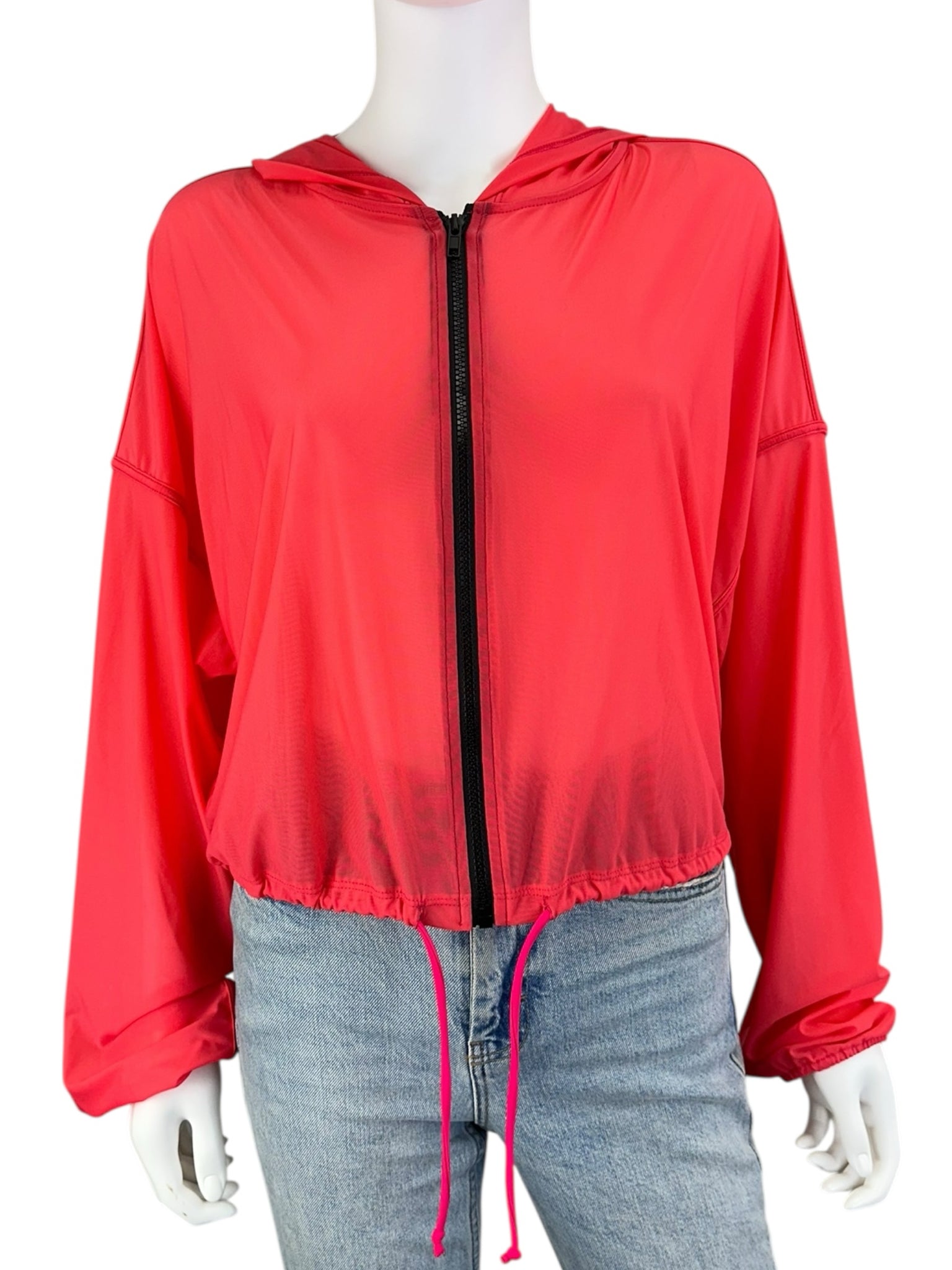 Hot pink/coral pink mesh jacket with a hood, full front zipper, long sleeves, and a drawstring waist.