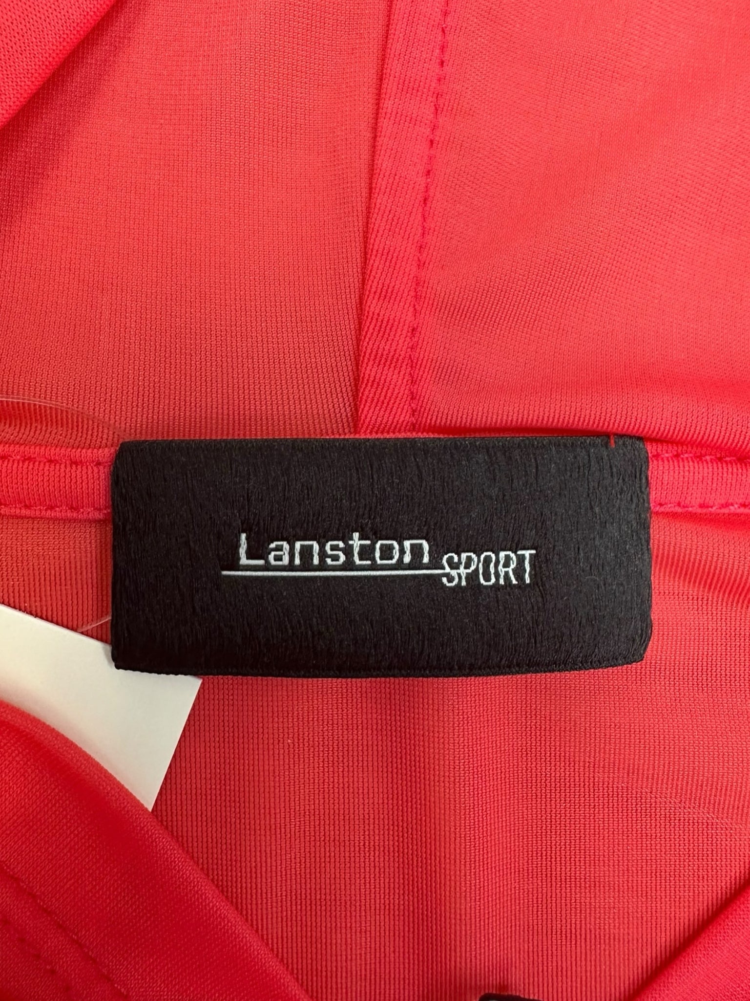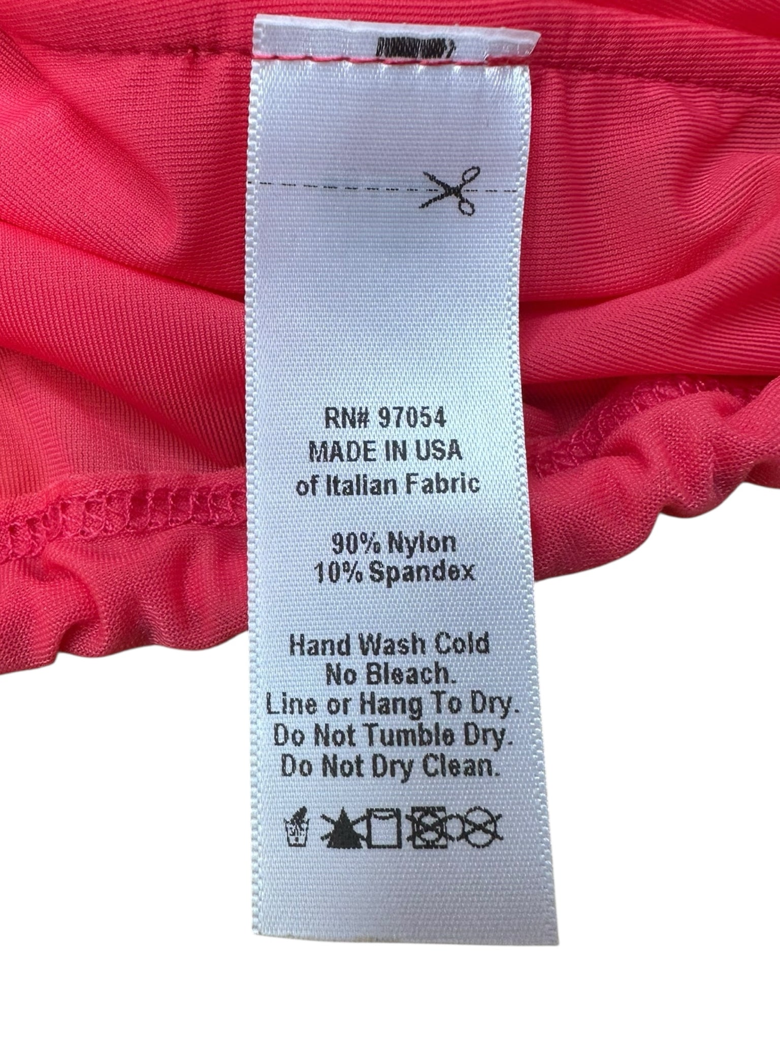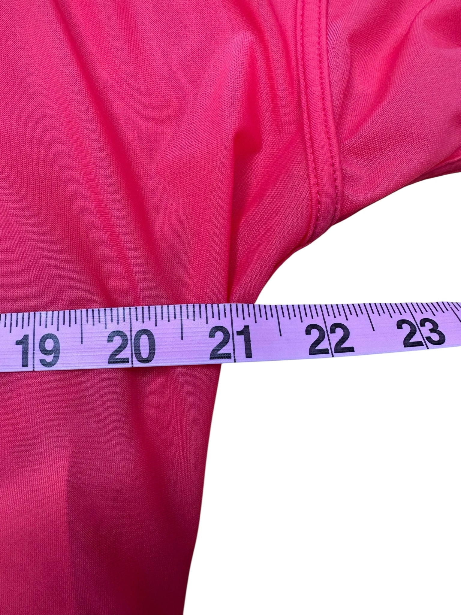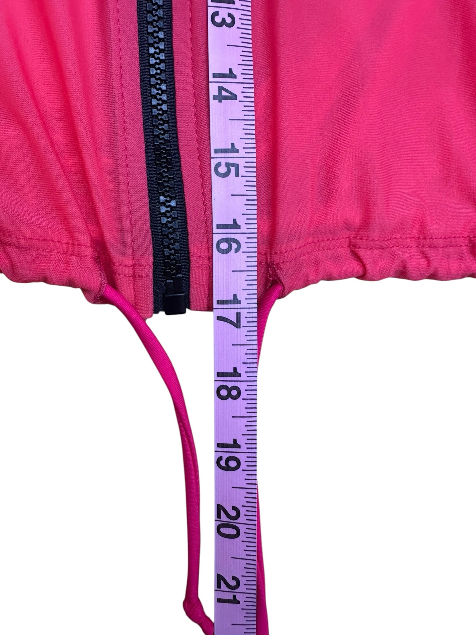 Hot pink/coral pink mesh jacket with a hood, full front zipper, long sleeves, and a drawstring waist.
