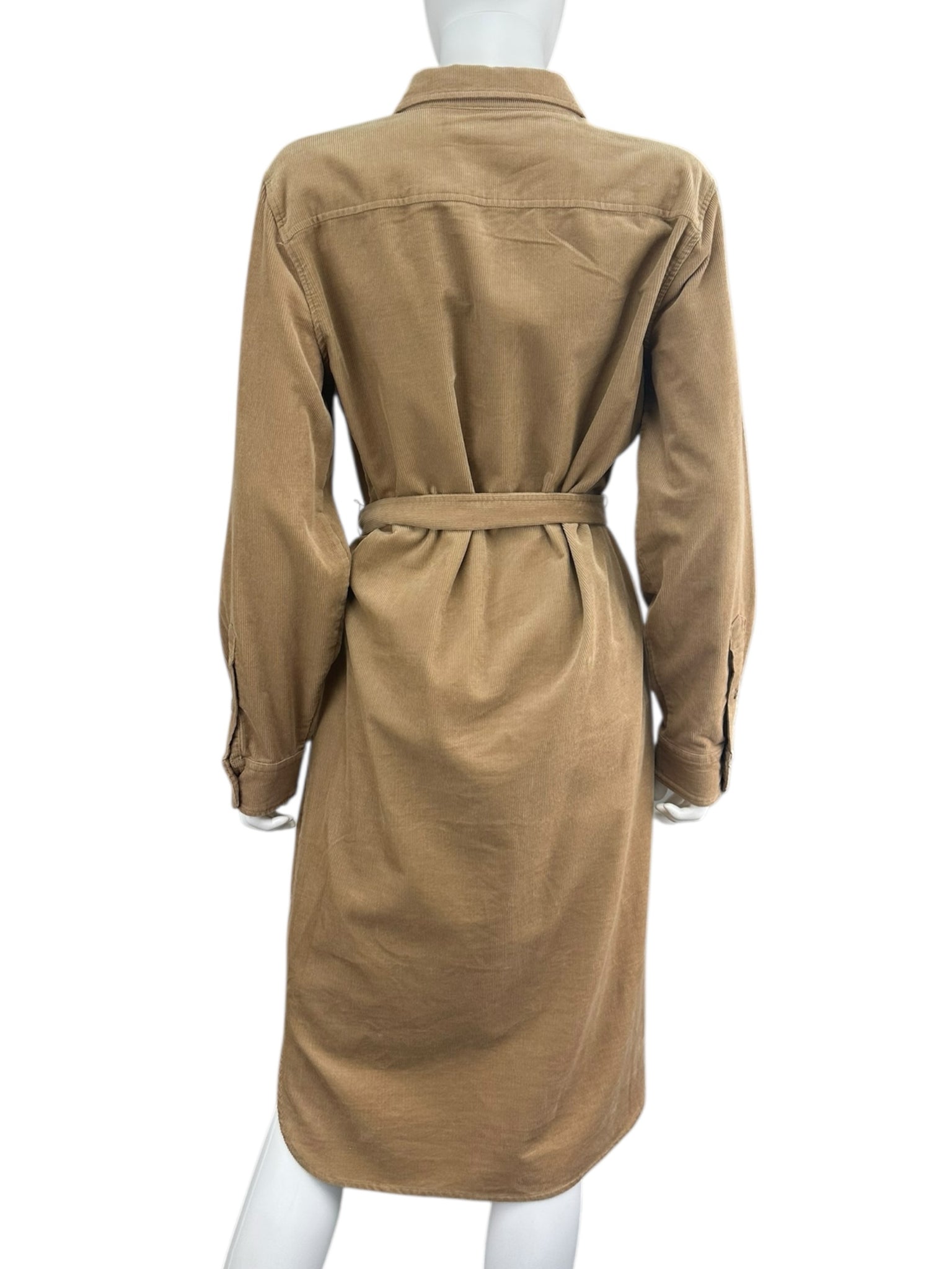New with tags! Camel corduroy collared shirt dress with long button cuff sleeves, front button closure, chest pockets, belted waist and a front button closure. Dress is made from a soft cotton blend fabric.