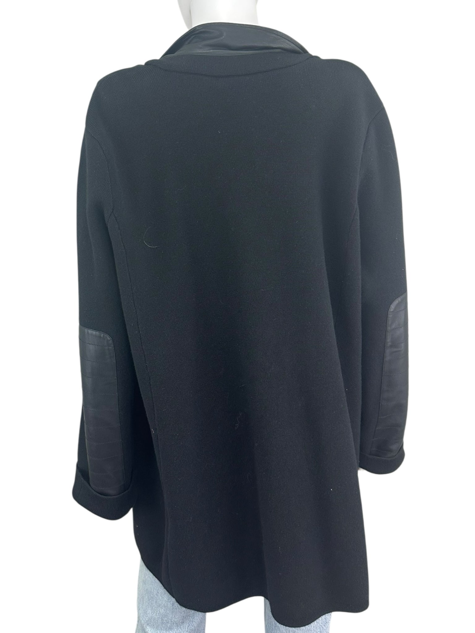 Black cotton blend sweater knit jacket with notched collar, long sleeves and a front button closure. Jacket features a soft vegan leather trim at collar, pockets and elbows. Jacket has a single front button closure.