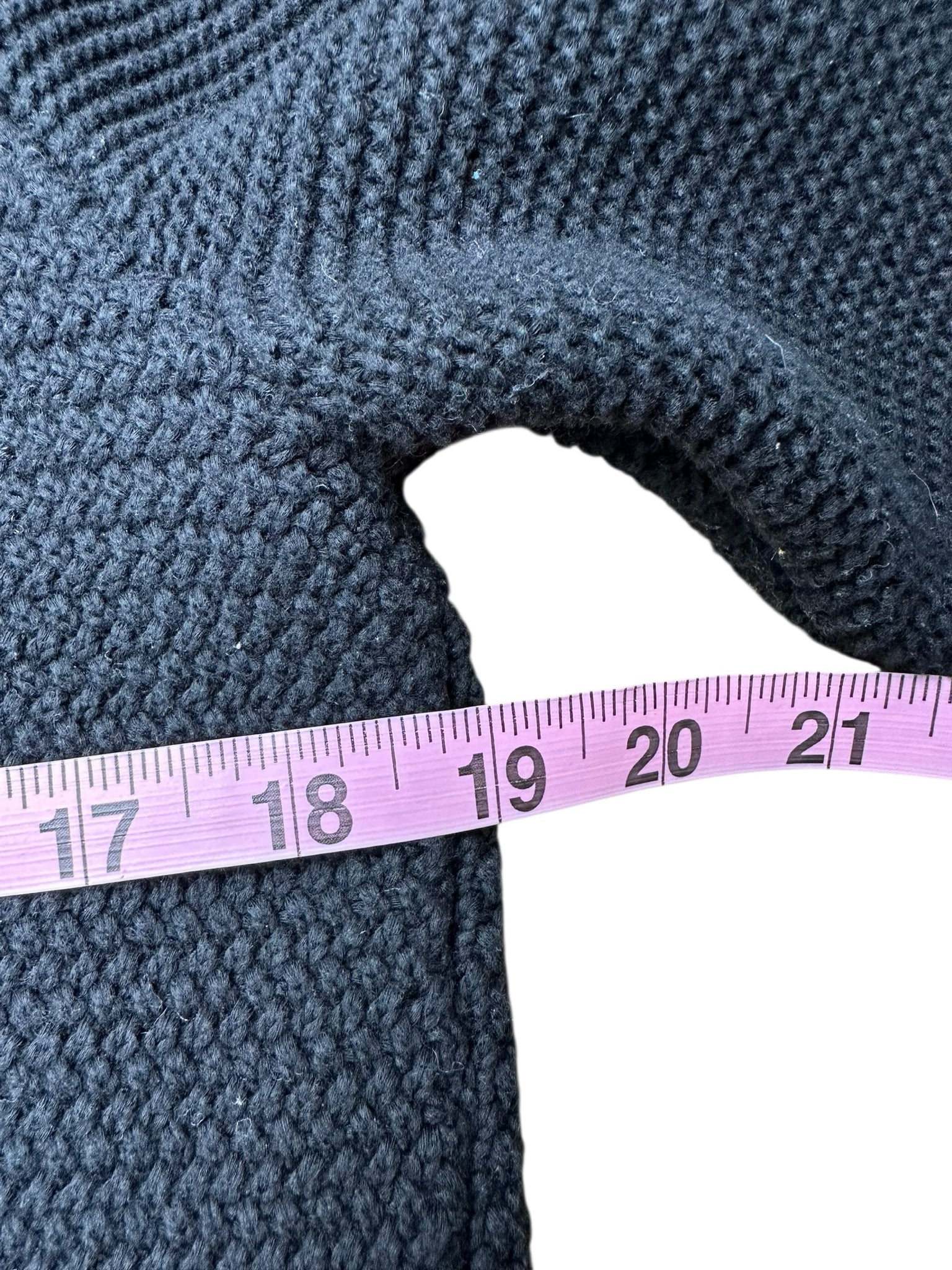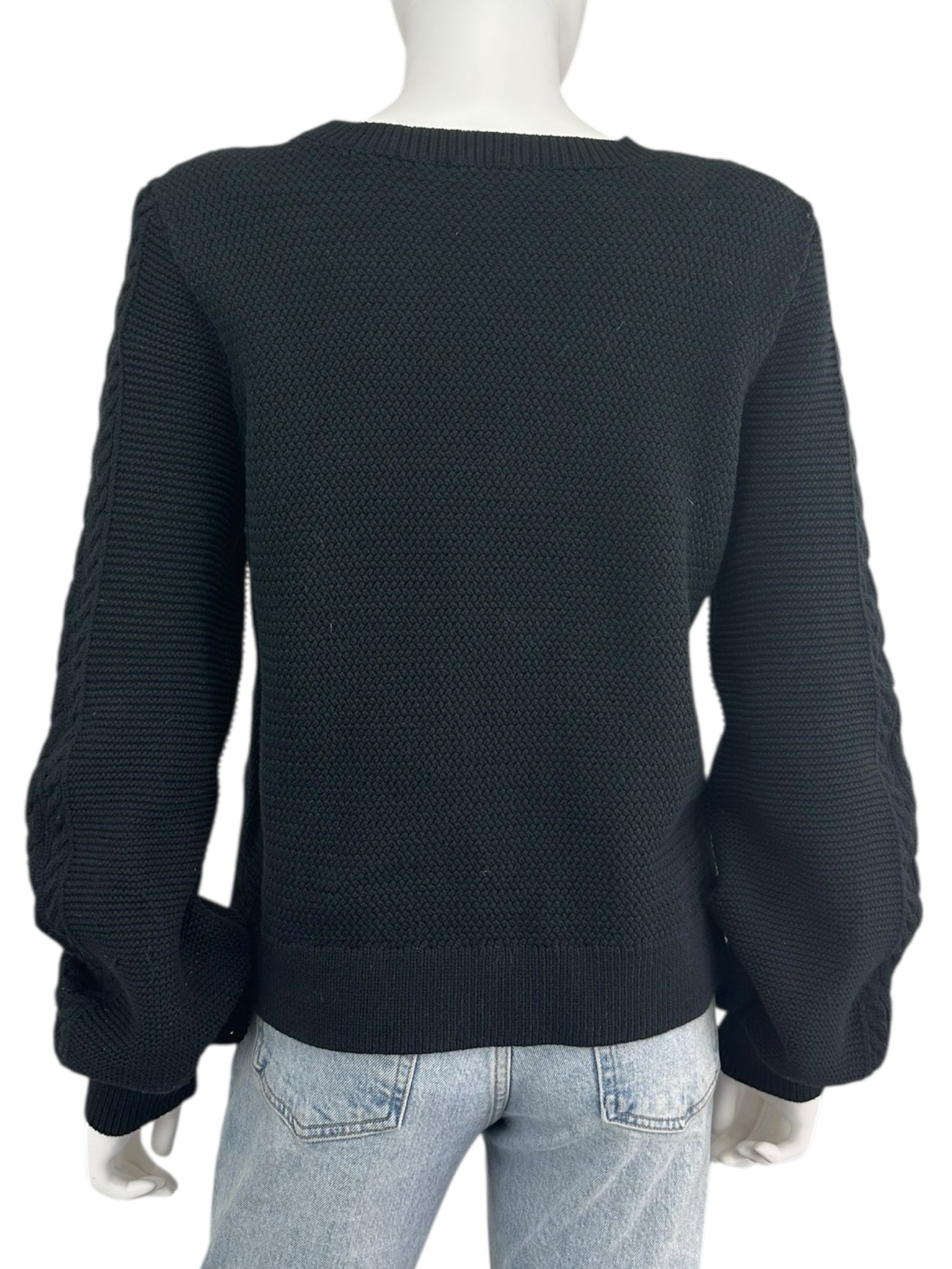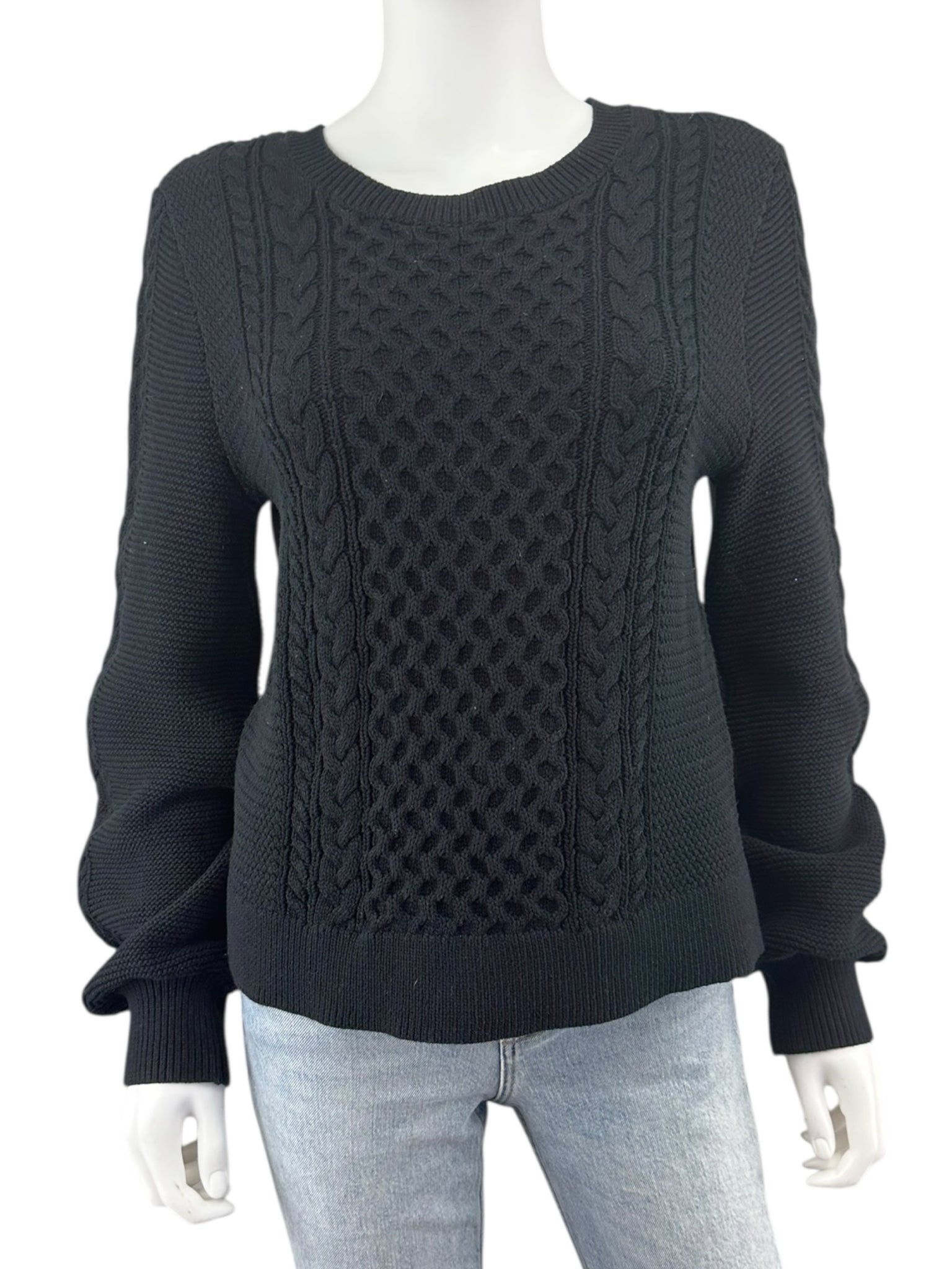 Black cotton blend pullover cable knit sweater with long balloon sleeves.
