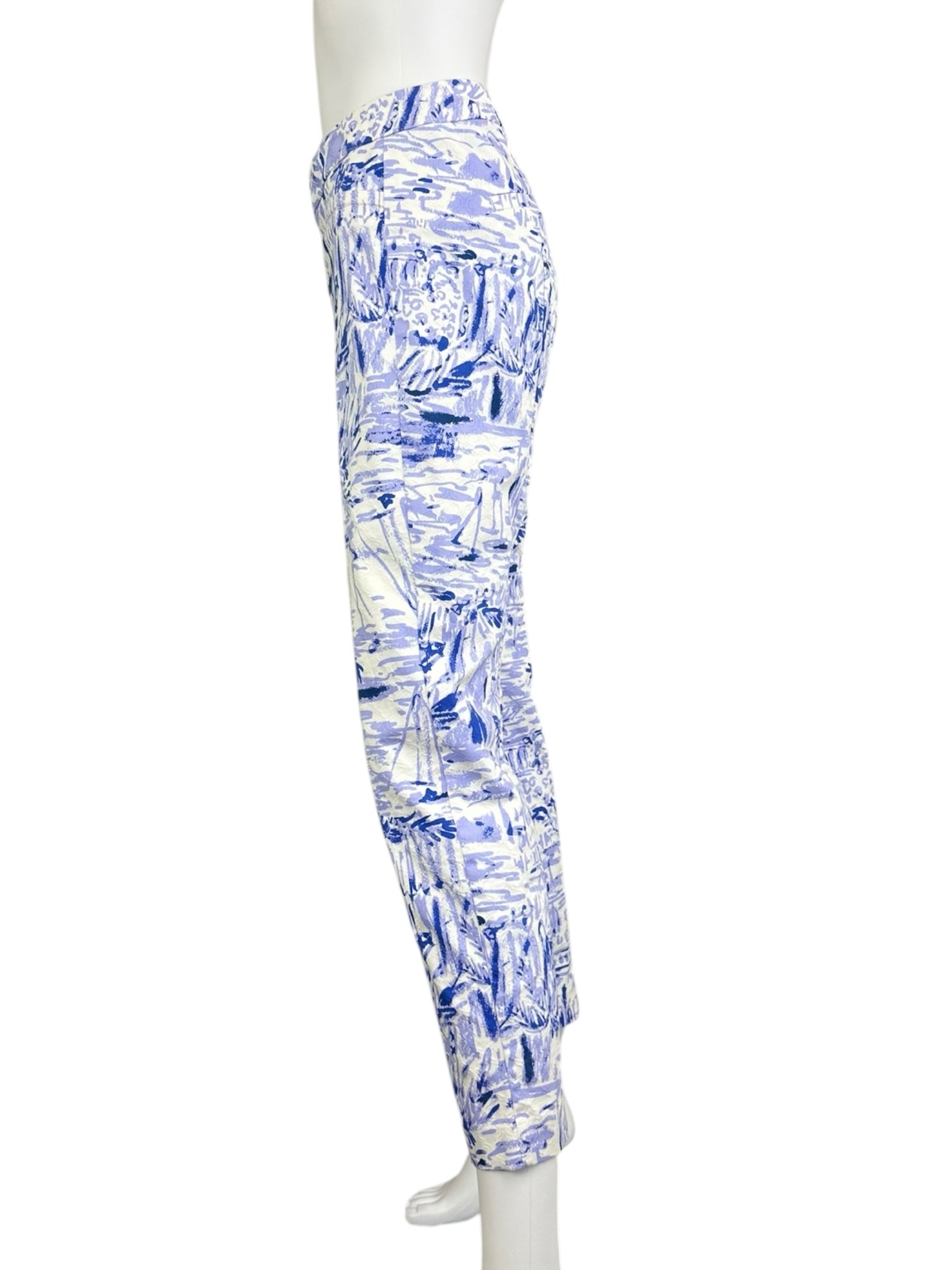 Purple white blue printed pattern straight leg button/zip closure and pockets.