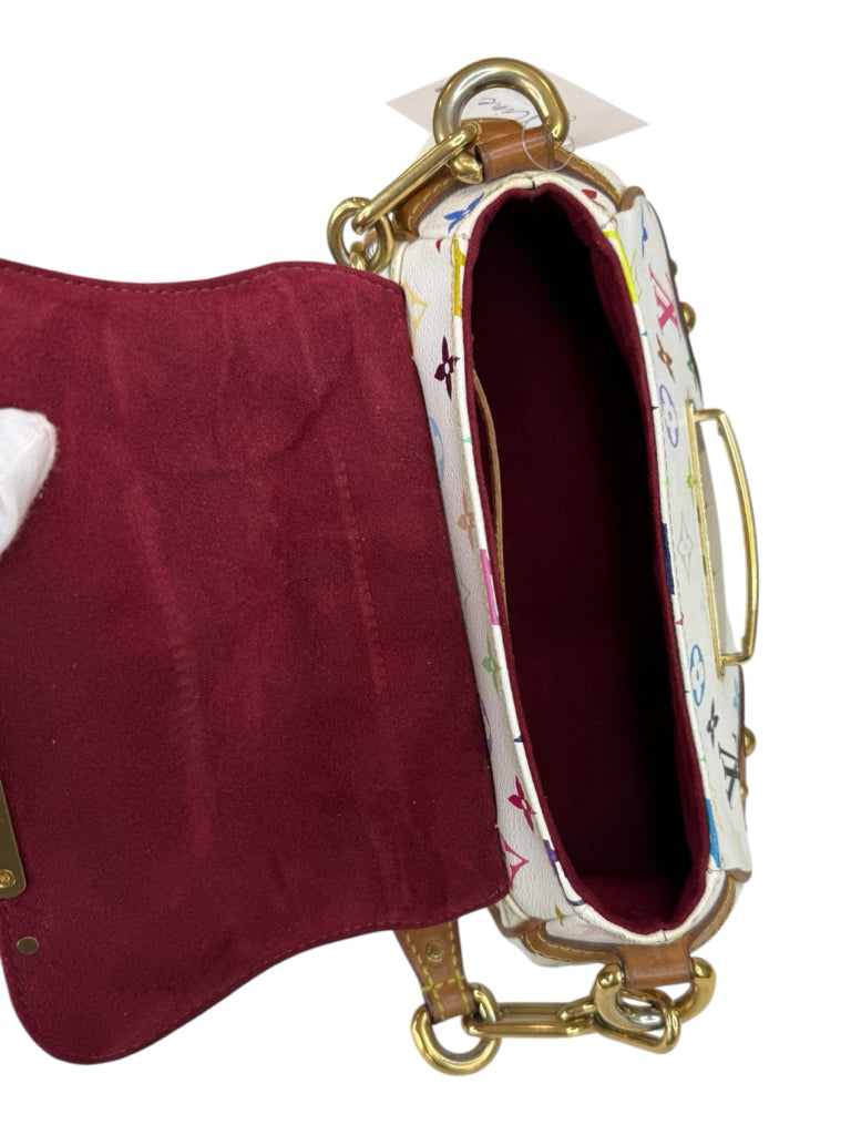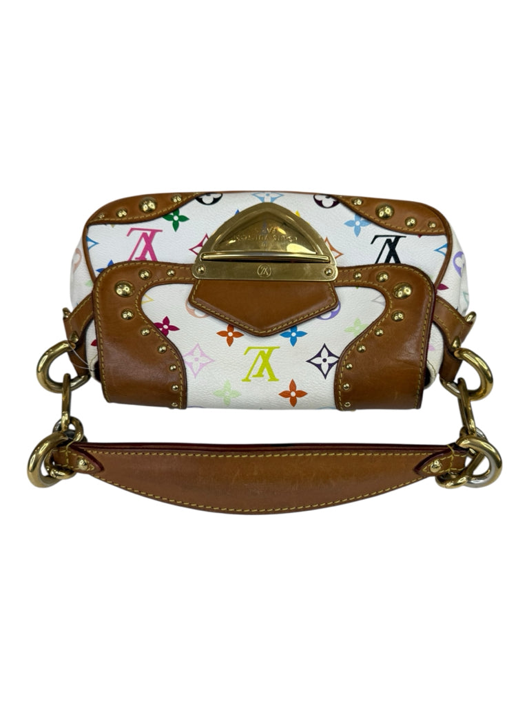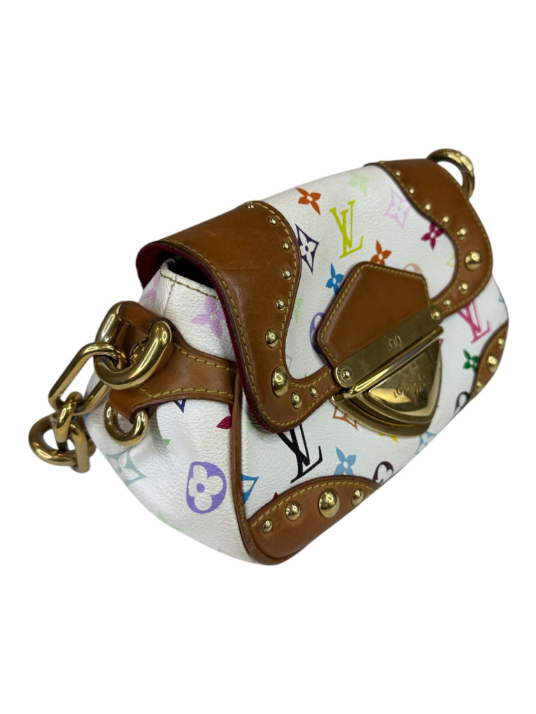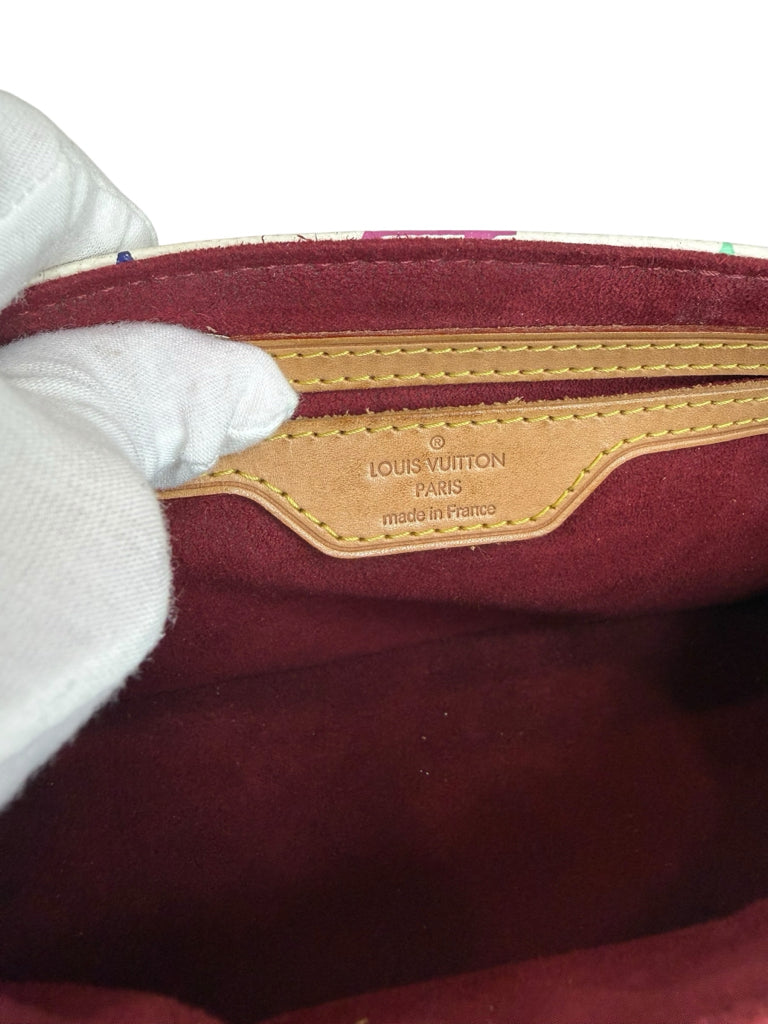 Louis Vuitton Monogram Multi-color Marilyn shoulder bag in white leather with canvas with natural cowhide leather trim. This bag is a limited edition piece from the iconic collaboration between the French fashion house and Japanese artist Takashi Murakami. Purse features gold tone brass hardware including decorative studs and a prominent logo-engraved push-lock closure. The interior features a single slip pocket. Purse comes with two dust bags as pictured. Purse is in immaculate pre-loved condition with only signs of wear to bottom and sides of purse as pictured and scratches to brass as pictured. No attempt has been made to clean. Measurements are 9.1 x 5.1 x 3.5.
