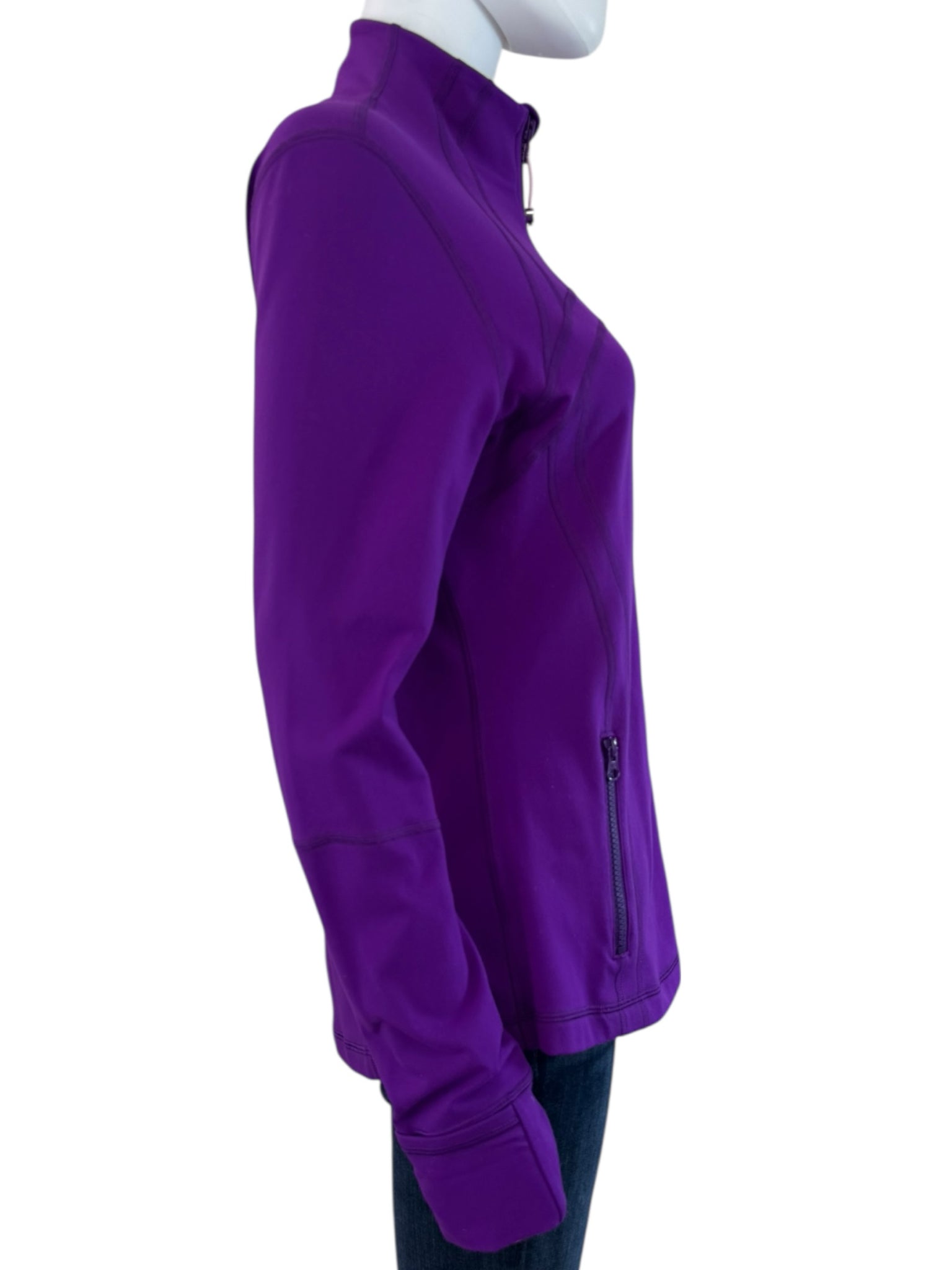 Power purple align jacket with a mock neck, long sleeves with thumb holes, front zipper pockets and a full zipper front closure.