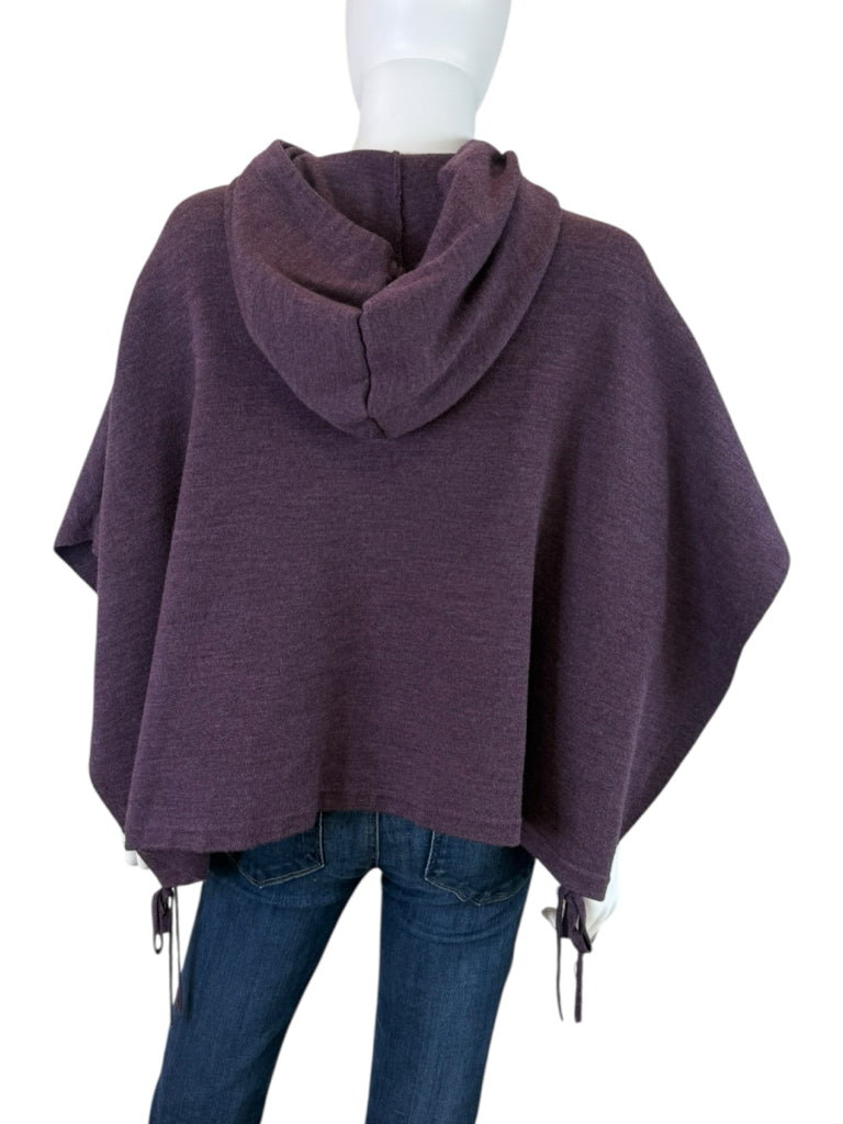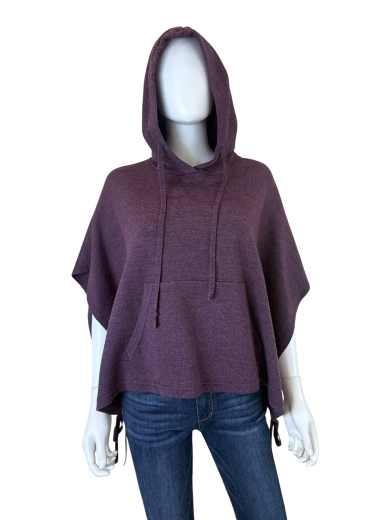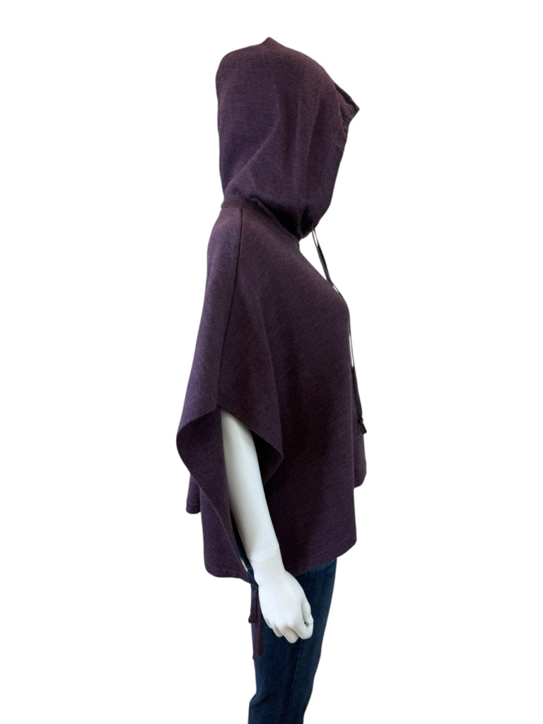Purple 100% merino wool short sleeve poncho with adjustable tie closure at hood, front kangaroo pocket and ties at sides.
