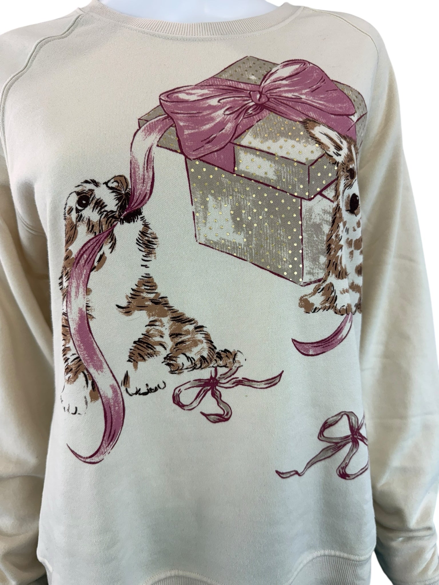 New with tags! Cream long sleeve crewneck featuring a dog, present, and bow graphic design.