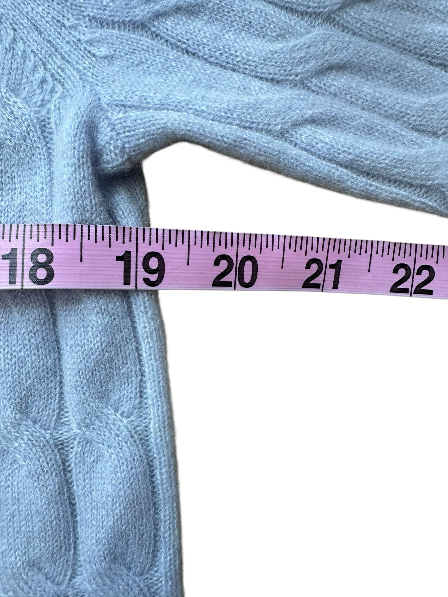 New with tags! 100% cashmere light blue cable knit sweater cardigan with long sleeves and a pearl button front closure.