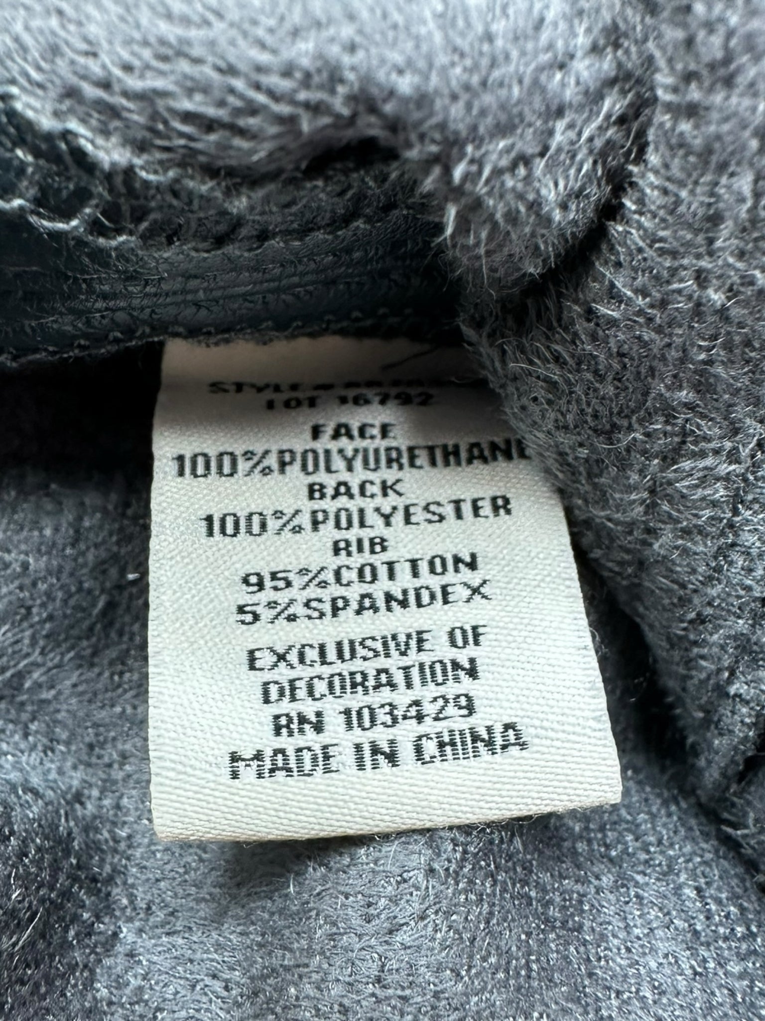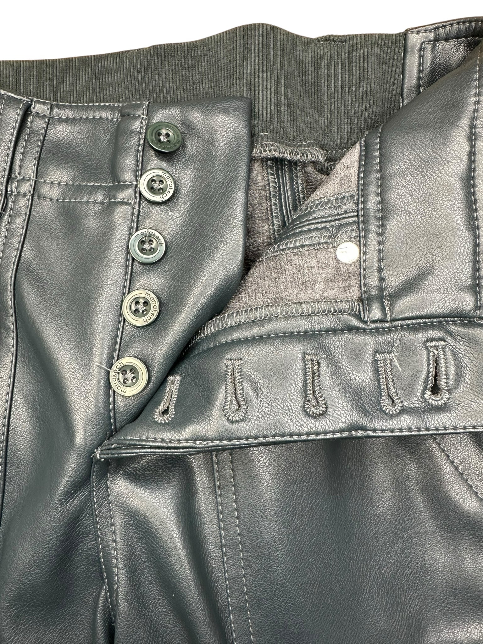 Dark blue vegan leather joggers, cuffed bottom and 5 button down.