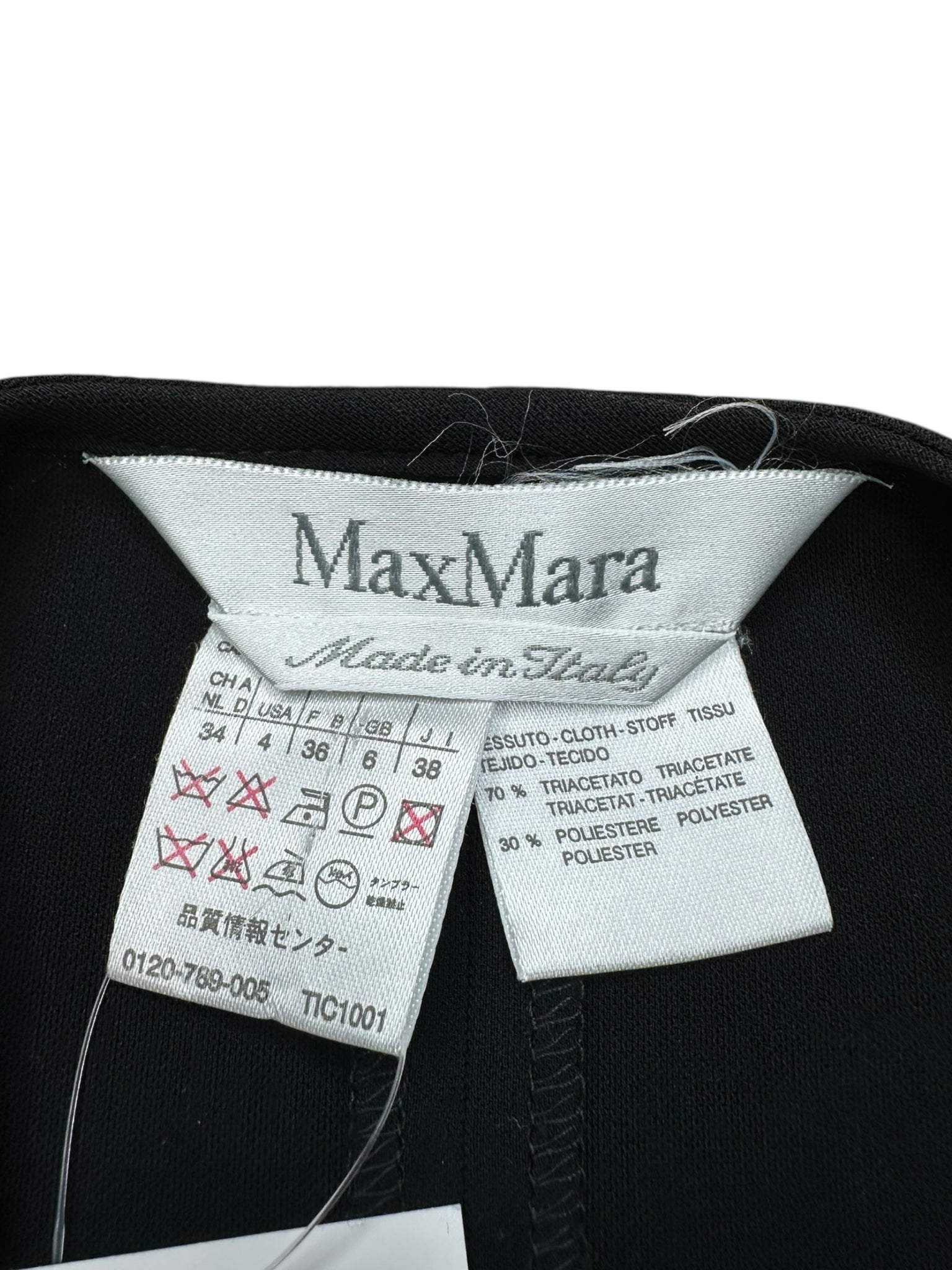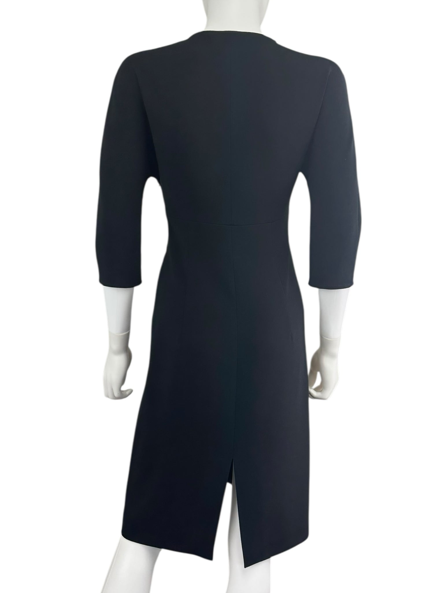 Black stretch knit midi cocktail dress with 3/4 length sleeves and a plunging neckline with twist design.