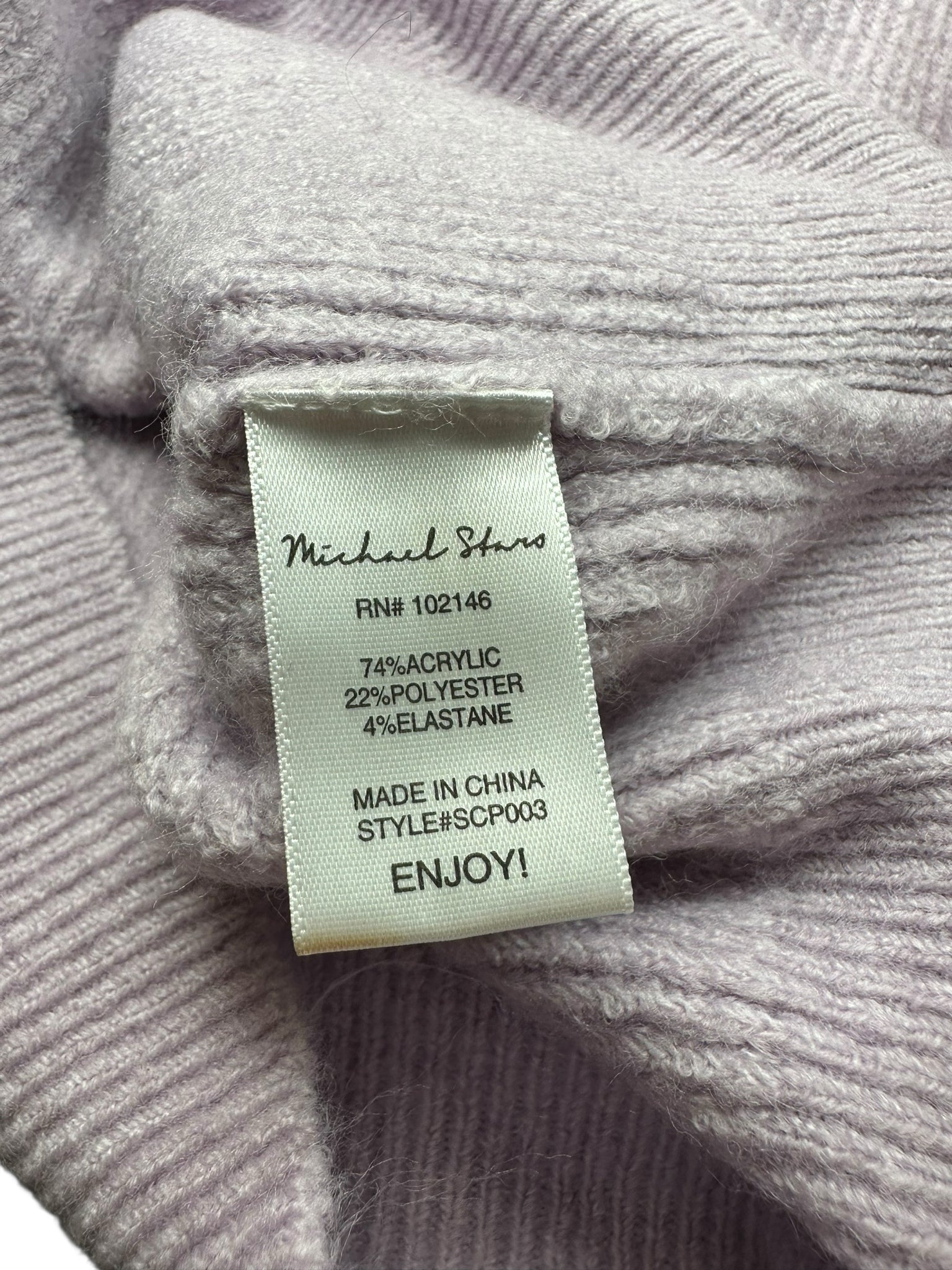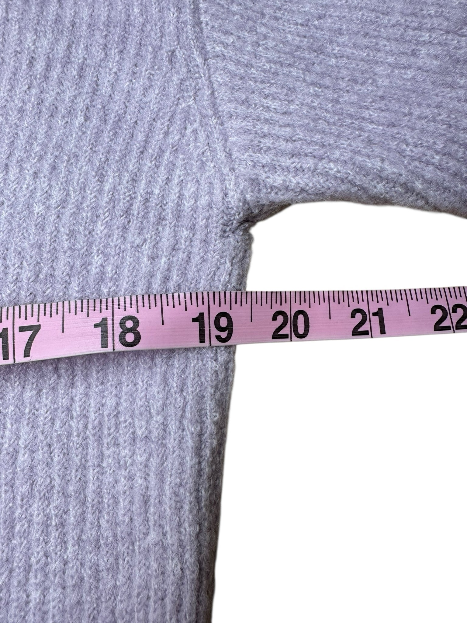 Long sleeve lilac knit sweater with a V-neck and collared neckline.