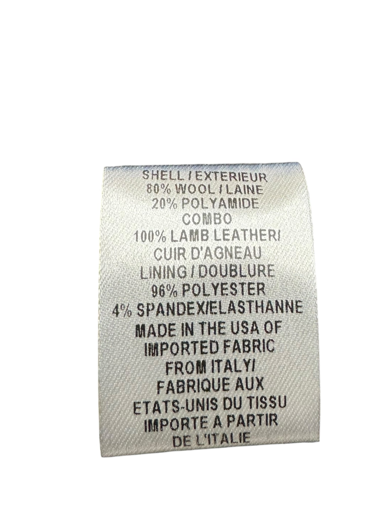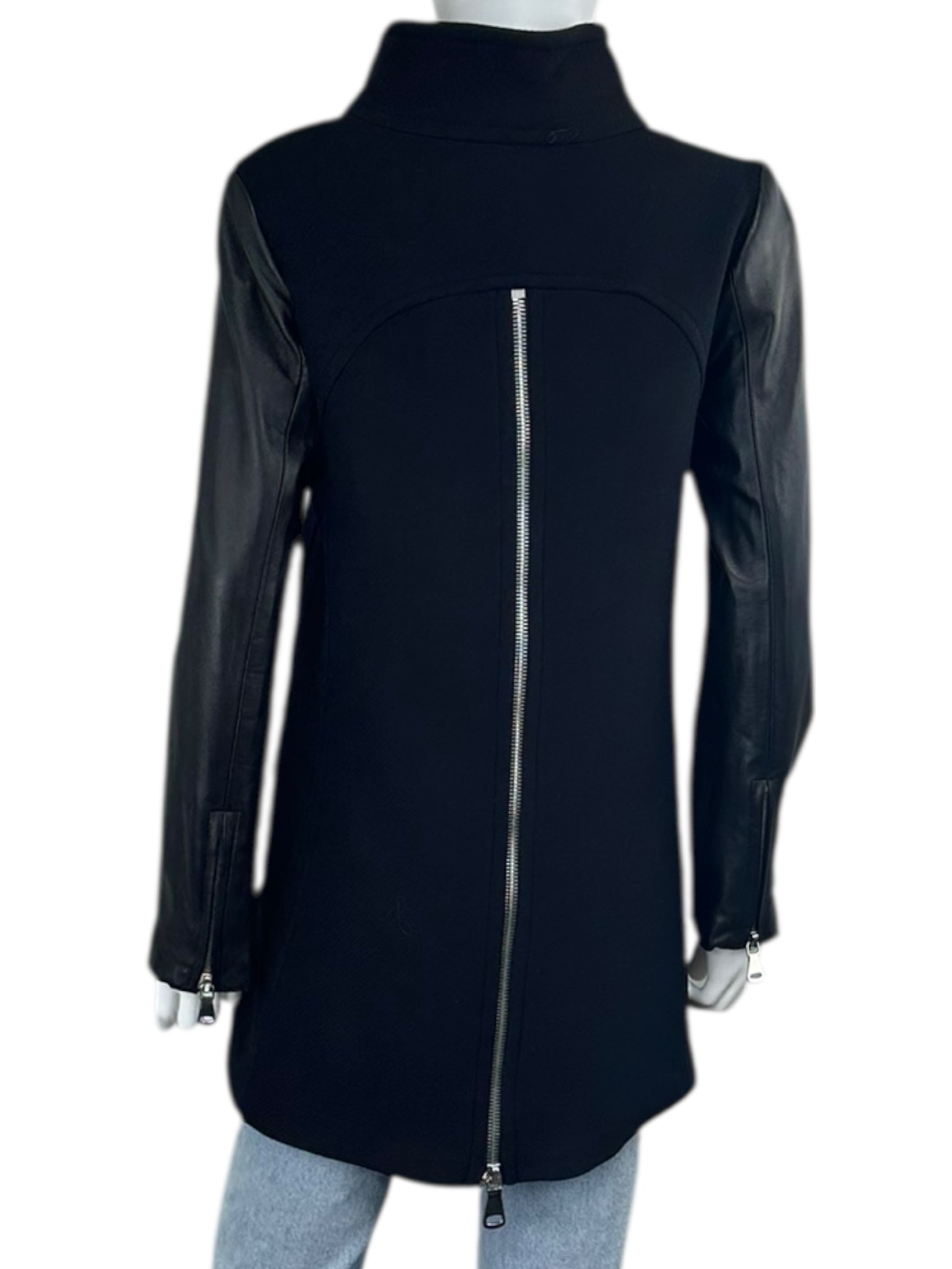Black wool blend coat with genuine leather sleeves, front zipper closure pockets and a front zipper and snap closure.