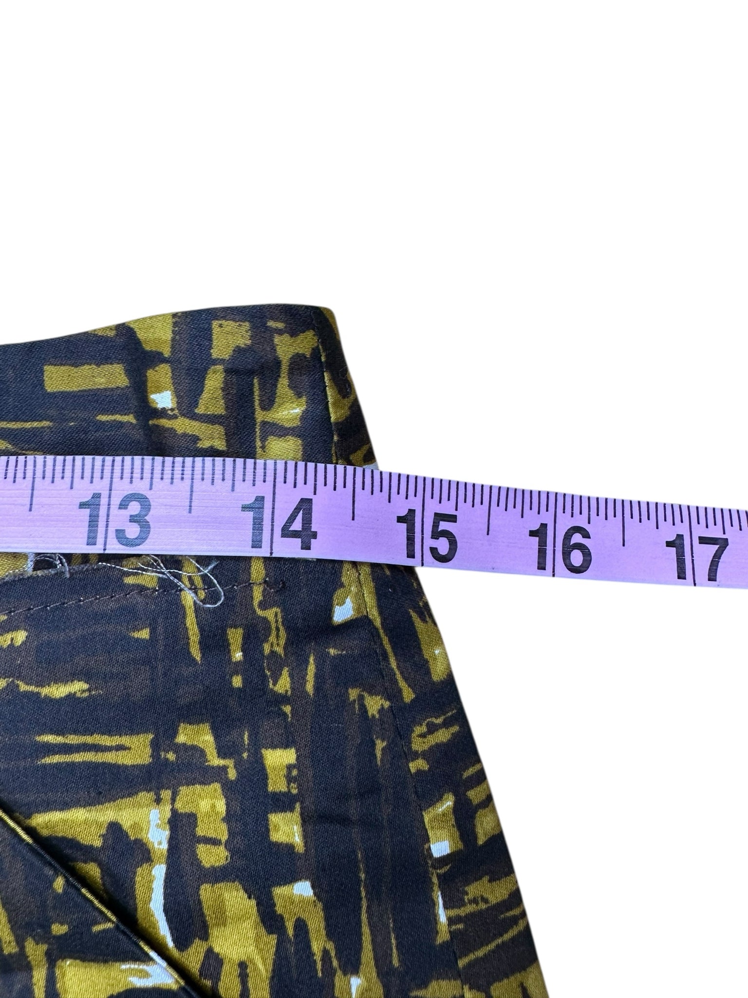 New With Tags! 'raw edge pencil' midi skirt with a bold abstract geometric print in mustard yellow and black, giving it a modern, artistic feel. It has a clean, structured silhouette in a lightweight fabric, perfect for pairing with a simple top to let th