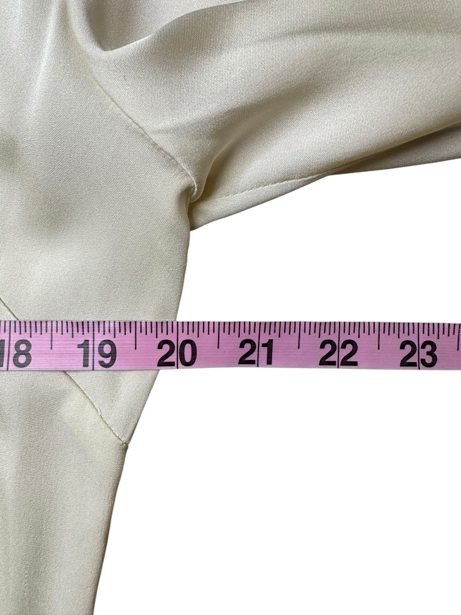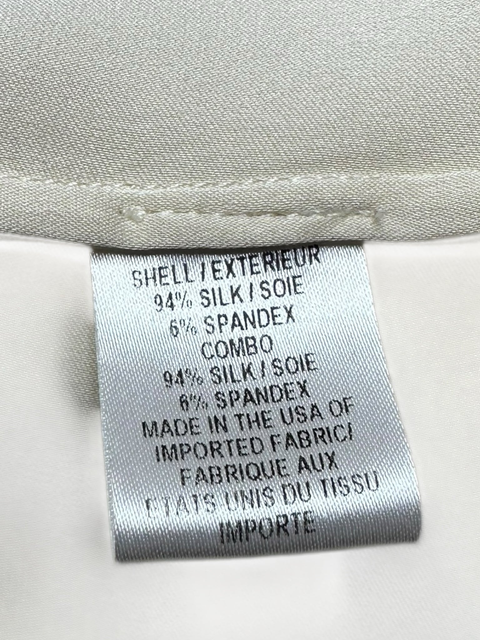Lightweight cream silk blend collared blouse with long button cuff sleeves and a front hidden button closure.
