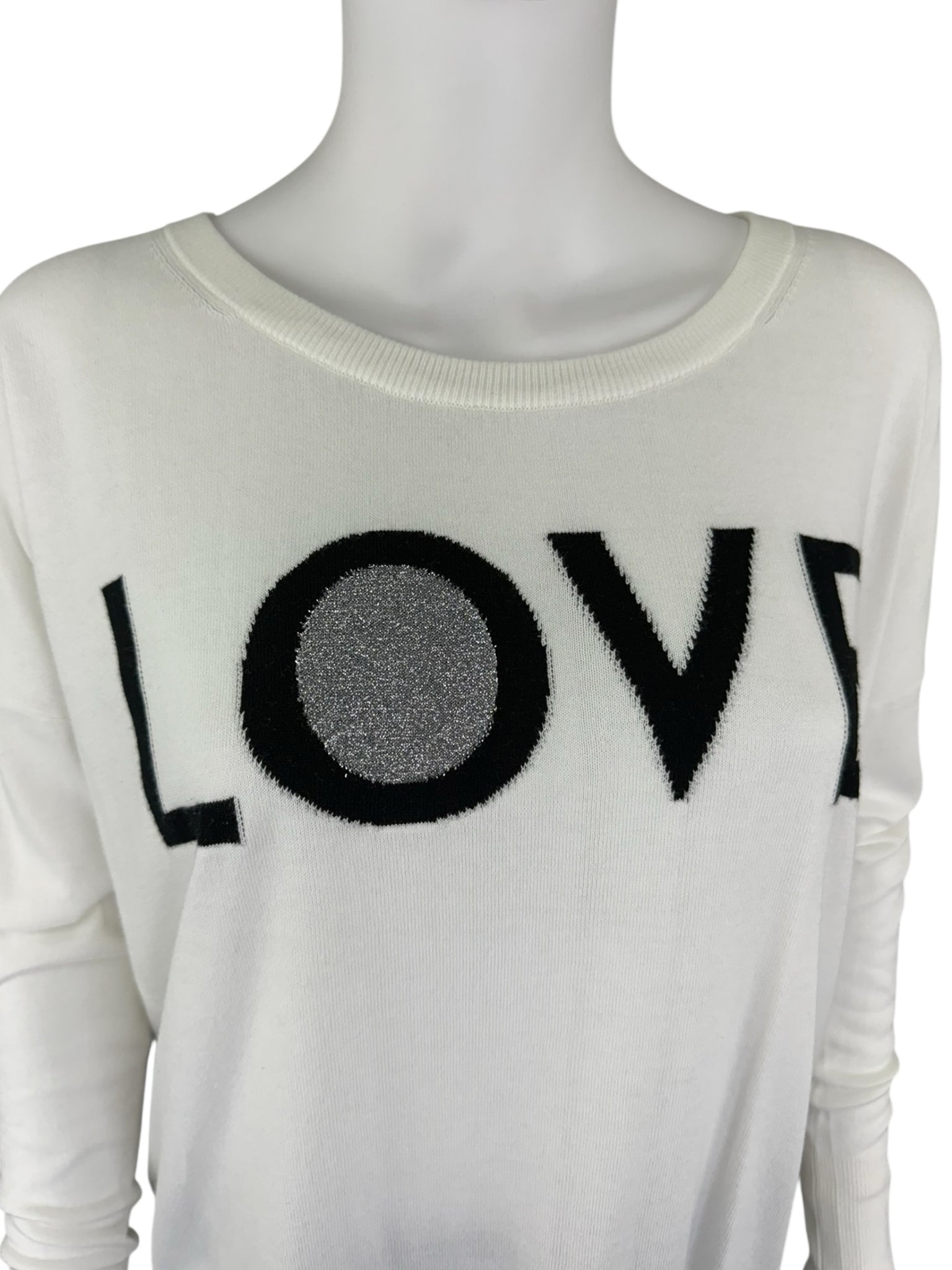 White long sleeved cotton blend sweater with LOVE graphic front.