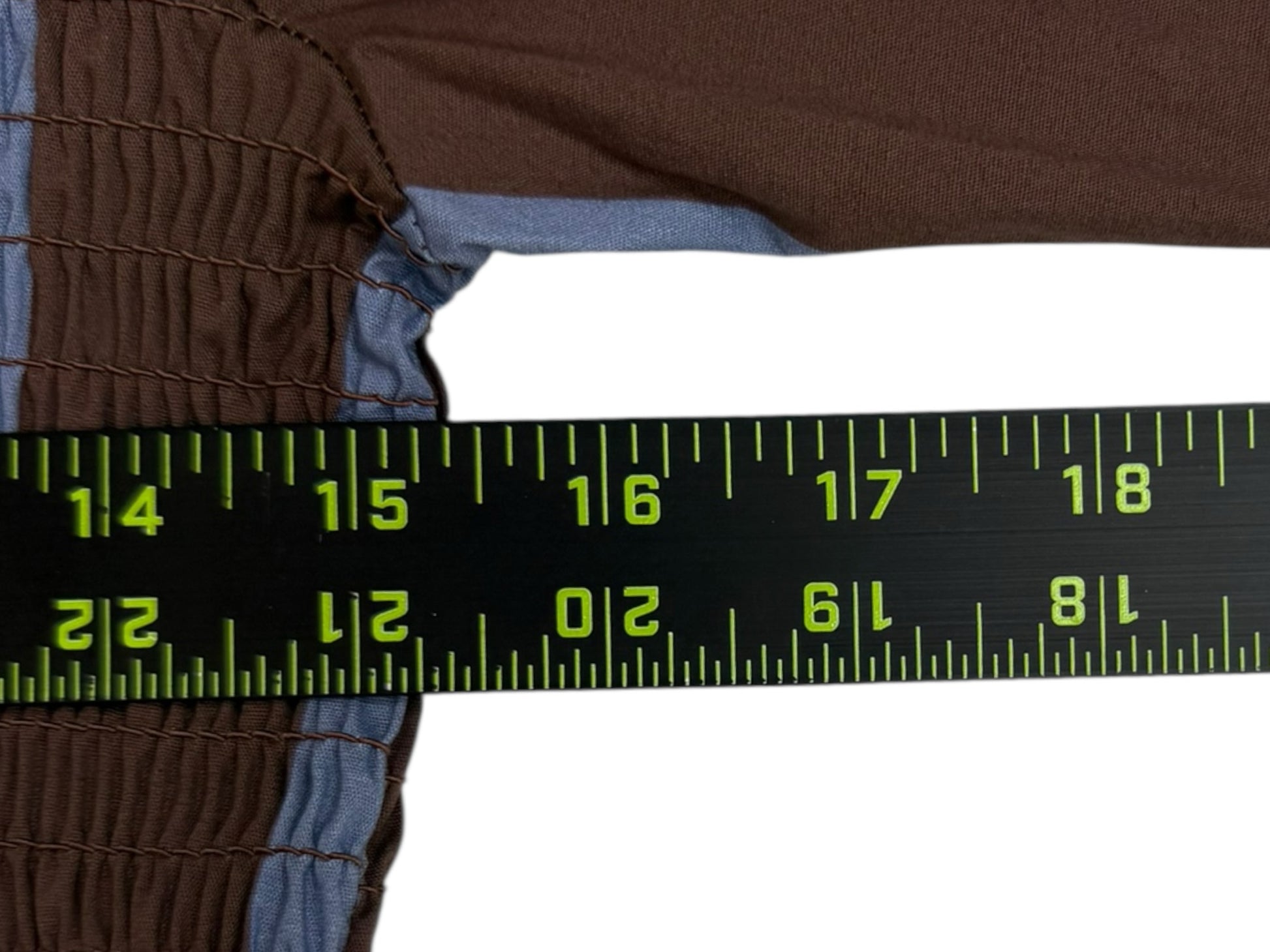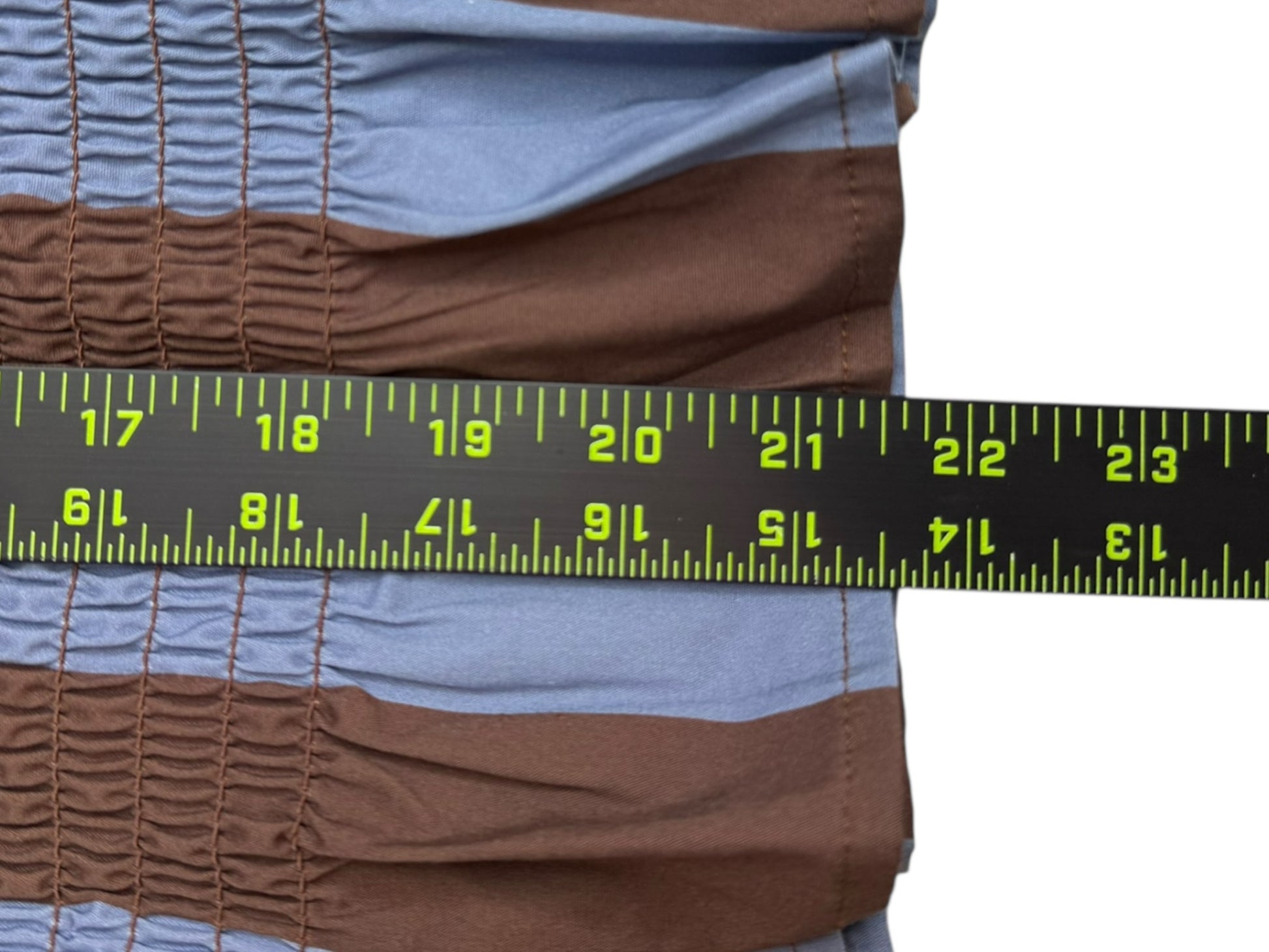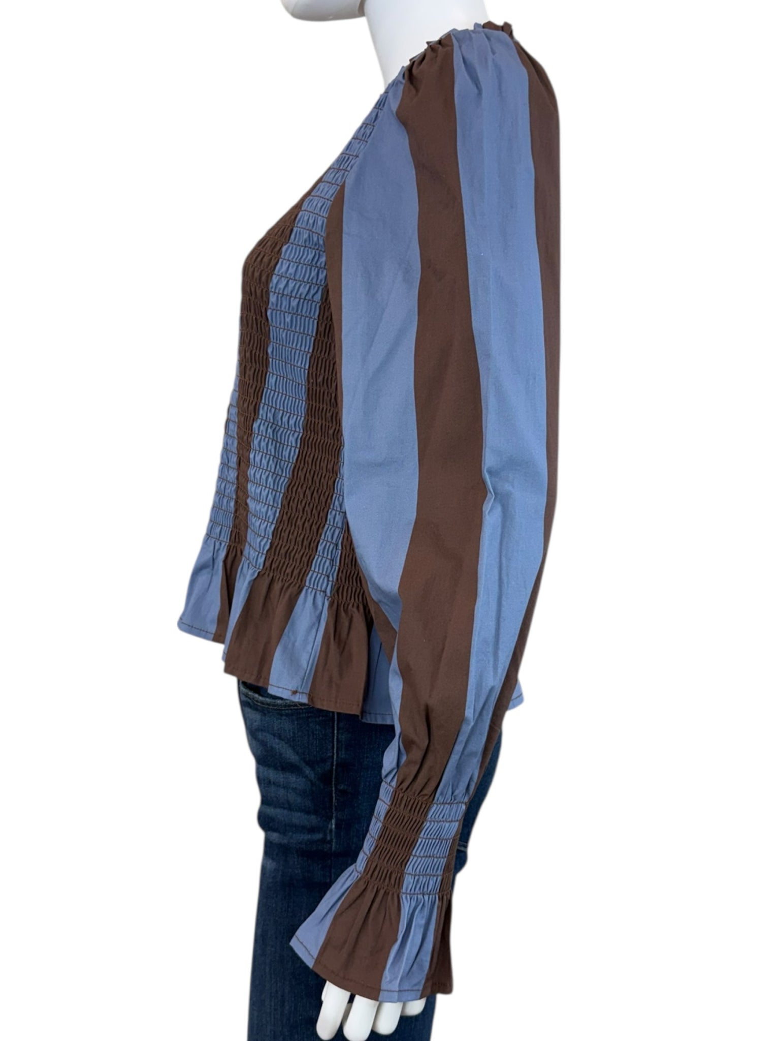 New with tags! Blue and brown striped cotton blend smocked top with long sleeves and a ruffle trim.