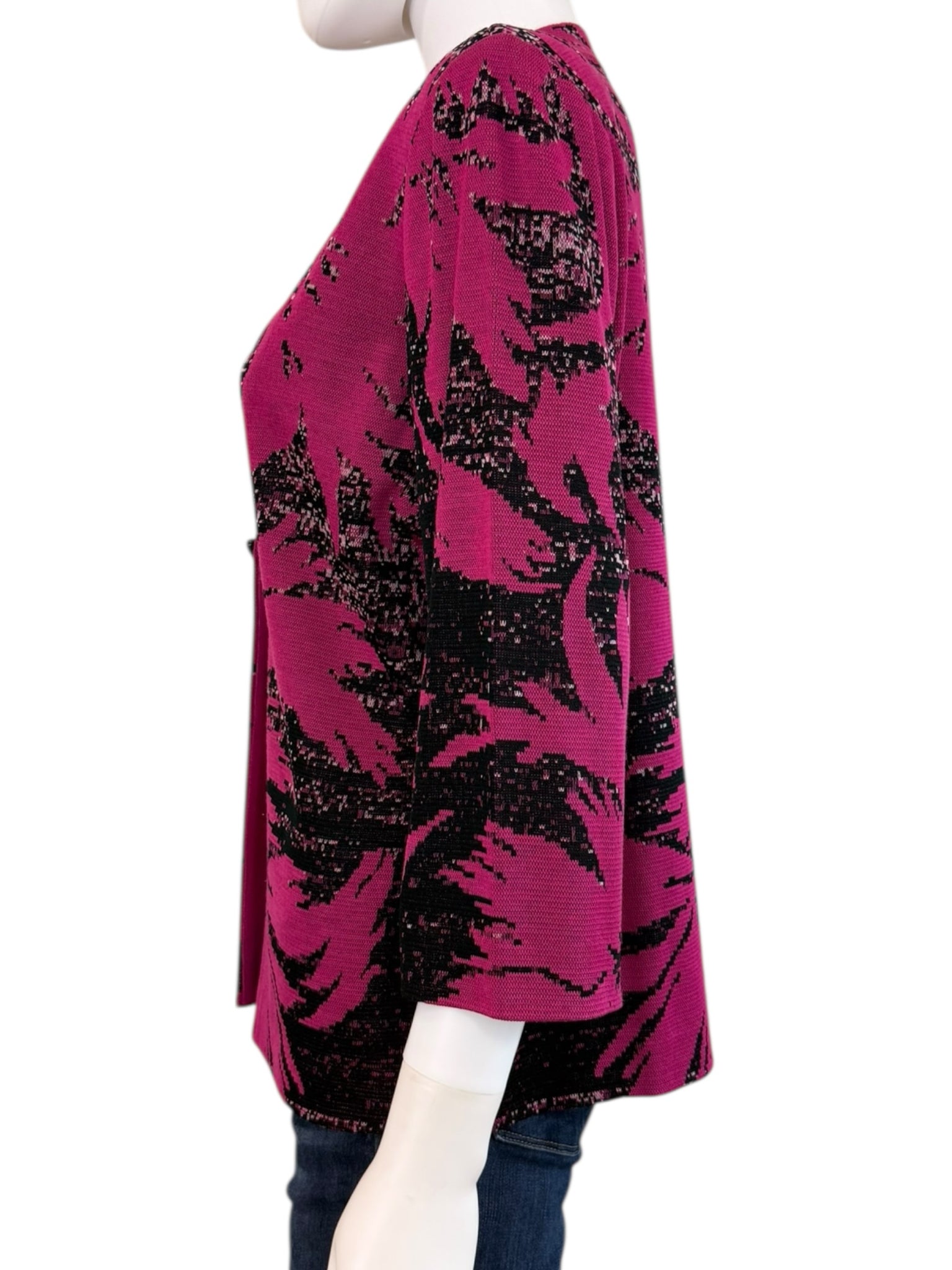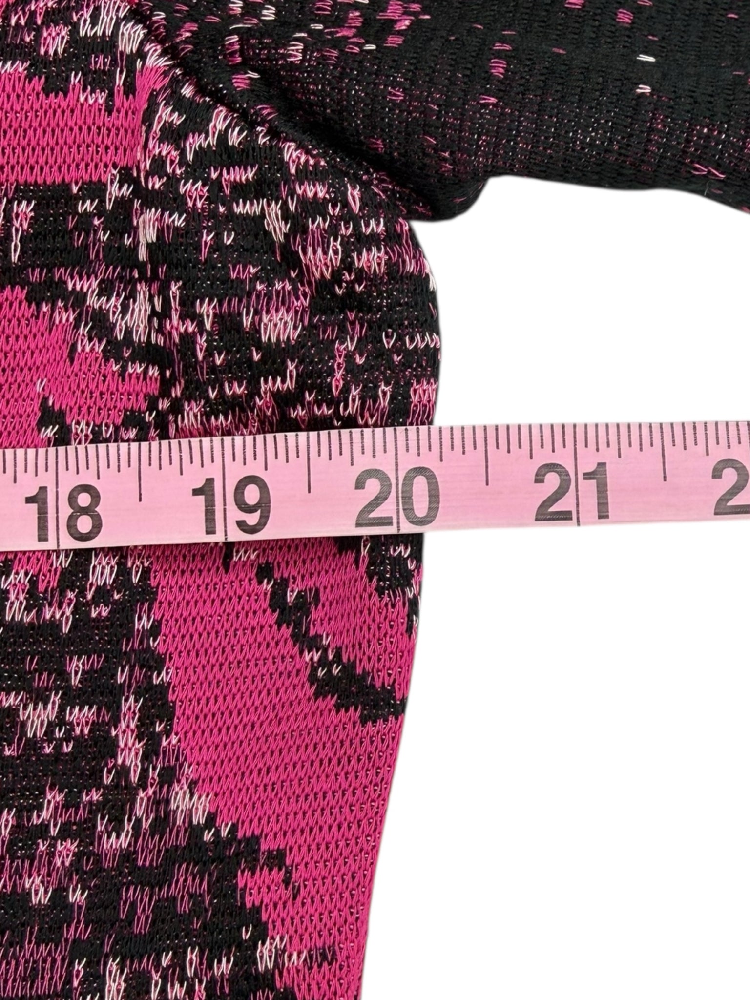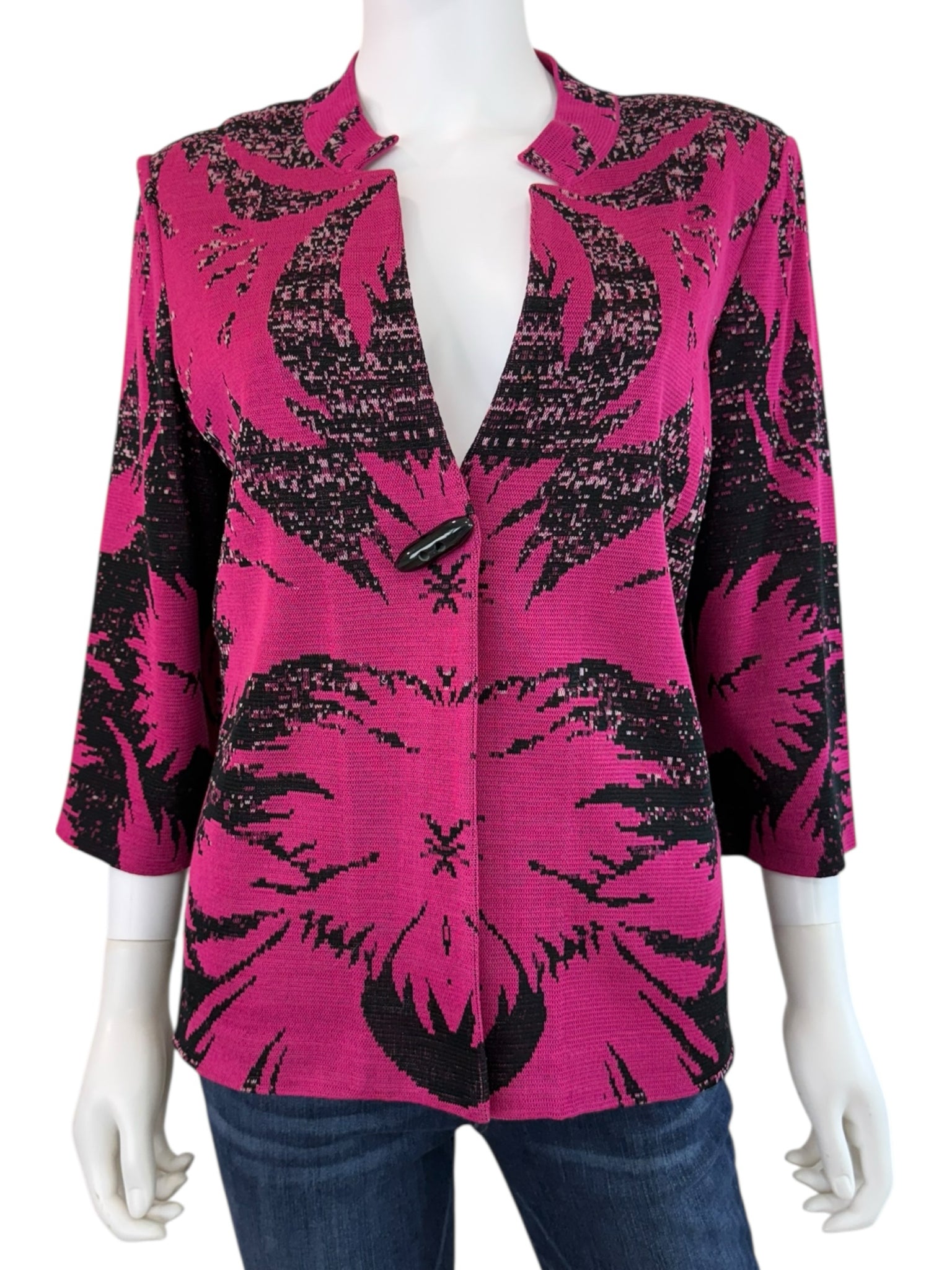 Black and pink thin knit dress jacket with long cropped sleeves, a pink and black abstract pattern, a V-neck neckline, and a singular horn button closure.