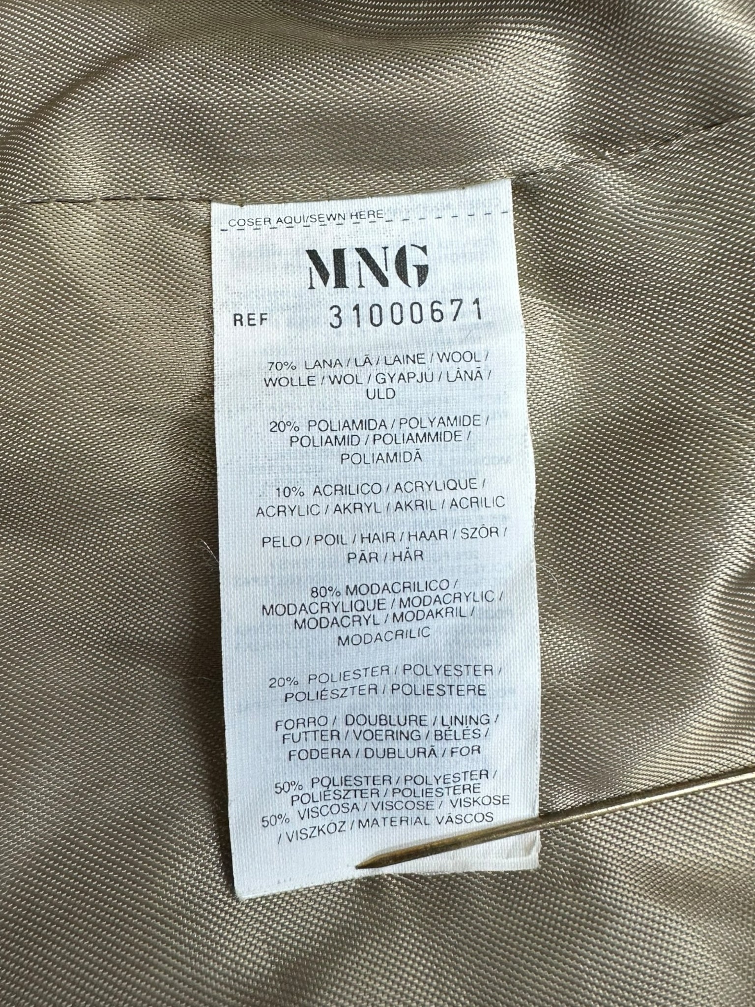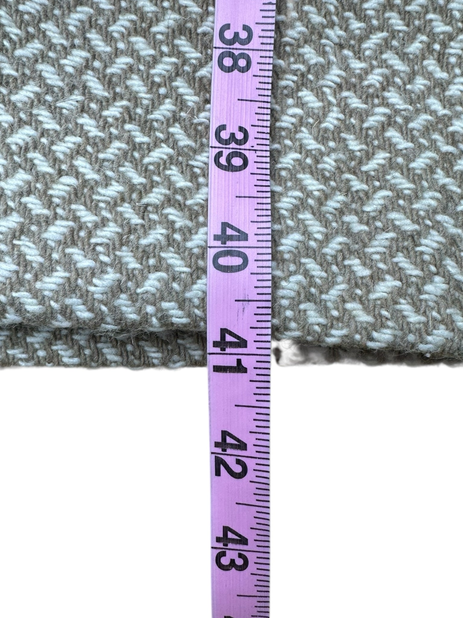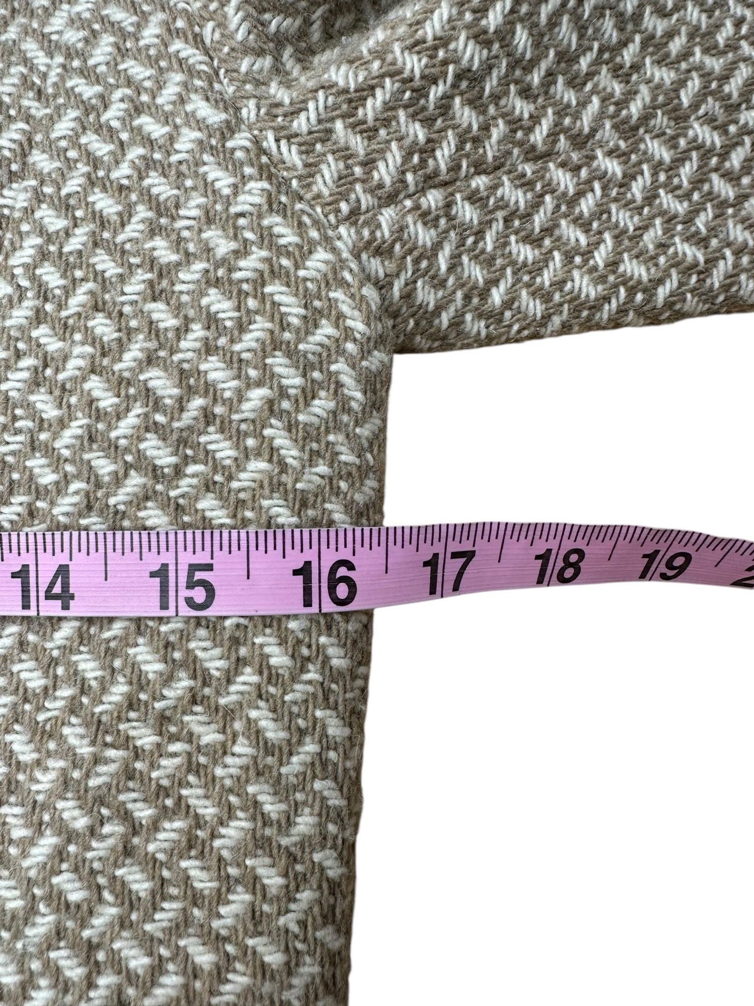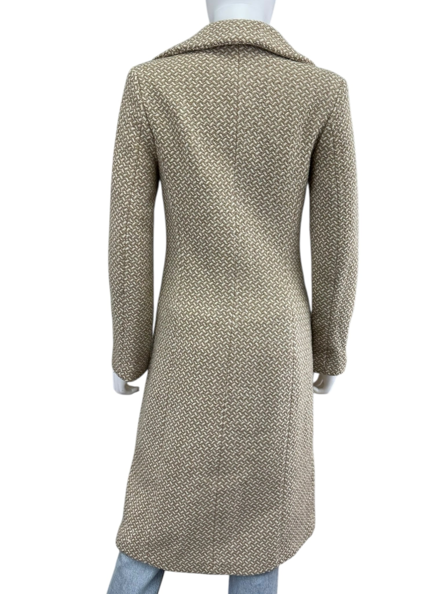 Tan and white patterned wool notched collar trench coat with long sleeves, front pockets and front hook closure. Coat is lined and made from a wool blend fabric.