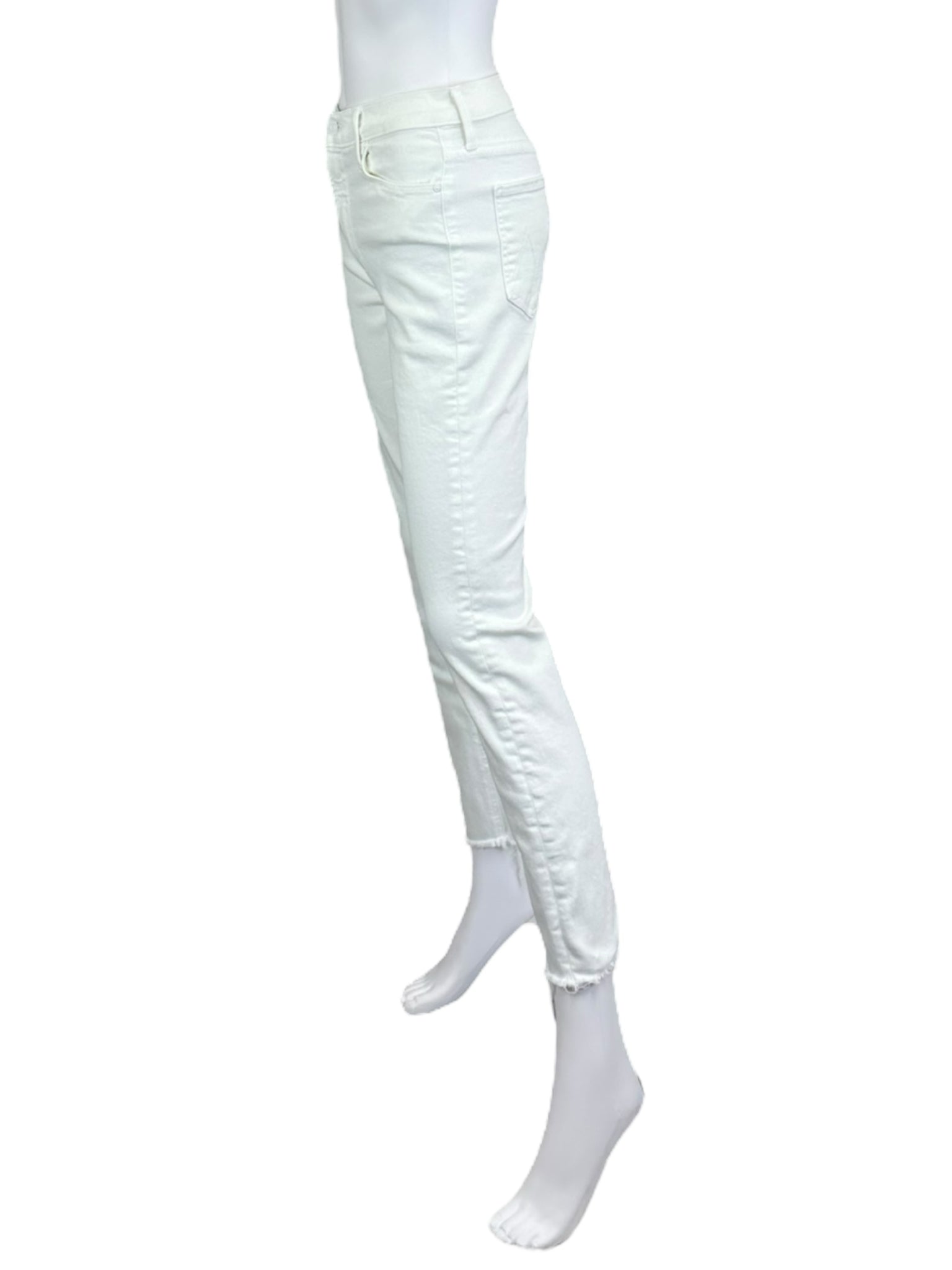 White slim fit mid rise jeans with cropped frayed ankles and five pockets with zipper/button closure in front.
